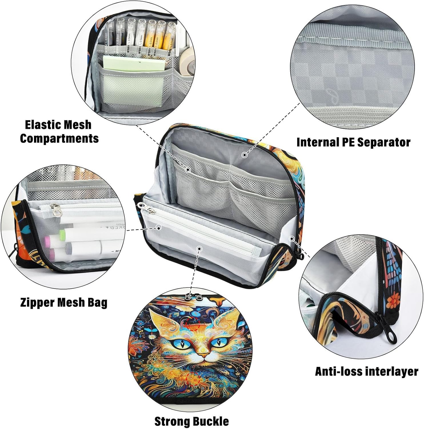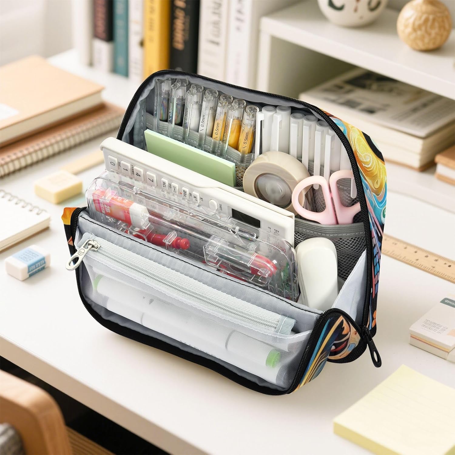 Design unico in piedi: gli astucci si aprono completamente e stanno in piedi tramite bottoni magnetici. Visualizza facilmente i contenuti a colpo d'occhio sulla tua scrivania, risparmiando ricerche frenetiche durante sessioni di studio o attività di lavoro. Recupero degli oggetti senza sforzo: astuccio con scomparti dedicati (rete principale, con cerniera, tasca aperta) non significa più frugare. Trova istantaneamente il tuo evidenziatore, unità USB o balsamo per le labbra, ovunque tu sia. Costruito resistente con tassello in nylon: astuccio realizzato in nylon 100% poliestere di alta qualità e cerniere resistenti. Resiste alla vita quotidiana di studenti/pendolari, resiste all'abrasione ed è semplice da lavare a mano. Multifunzione: non si tratta di un astuccio, ma può anche essere utilizzato per altri scopi. Come una penna, una matita o un astuccio per pennelli, una borsa per il trucco, un ufficio personale e una custodia per forniture Come regalo: l'astuccio organizer può anche essere regalato come regalo per amici. I genitori potrebbero regalarlo ai bambini come regalo di compleanno o regalo di Natale. Gli insegnanti potrebbero regalarlo agli studenti come regalo di laurea o premio.