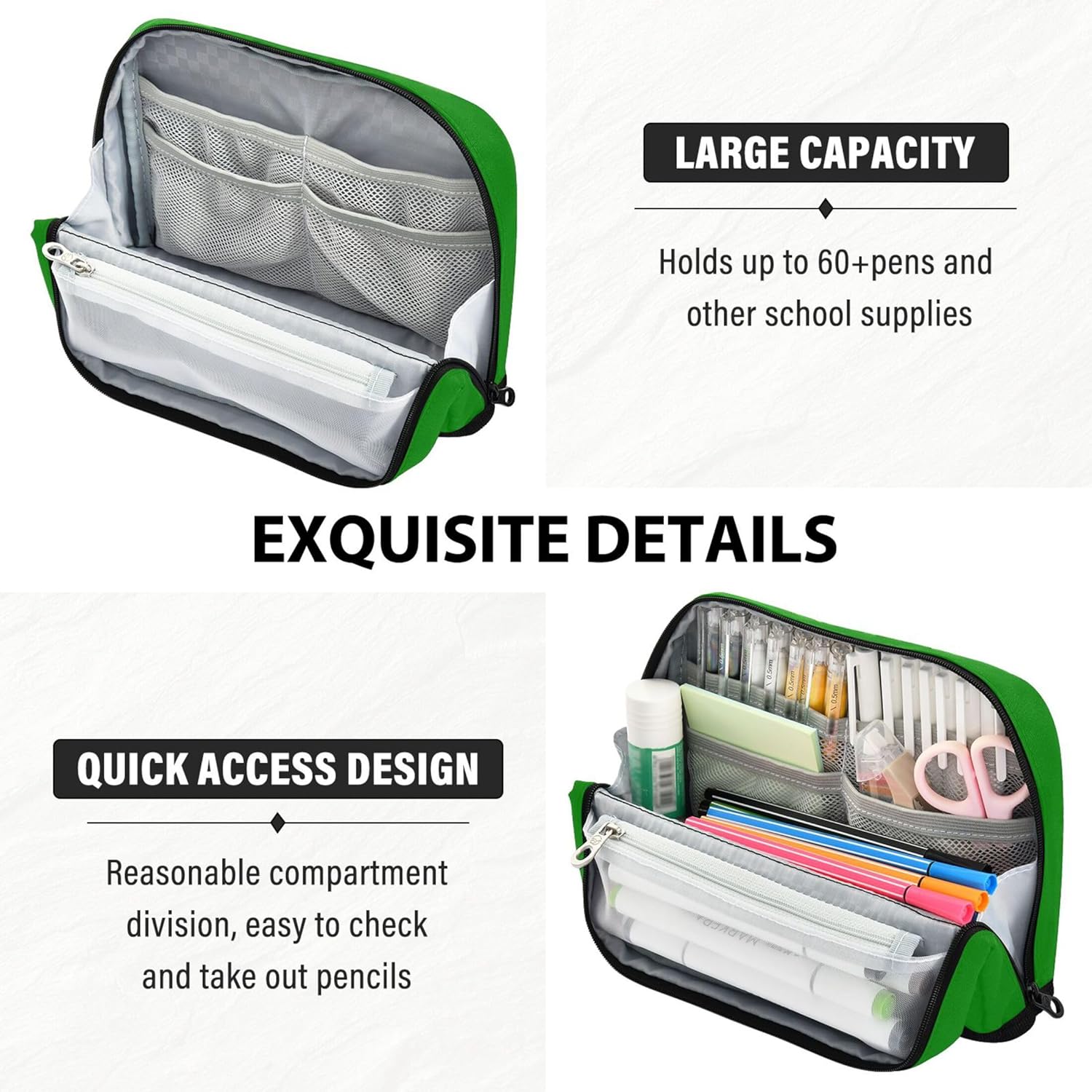 Funzione di supporto convertibile: con un intelligente sistema pieghevole e a scatto, l'astuccio portapenne si trova in posizione verticale sulla scrivania, consentendo di organizzare e accedere ai tuoi oggetti senza problemi Progettato per la resistenza: dai banchi di scuola alle borse da viaggio, l'astuccio estetico resiste all'attrito e allo sporco, con nylon a trama fitta che fornisce affidabilità a lungo termine Layout intelligente per riporre: tieni le tue forniture in ordine: l'astuccio da ufficio include uno scomparto principale, una tasca in rete con cerniera e uno slot aperto per separare e accedere agli oggetti con facilità Flessibile per diverse esigenze: l'astuccio per ragazze adolescenti funge da molto più di un semplice astuccio: riutilizzalo come kit per il trucco quotidiano, borsa da viaggio o pratico contenitore da scrivania Unico tuo: design vivaci ed elementi personalizzati trasformano l'astuccio da ufficio in un regalo elegante e significativo, ideale per bambini, scrittori o chiunque ami un tocco personale
