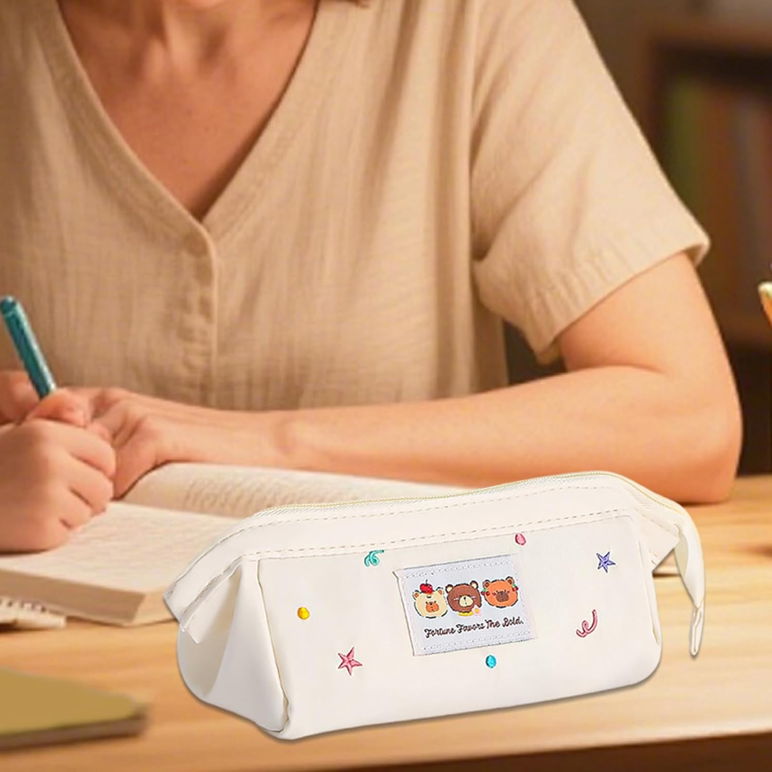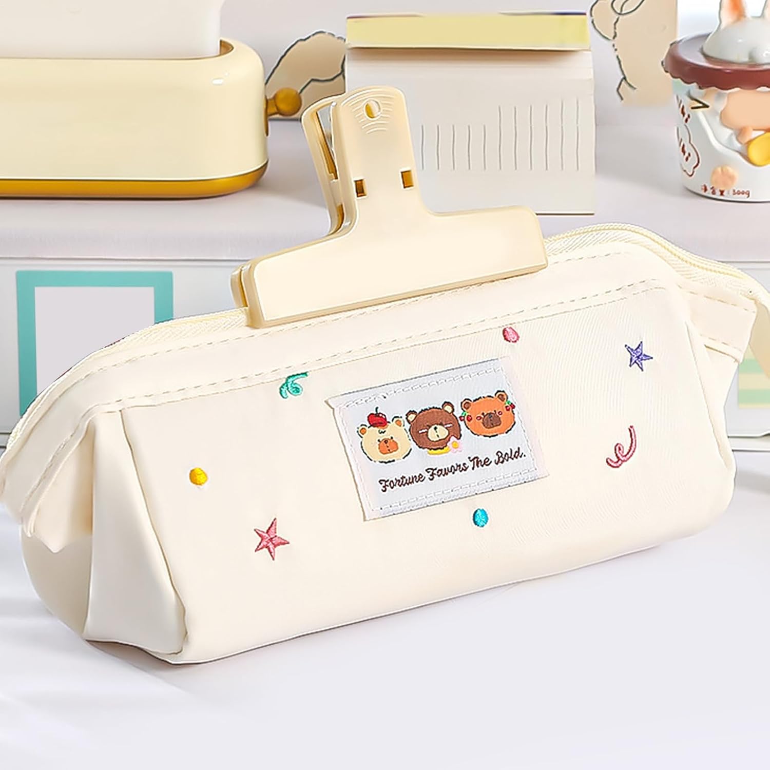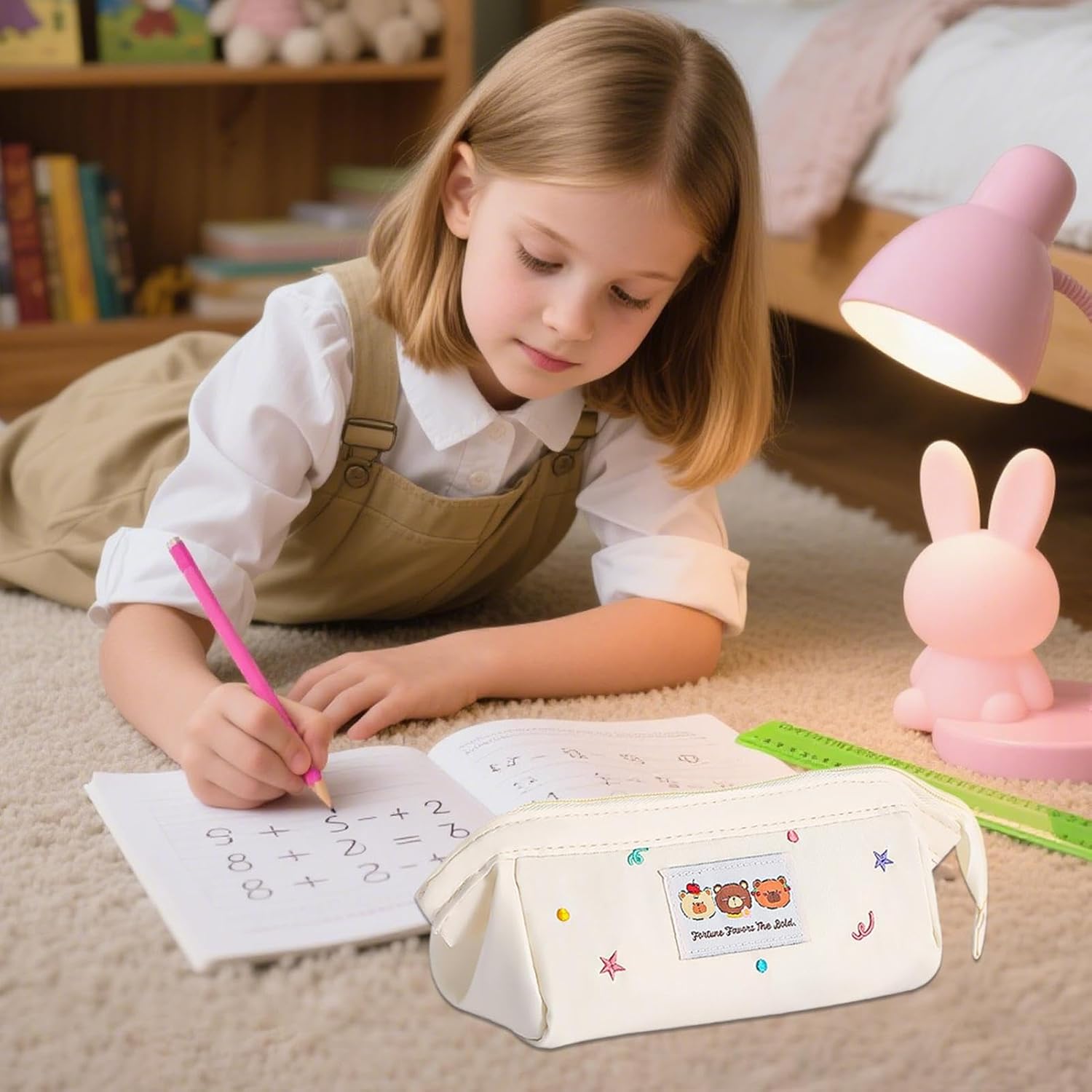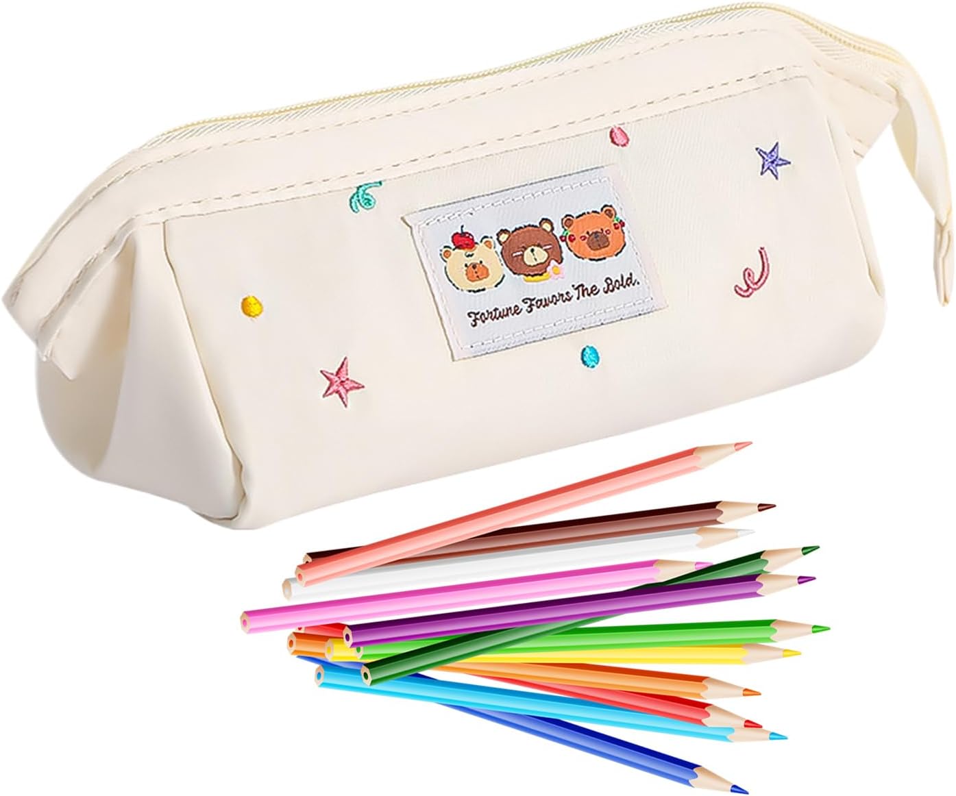 Soluzione Intelligente: Design pratico con strati imbottiti e portapenne elastici per accesso facilitato agli articoli, affiancati da tasche a rete per organizzazione ottimizzata Regalo Premuroso: Portamatite realizzato con cura, scelta versatile come regalo pratico per scuola, o estetico o sopresa pensata. per occasioni come la ripresa scolastica con design adorabile e funzionalità organizzativa quotidiana o Fotogenico: Questo portamatite con tavolozza di colori tenui è un o da scrivania elegante. Realizzato in resistente tela poliestere, include una cerniera scorrevole per un accesso facile e pratico. Soluzione Multifunzione: Contiene fino a 40 penne e , funzionando come astuccio da viaggio o organizer per pennelli trucco grazie al design capiente che ottimizza lo spazio per necessità diverse o Giocoso ed Elegante: La trousse con ricamo evidenzia orsetti stellati su tessuto canvas distintivo, creando un o giocoso e alla moda che cattura il fascino 'ispirazione creativa e speciale o stile Harajuku