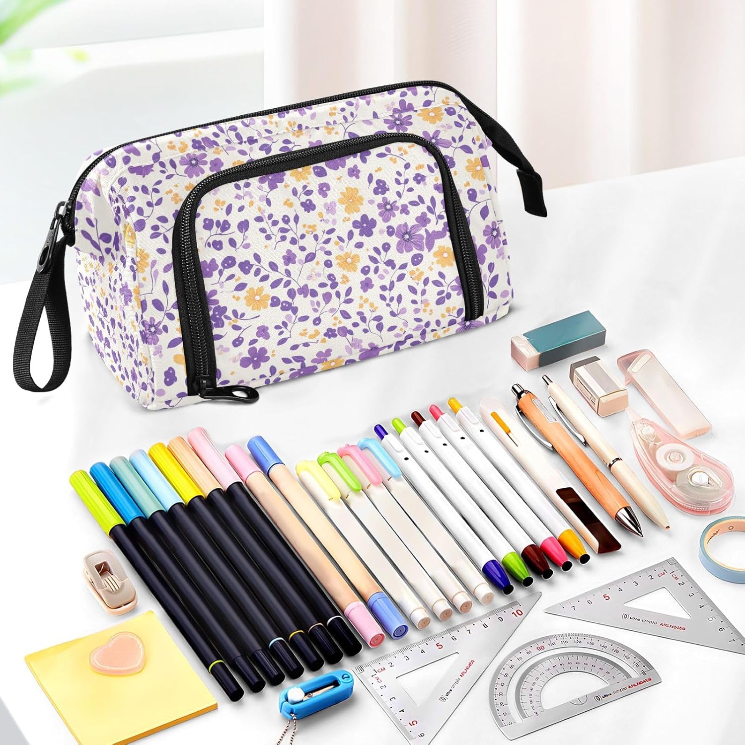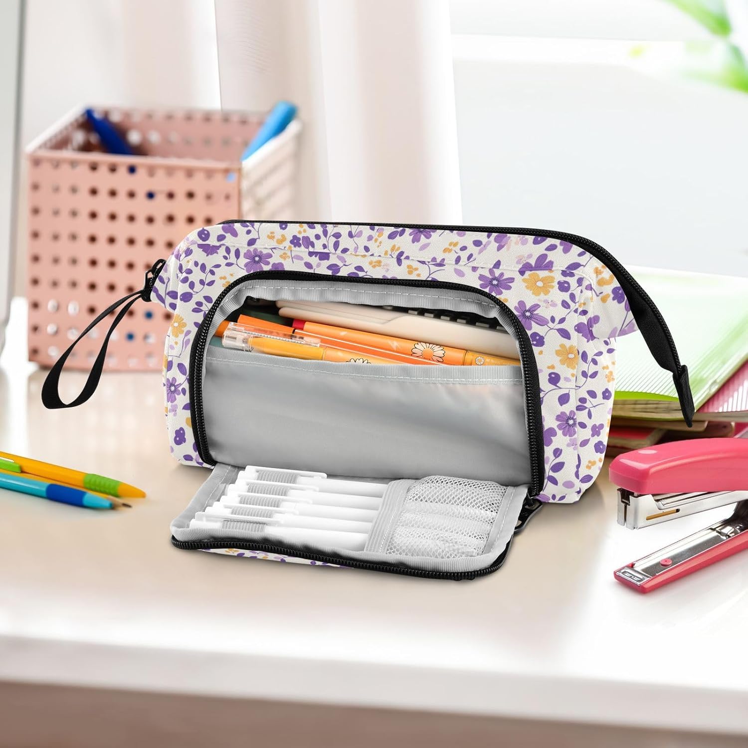 Materiale resistente: il nostro grande astuccio è realizzato in nylon di alta qualità e cerniera liscia, che lo rende robusto, resistente all'usura, resistente ai graffi e facile da pulire. (Non adatto a bambini di età inferiore ai 3 anni!) Grande capacità: 24 x 9,5 x 15 cm (lunghezza x larghezza x altezza). L'organizer per matite dispone di una tasca principale spaziosa di grande capacità, che può contenere 40-60 matite, regole o quaderni. Due tasche interne possono contenere piccoli oggetti scolastici come gomme, nastri, foglietti adesivi e altre necessità. La tasca laterale esterna è dritta alla tasca principale e si attacca a 5 scomparti per matite, fissando le penne usate di frequente e organizzando ordinatamente le matite. Design portatile e conveniente: con peso leggero, corpo piccolo e piegatura manuale, i nostri astucci sono facili da trasportare in borsa o tenere a portata di mano. L'apertura superiore e l'apertura laterale offrono scelte per voi per prendere o mettere le vostre necessità in esso. Puoi vedere chiaramente il tuo articolo dall'alto e trovare le tue penne, matite, pennarelli e pennelli usati di frequente dal lato. Multi funzioni: con una tasca frontale aggiuntiva e uno scomparto principale di grande capacità, il nostro prodotto non è solo un portapenne, ma una borsa, una borsa da viaggio, una borsa da trekking, una borsa per attrezzi, una borsa per cellulare, trucco, pittura, trucco, medicine, 3C, ecc. Istruzioni per la cura: si consiglia di lavare a mano; il lavaggio in lavatrice non è un'opzione. Non includere candeggina durante il lavaggio.