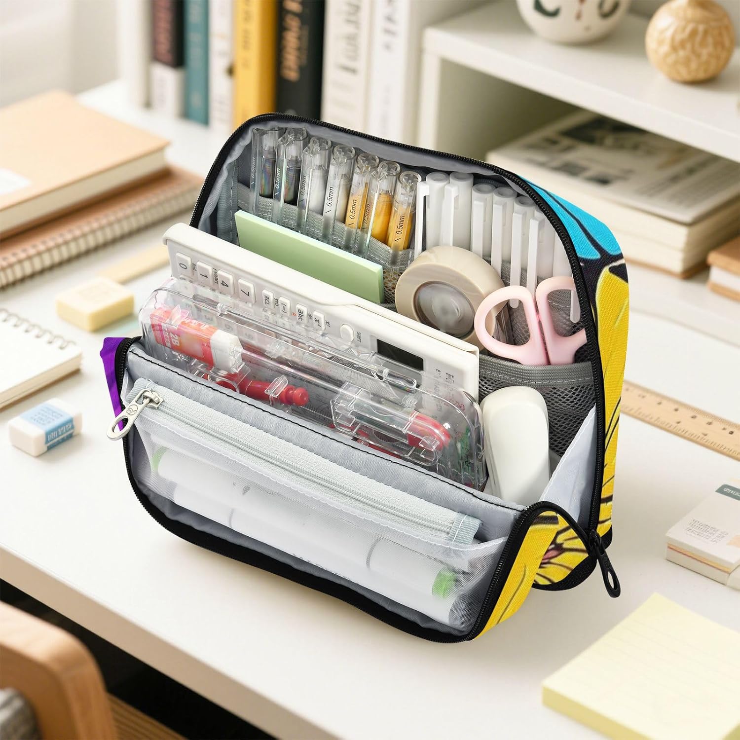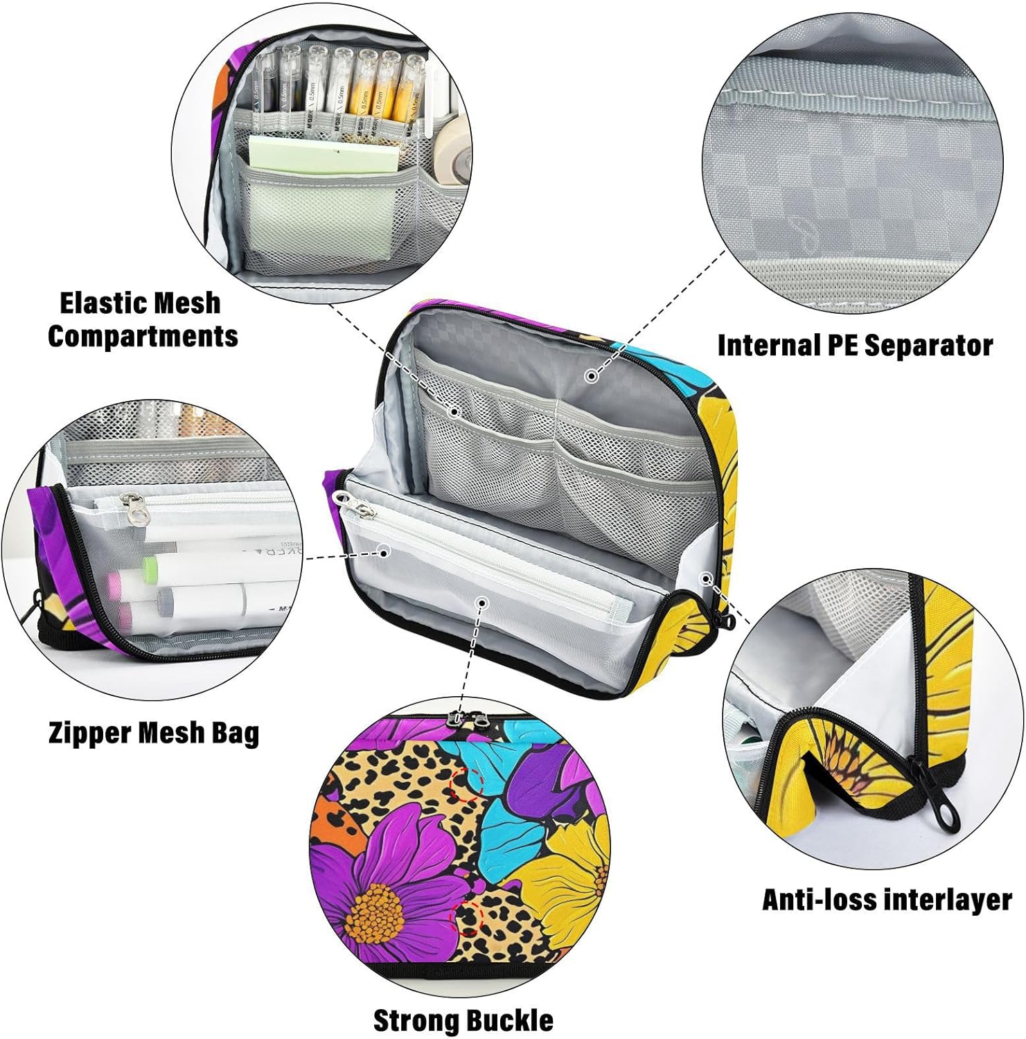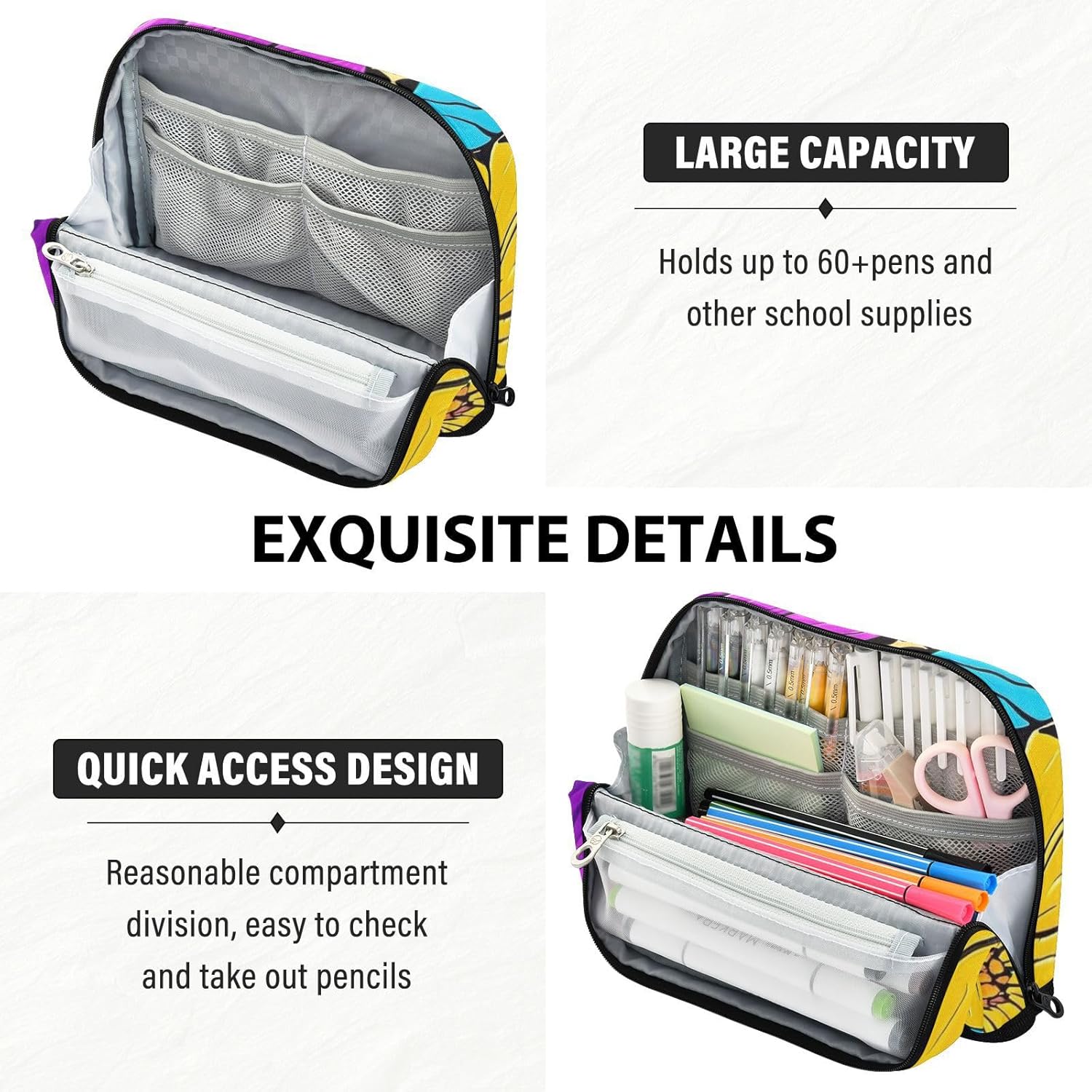 Sta in piedi comodamente: l'astuccio ha bottoni magnetici che tengono saldamente la base piegata, creando un supporto stabile. L'astuccio consente di vedere e afferrare istantaneamente penne, matite o strumenti senza dover scavare in disordine, perfetto per scrivanie occupate o tavoli artigianali. Facile organizzazione: l'astuccio offre ampio spazio per riporre e organizzare materiale scolastico, articoli per il trucco, accessori per il cucito o gadget elettronici. Tessuto in nylon rinforzato: astucci realizzati in resistente nylon 100% poliestere. Resiste a graffi, ammaccature e usura quotidiana, assicurando che il tuo astuccio rimanga bello più a lungo. Facile da pulire. Multifunzione: non è un portamatite, ma può anche essere utilizzato per altri scopi. Come una penna, una matita o un astuccio per pennelli, una borsa per il trucco, un ufficio personale e una custodia per forniture Questo piccolo astuccio è un bel regalo per adulti, scrittori e artisti per laurea, regalo di compleanno, ritorno a scuola o forniture di viaggio.