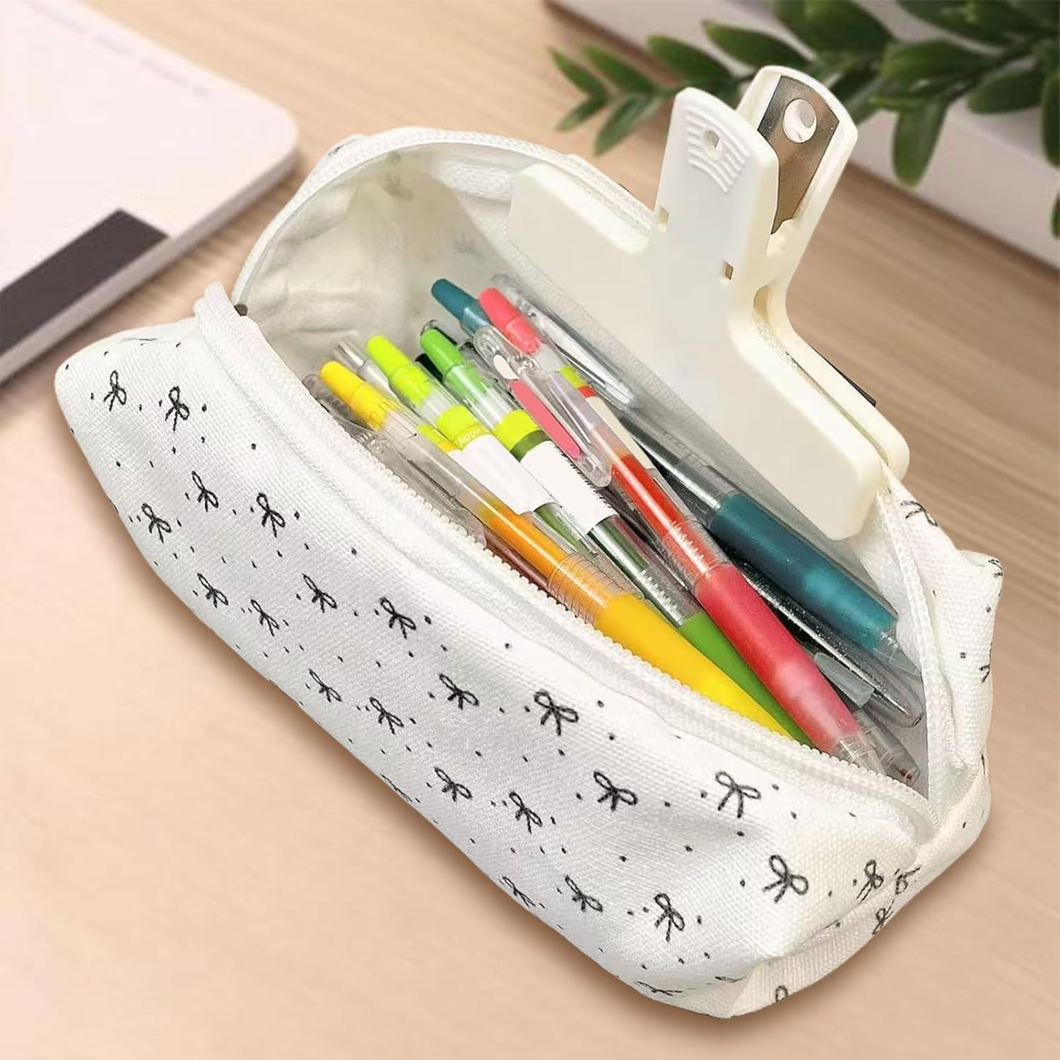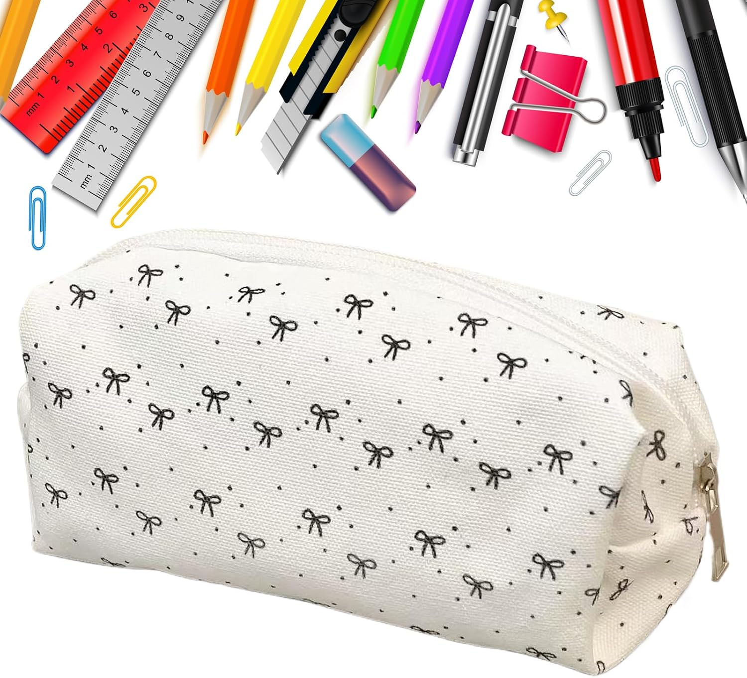 Soluzione compatta: questo astuccio combina l'organizzazione salvaspazio e la portabilità perfetta per i cassetti ottimizza le transizioni scuola-viaggio e si integra facilmente negli zaini grazie al suo formato pratico e funzionale Protezione solida: fodera interna antigraffio che protegge il contenuto, meccanismo a doppia cerniera scorrevole, comoda maniglia laterale per un facile trasporto e opzioni di archiviazione sospese sicure. Struttura durevole: combinazione di materiali solidi e cuciture precise per un design anti-deformazione, preservando l'aspetto del portamatite in modo sostenibile. Espressione elegante: con la sua tavolozza in bianco e nero e i fiocchi decorativi in rilievo, questo astuccio per scolari sublime fascino giovanile, offrendo un aspetto pulito e perfettamente adatto all'ambiente scolastico quotidiano. 2. Conservazione adattabile: grazie al suo interno spazioso e al suo sistema elastico, questo astuccio ottimizza l'utilizzo. La disposizione scientifica degli scomparti soddisfa efficacemente i requisiti di un'organizzazione versatile per riporre penne e accessori.