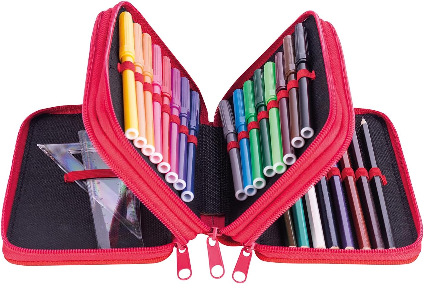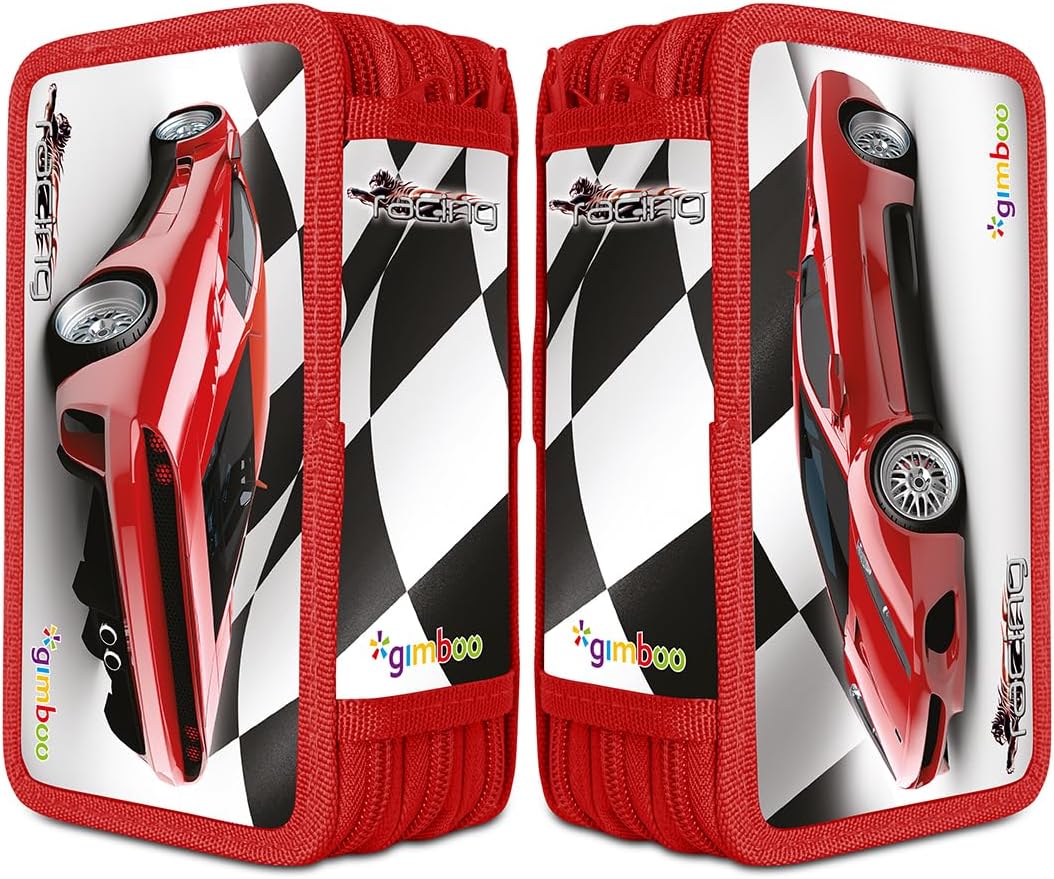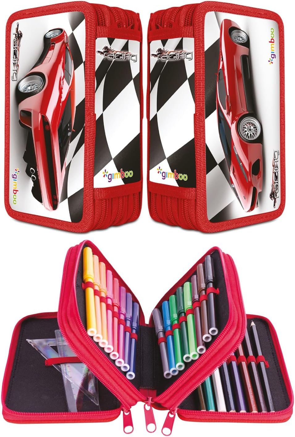 Gimboo 6768BTS73PL-04 - Astuccio con 3 scomparti, con chiusura lampo. Astuccio scuola Motivo: auto da corsa. Il set include accessori (righello, squadra, 3 penne/penna, matita, gomma, temperino, 16 pennarelli, 16 pastelli) Il set include l'attrezzatura. Colore: tema/motivo auto da corsa Dimensioni: 19 x 11,5 x 6 cm