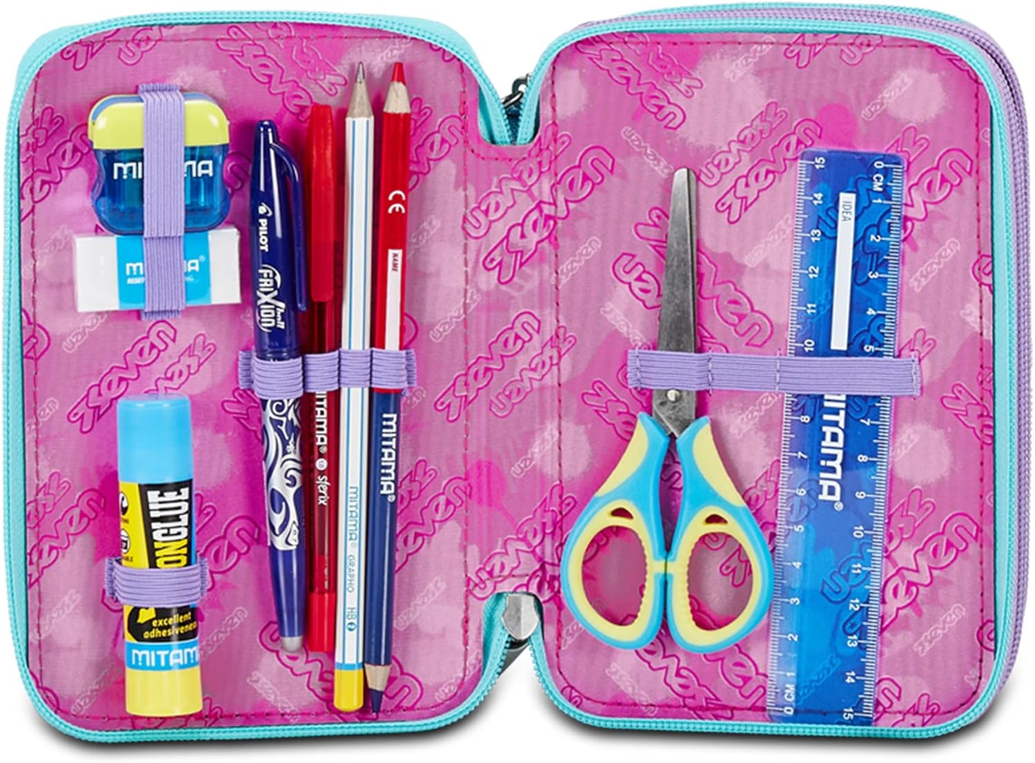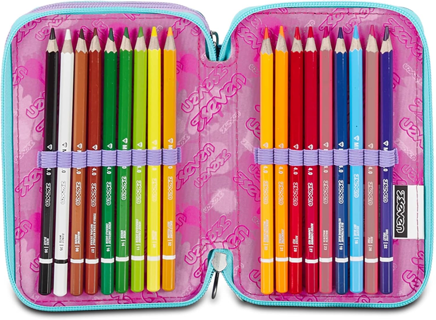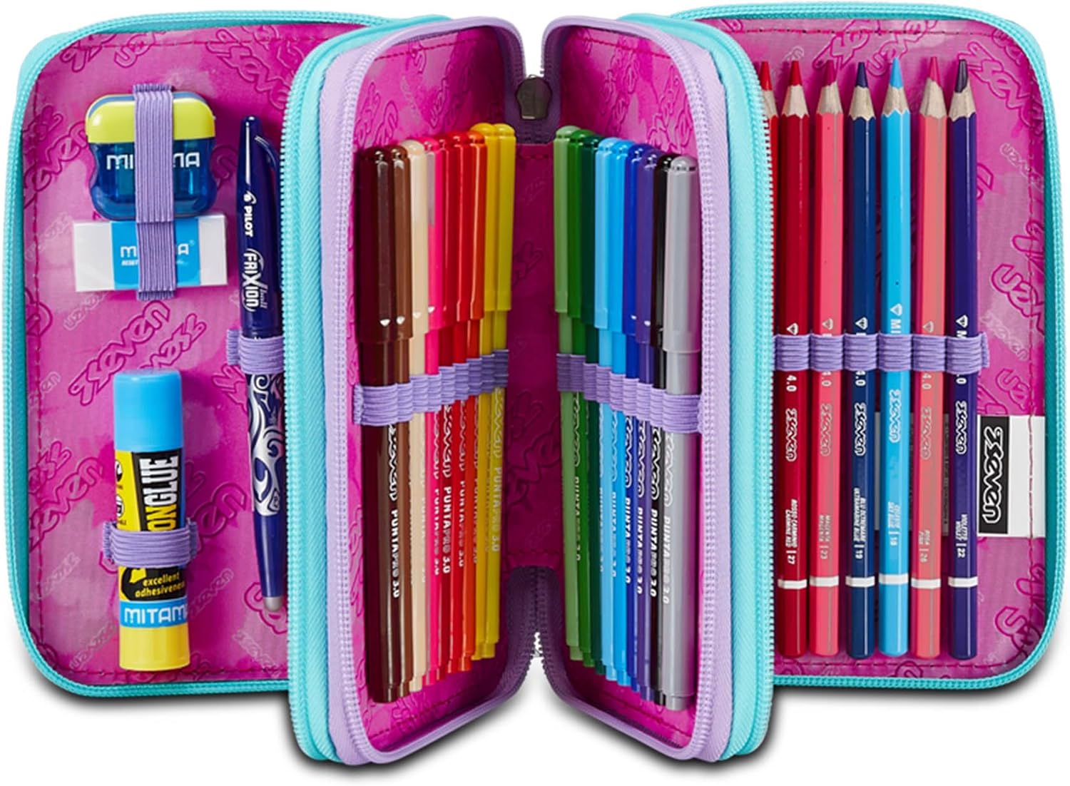 Ottimo astuccio! Adoro il marchio Seven usato per zaino e astuccio anche del mio figlio più grande: belli esteticamente e robusti. Inclusi colori di qualità ed è pronto per la scuola da inserire nello zaino senza doverci far nulla: All'interno c'è già tutto l'occorrente (forbici, righello, colla...)!