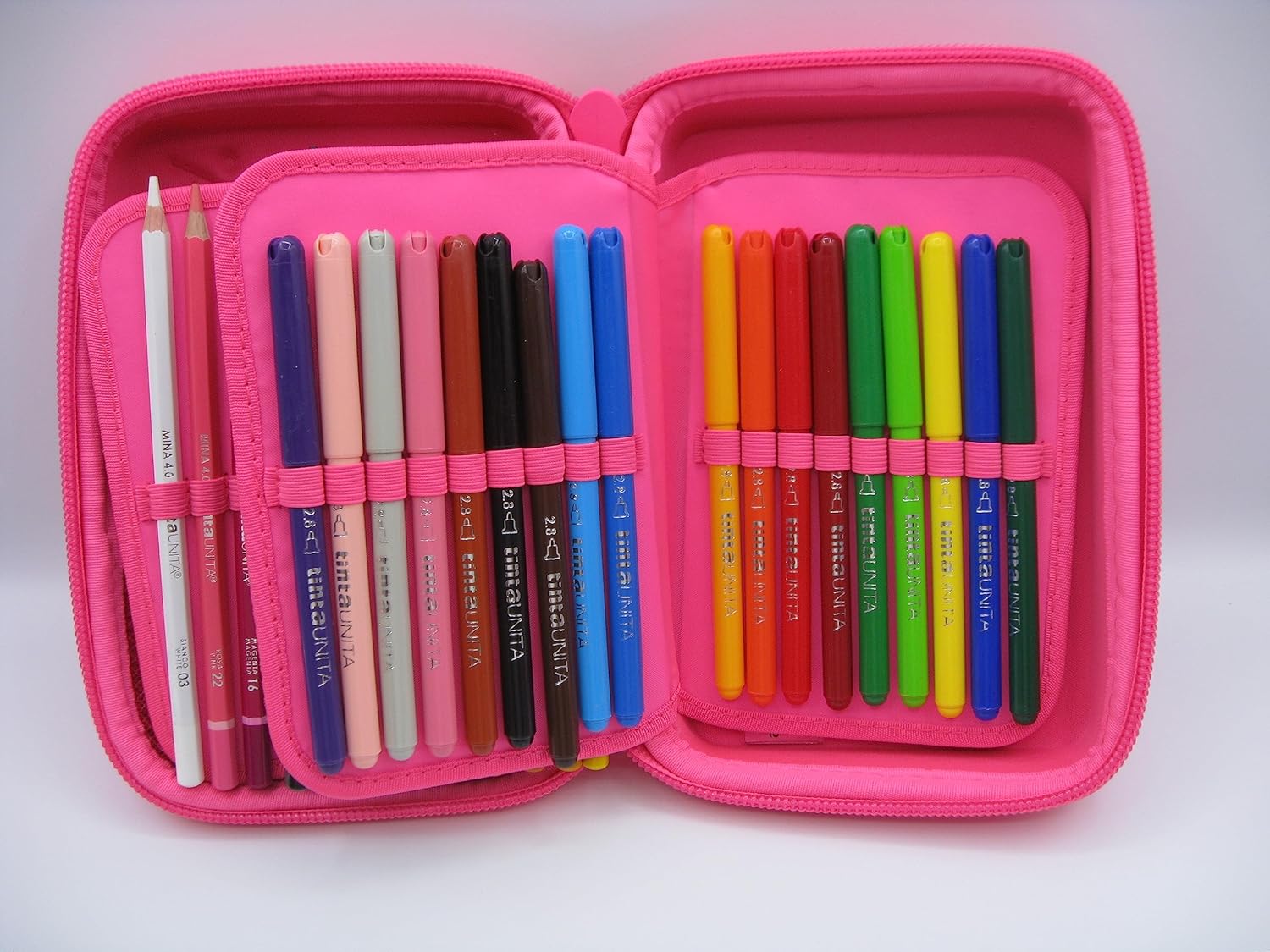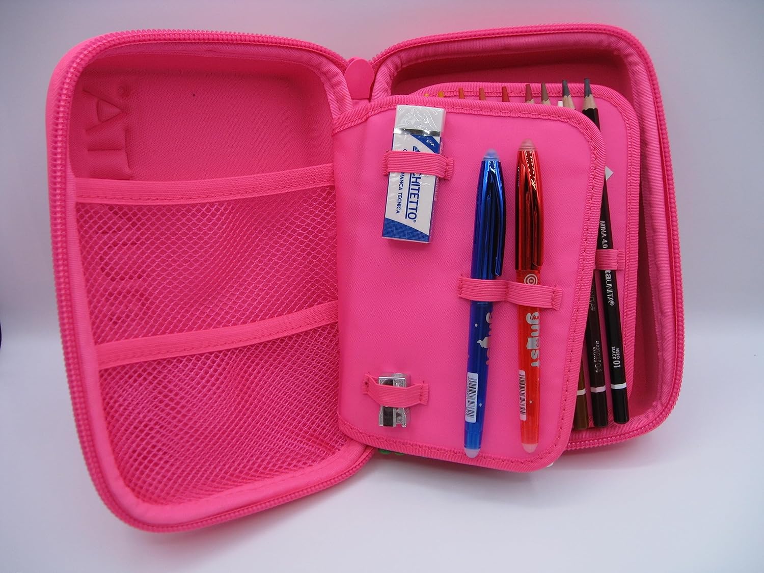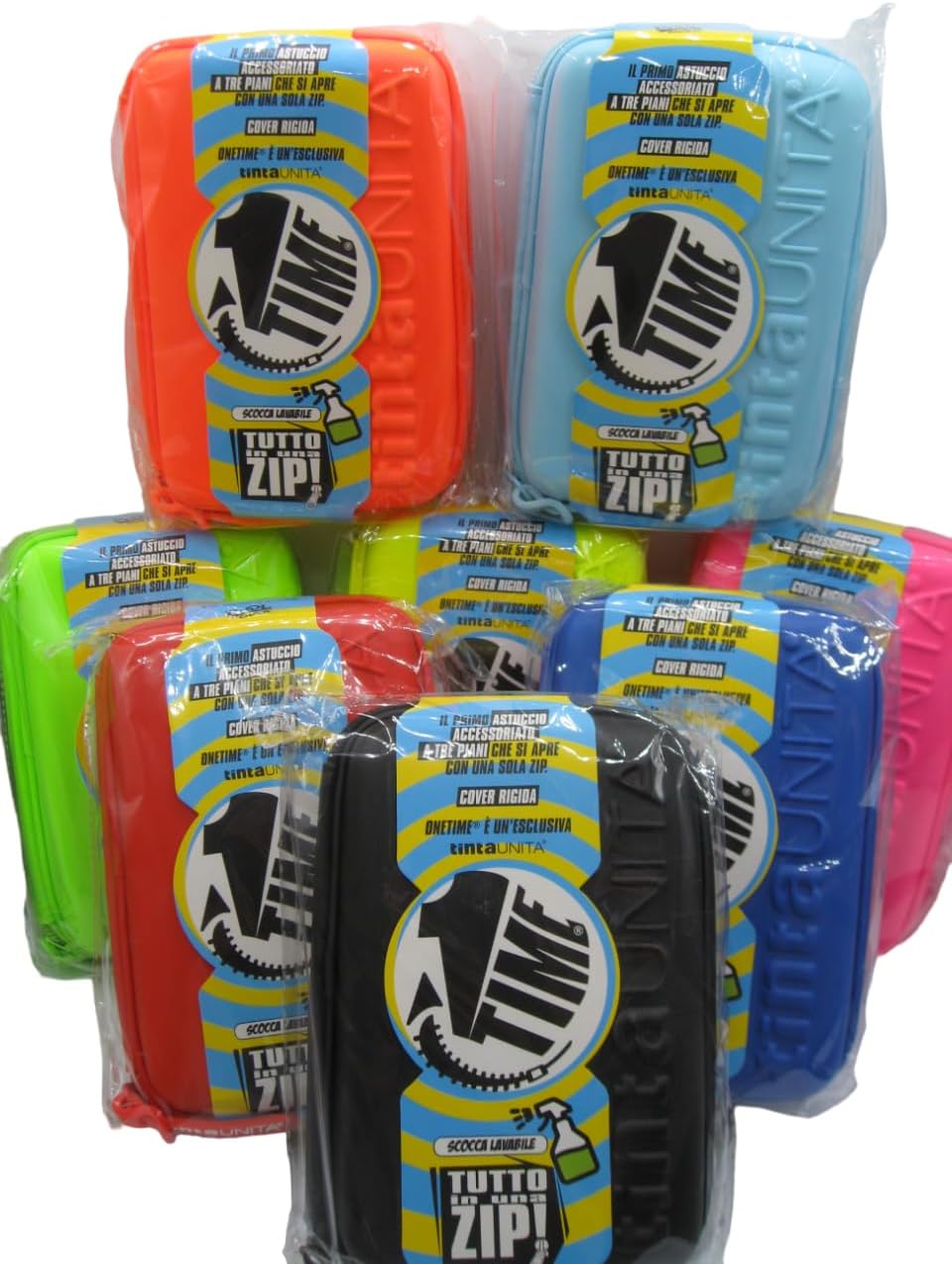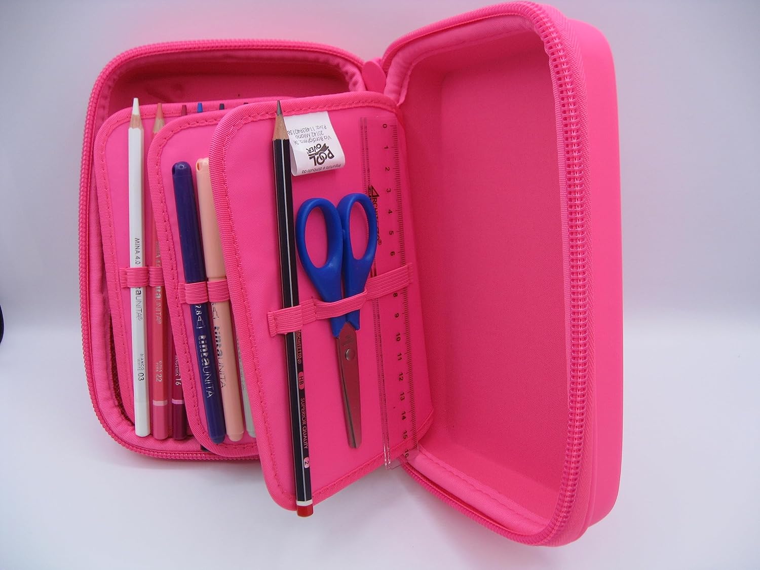 Astuccio Tinta Unita PoolOver ONE TIME ASTUCCIO ACCESSORIATO CON COVER RIGIDA E IMPERMEABILE CHE SI APRE CON UNA SOLA ZIP INTERNAMENTE SUDDIVISO CON TRE SPAZI E UNA TASCA PORTA TUTTO CONTIENE 2 PENNE GHOST CANCELLABILI,1 GOMMA ARCHITETTO, 18 PASTELLI TINTA UNITA MINA 4 CM., 18 PENNARELLI, 1 MATITA TINTA UNITA, 1 RIGHELLO E 1 UNA FORBICE. Misure 22x15x7 cm