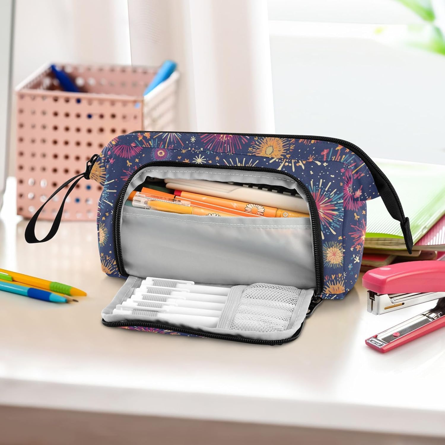 Materiale di alta qualità: realizzato in robusto tessuto di nylon e robusta cerniera in metallo, l'astuccio è di qualità, in grado di resistere all'uso quotidiano, resistente all'usura, ai graffi e facile da pulire. (Non adatto a bambini di età inferiore ai 3 anni!) Grande capacità: 24 x 9,5 x 15 cm (lunghezza x larghezza x altezza). L'astuccio presenta una tasca principale spaziosa di grande capacità, che può contenere 40-60 matite, regole o quaderni. Due tasche interne possono contenere piccoli oggetti scolastici come gomme, nastri, foglietti adesivi e altre necessità. La tasca laterale esterna è dritta alla tasca principale e si attacca a 5 scomparti per matite, fissando le penne usate di frequente e organizzando ordinatamente le matite. Facile da usare e trasportare: con un design speciale, gli astucci possono essere aperti non dall'alto, ma anche attraverso i lati per facilitare il posizionamento e la manipolazione degli oggetti. Ci sono anche fessure elastiche e borse a rete sul coperchio aperto laterale per penne usate frequentemente, che non sono facili da perdere ma di facile accesso. Una cinghia a mano sul lato della borsa è facile da trasportare. Scenario applicabile: l'astuccio non è solo un astuccio, ma può anche essere utilizzato per altri scopi. È adatto per occasioni come studio, ufficio, gite, viaggi, uscite e così via. Inoltre, può essere utilizzato come astuccio per penne, matite o pennelli, borsa per il trucco, ufficio personale e custodia per forniture scolastiche. Materiale lavabile: l'intero astuccio è lavabile. il modo corretto di lavare è a mano; il lavaggio in lavatrice non è supportato. Non aggiungere candeggina durante la pulizia.