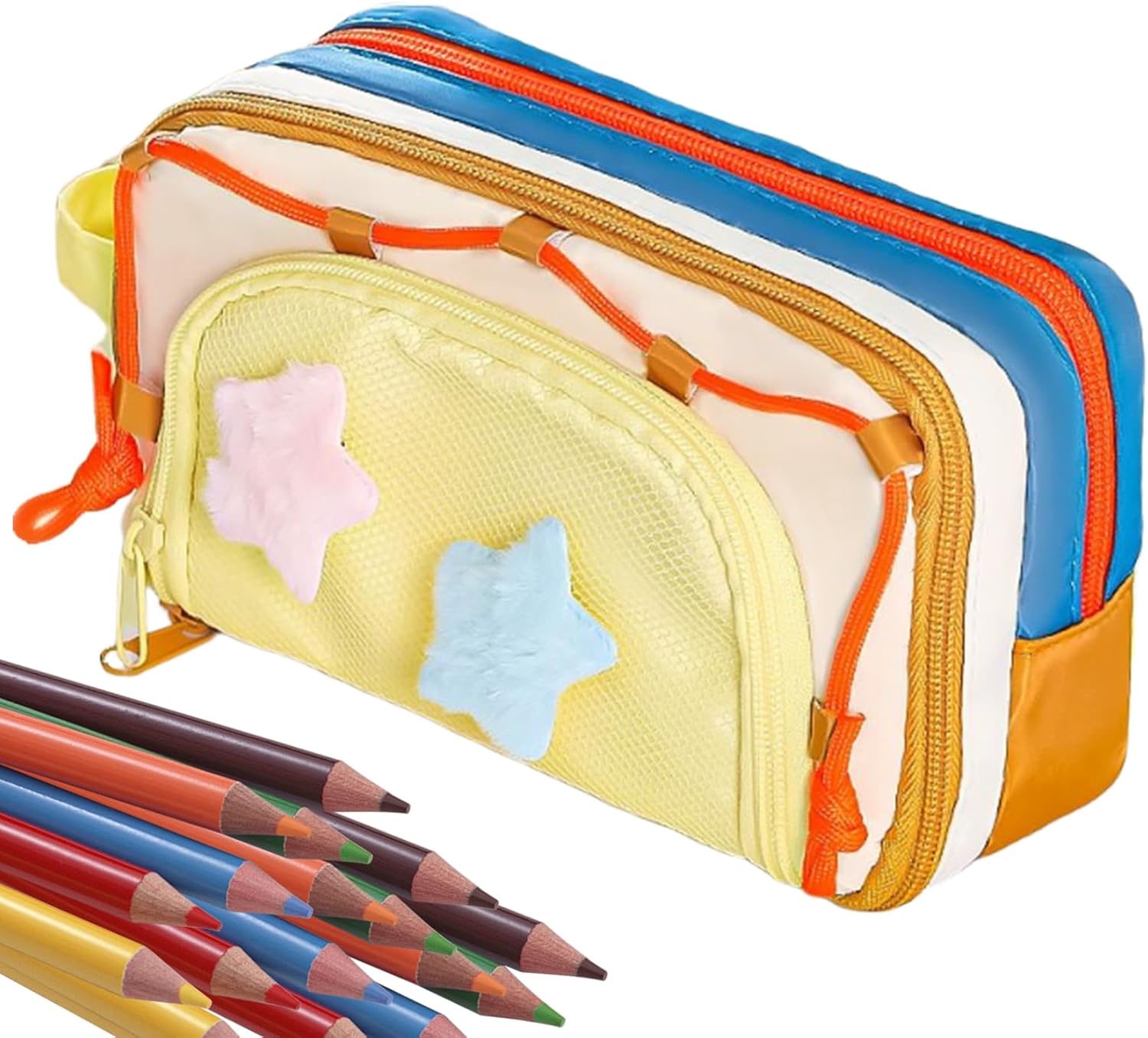 Estetica giocosa e coinvolgente: Il design vivace con stella a cinque punte e accostamenti cromatici brillanti garantisce una perfetta sintonia con i gusti estetici degli studenti per un o quotidiano Capienza Abbondante: Un astuccio roomy che soddisfa diverse esigenze dstudio ai compiti, assicurando ampio spazio per penne, matite e altri articoli di cancelleria in modo organizzato e funzionale Layout Intelligente: La suddivisione in più scomparti permette un accesso facile e veloce, conservando matite, penne, righelli e altri per cancelleria in modo funzionale e ordinato Regalo : Ideale per il Natale e la stagione del back to school, questo astuccio è un pensiero gradito per bambini e bambine, adatto anche per compleanni e la Festa dei Bambini grazie al design versatile e stile accattivante, un regalo memorabile che combina funzionalità e creatività per i giovani studenti. Adattabilità eccellente: Progettato per essere molto più di un semplice portamatite, questo contenitore offre una soluzione ordinata per trasportare cavi e makeup, dimostrando versatilità a scuola, in viaggio e in tutte le situazioni che richiedono spazio conservabile accessibile