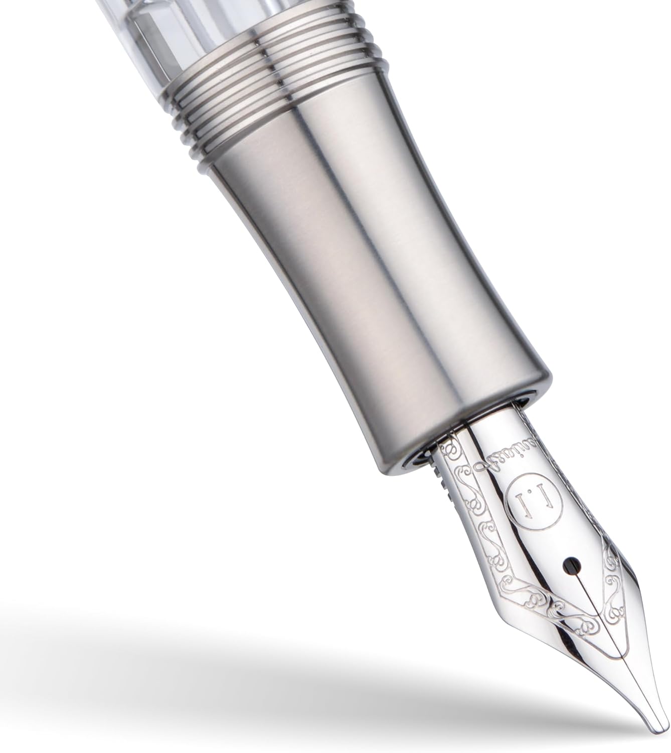 Materiale durevole: tutte le parti sono realizzate in titanio e acrilico di alta qualità. L'eccellente titanio è noto per la sua durata estremamente elevata e la sua leggerezza eccezionale. Ben bilanciato per la scrittura quotidiana: l'area ergonomica in titanio ha un design antiscivolo e garantisce una presa comoda per lunghi periodi di scrittura. Elevata capacità di inchiostro: il sistema di riempimento a pistone integrato della penna contiene molto più inchiostro di una cartuccia e consente di prelevare l'inchiostro direttamente dalla bottiglia, senza bisogno di un convertitore. Flusso facile e scrittura fluida - Dotata di punta n. 6 da 1,1 mm per firma, calligrafia e disegno artistico. Penna setosa nella carta, ottima scorrevolezza e buona presa in mano. Garanzia di qualità: ogni penna è stata realizzata a mano dal nostro artigiano e controllata individualmente per verificarne la qualità impeccabile. Se riscontri problemi nell'utilizzo di questa penna, inviaci un messaggio.