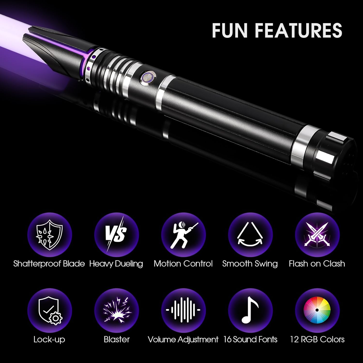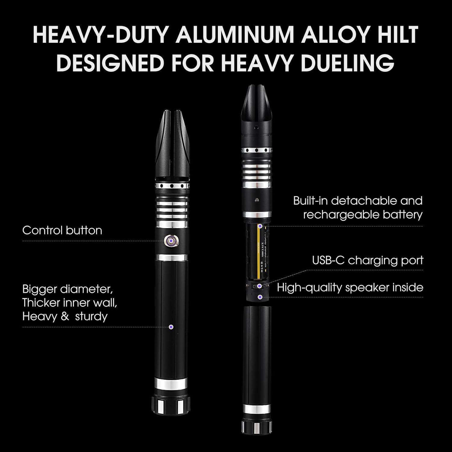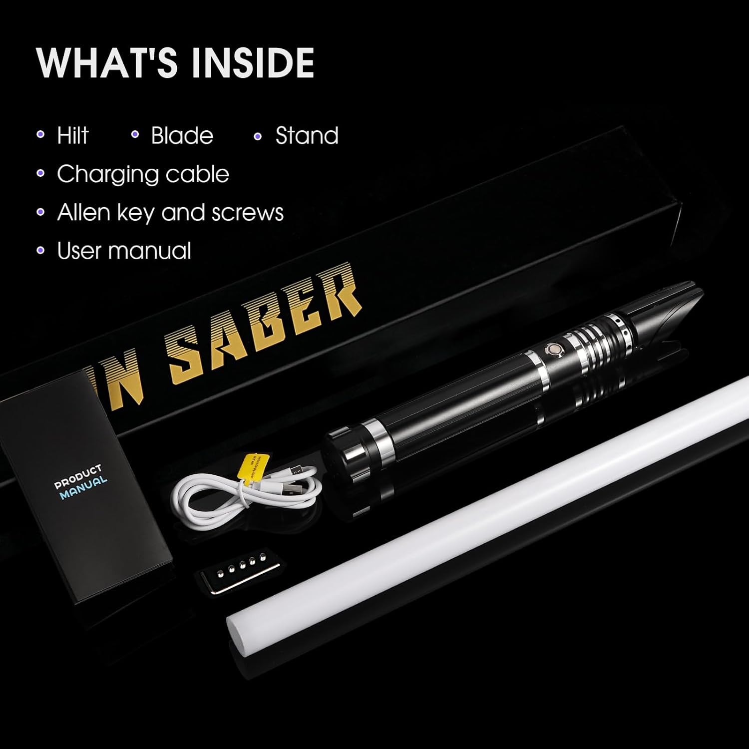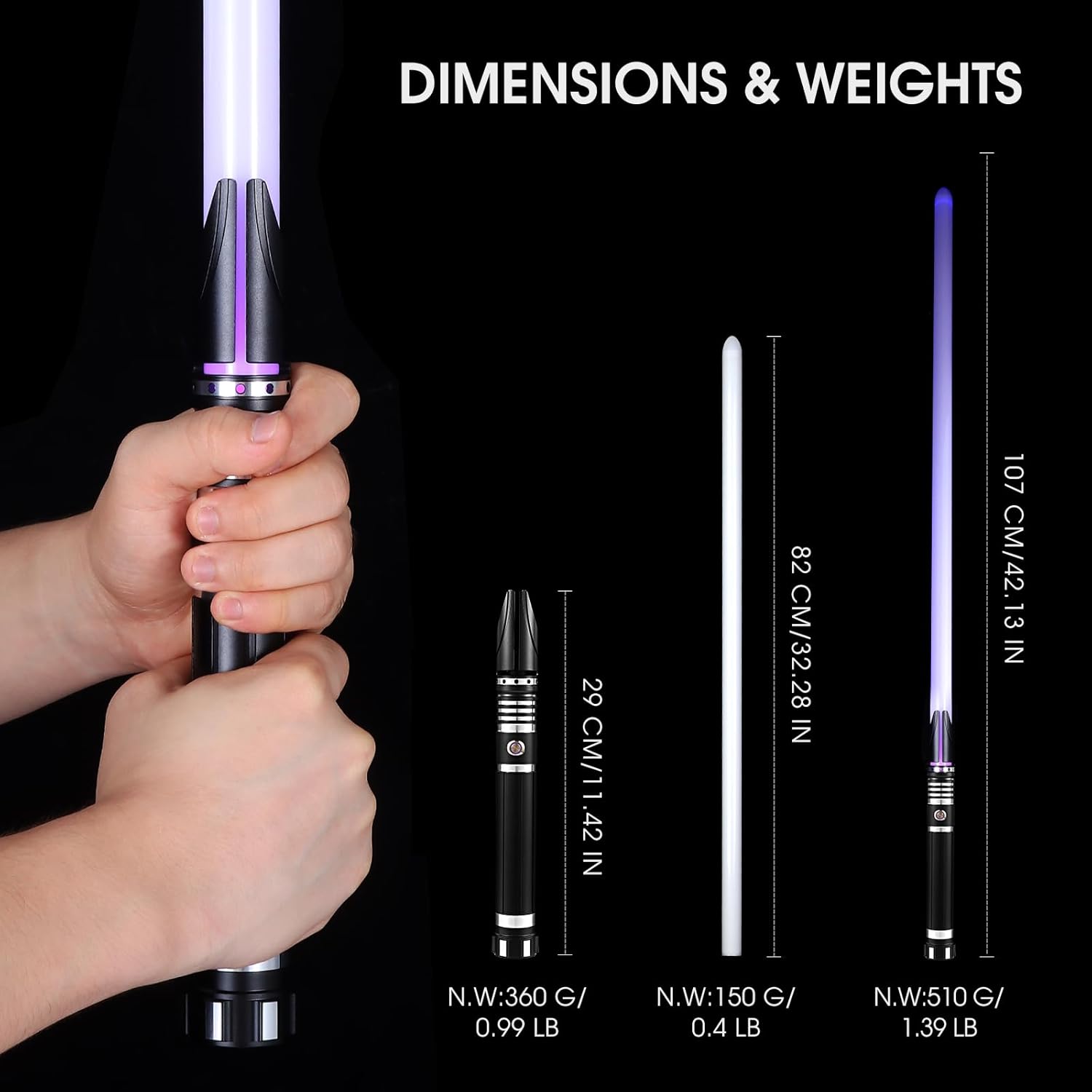【Nuove funzioni di controllo del movimento】Questa sciabola da duello è una spada laser intelligente di alto livello con 2 tipi di controllo del movimento, tra cui rotazione e pugnalata e tiro. La funzione di controllo del movimento può essere disattivata se si preferisce il controllo tramite pulsanti. Con la funzione di controllo del movimento, è possibile accendere/spegnere l'illuminazione della lama, passare da un carattere sonoro all'altro e cambiare i colori dell'illuminazione della lama. 【Effetti sonori ed effetti luminosi】Questa spada laser da duello è dotata di 16 suoni per i personaggi dei film, 12 colori RGB per l'illuminazione della lama, 4 effetti lama (Fantasma/Stabile/Blaster/Impulso), 3 impostazioni di volume (Alto, Basso, Muto). I suoi sensibili effetti Smooth Swing/Flash-on-Clash/Lock-up/Blaster simulano le scene di duello di oscillazioni e scontri dei film, offrendoti un'esperienza di combattimento vivida e realistica. 【Robusta impugnatura in alluminio e lama spessa in policarbonato】Questa spada laser per duelli è dotata di un'impugnatura robusta in alluminio e pesa circa 360 g, più pesante e robusta della maggior parte delle spade laser. Questa spada laser RGB è dotata di una lama spessa e ad alto impatto da 82 cm/32 pollici in policarbonato, che la rende resistente ai colpi, difficile da piegare o rompere e ideale per duelli davvero impegnativi. 【Supporto espositivo incluso】Un supporto in acrilico per la spada laser realistica è incluso nella confezione. Il supporto per spada laser da combattimento è realizzato in acrilico trasparente di alta qualità ed è molto spesso e robusto. Posiziona la spada laser sul supporto e lasciala appoggiata sulla scrivania, così potrai comodamente estrarre la pesante spada laser da duello per divertirti e riporla per ricaricare la batteria dopo il duello. 【Garanzia e assistenza】È necessario utilizzare il cavo incluso con un caricabatterie USB da 5 V 1 A o un caricabatterie da parete da 5 V. Il mancato rispetto di queste istruzioni può comportare un rischio di incendio o danni ai dispositivi elettronici. La spada laser e tutti i suoi accessori sono coperti dalla nostra garanzia di 24 mesi. Non esitate a contattare il nostro servizio clienti professionale per una soluzione rapida e soddisfacente.