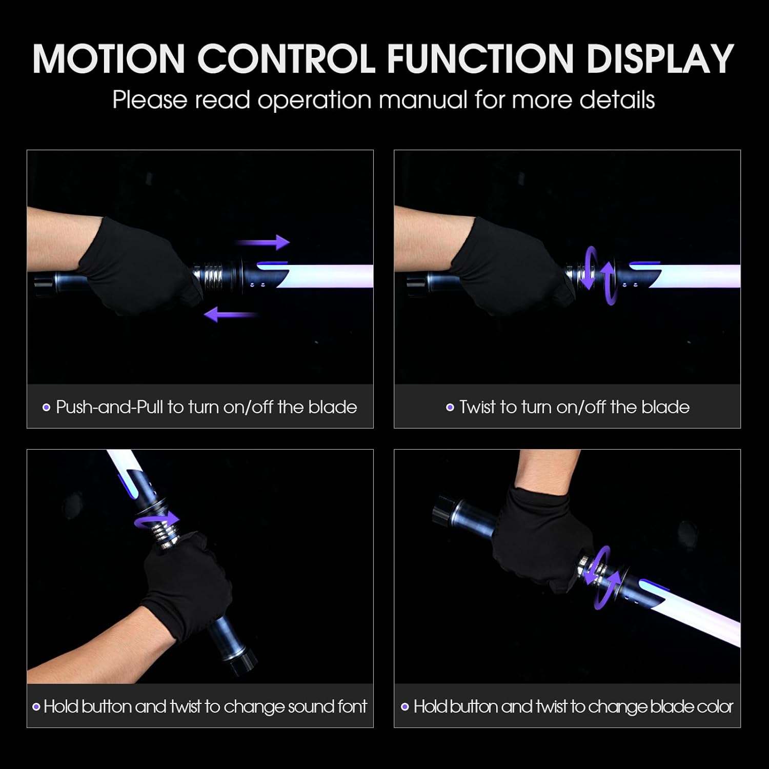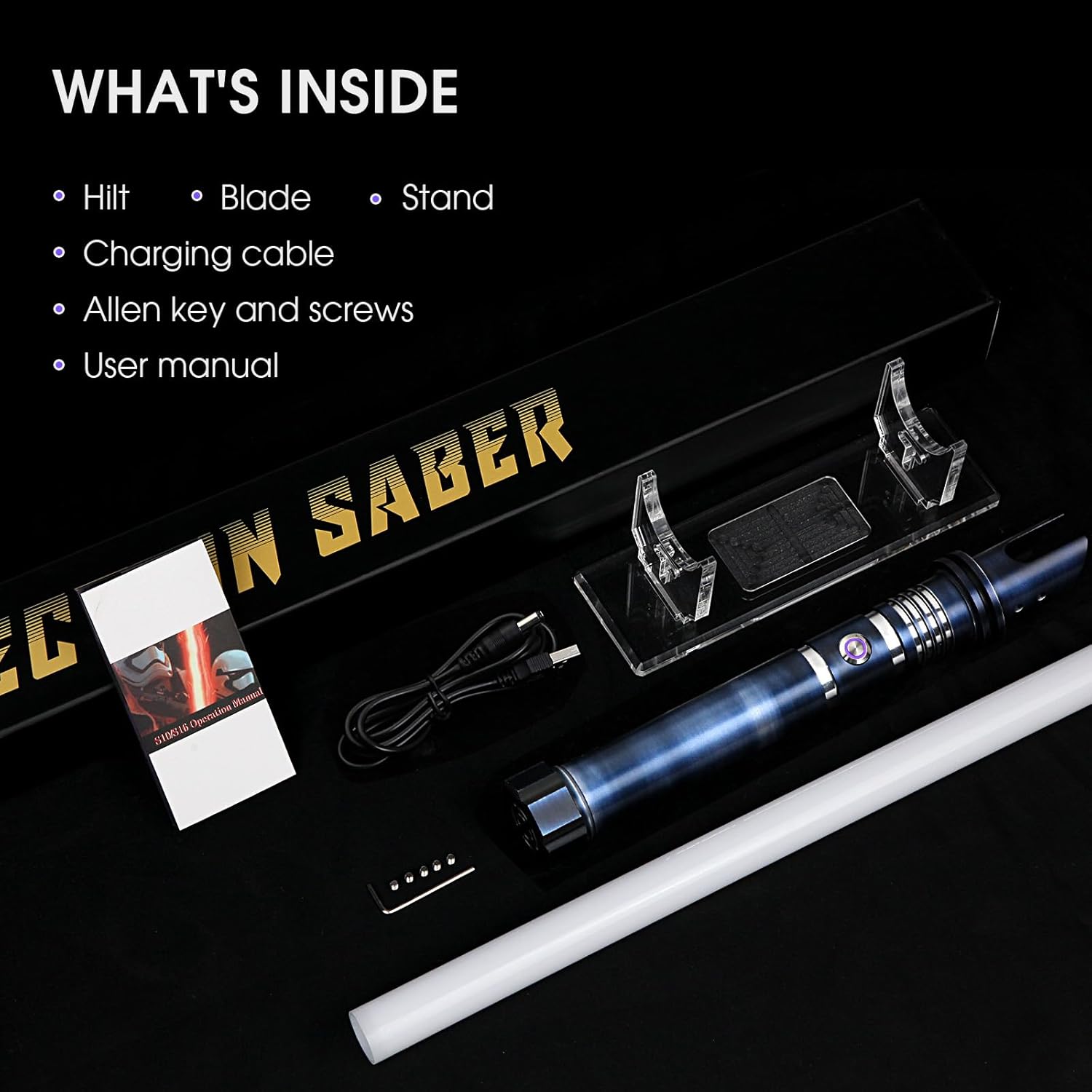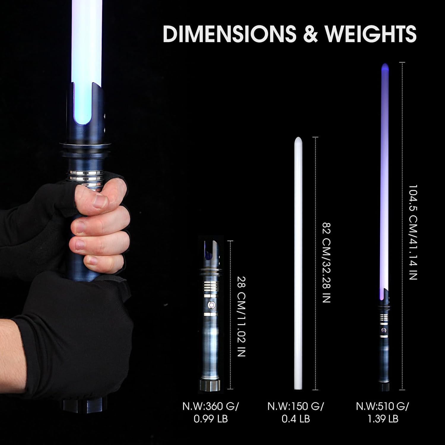 【Nuove funzioni di controllo del movimento】Questa sciabola da duello è una spada laser intelligente di alto livello con 2 tipi di controllo del movimento, tra cui rotazione e pugnalata e tiro. La funzione di controllo del movimento può essere disattivata se si preferisce il controllo tramite pulsanti. Con la funzione di controllo del movimento, è possibile accendere/spegnere l'illuminazione della lama, passare da un carattere sonoro all'altro e cambiare i colori dell'illuminazione della lama. 【Effetti sonori ed effetti luminosi】Questa spada laser da duello è dotata di 16 suoni per i personaggi dei film, 12 colori RGB per l'illuminazione della lama, 4 effetti lama (Fantasma/Stabile/Blaster/Impulso), 3 impostazioni di volume (Alto, Basso, Muto). I suoi sensibili effetti Smooth Swing/Flash-on-Clash/Lock-up/Blaster simulano le scene di duello di oscillazioni e scontri dei film, offrendoti un'esperienza di combattimento vivida e realistica. 【Robusta impugnatura in alluminio e lama spessa in policarbonato】Questa spada laser per duelli è dotata di un'impugnatura robusta in alluminio e pesa circa 360 g, più pesante e robusta della maggior parte delle spade laser. Questa spada laser RGB è dotata di una lama spessa e ad alto impatto da 82 cm/32 pollici in policarbonato, che la rende resistente ai colpi, difficile da piegare o rompere e ideale per duelli davvero impegnativi. 【Supporto espositivo incluso】Un supporto in acrilico per la spada laser realistica è incluso nella confezione. Il supporto per spada laser da combattimento è realizzato in acrilico trasparente di alta qualità ed è molto spesso e robusto. Posiziona la spada laser sul supporto e lasciala appoggiata sulla scrivania, così potrai comodamente estrarre la pesante spada laser da duello per divertirti e riporla per ricaricare la batteria dopo il duello. 【Garanzia e assistenza】È necessario utilizzare il cavo incluso con un caricabatterie USB da 5 V 1 A o un caricabatterie da parete da 5 V. Il mancato rispetto di queste istruzioni può comportare un rischio di incendio o danni ai dispositivi elettronici. La spada laser e tutti i suoi accessori sono coperti dalla nostra garanzia di 24 mesi. Non esitate a contattare il nostro servizio clienti professionale per una soluzione rapida e soddisfacente.