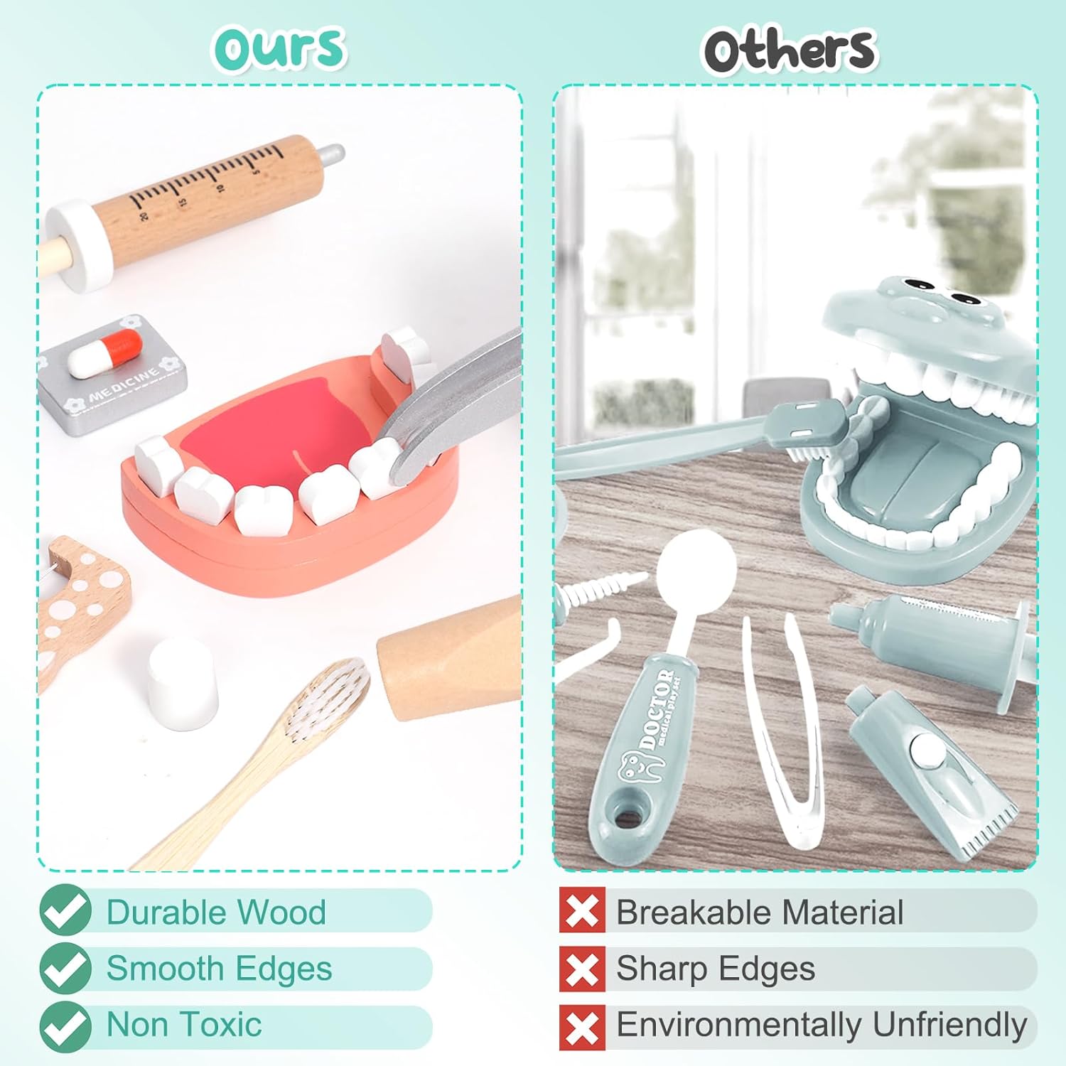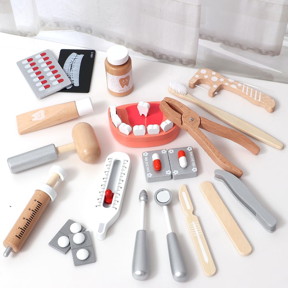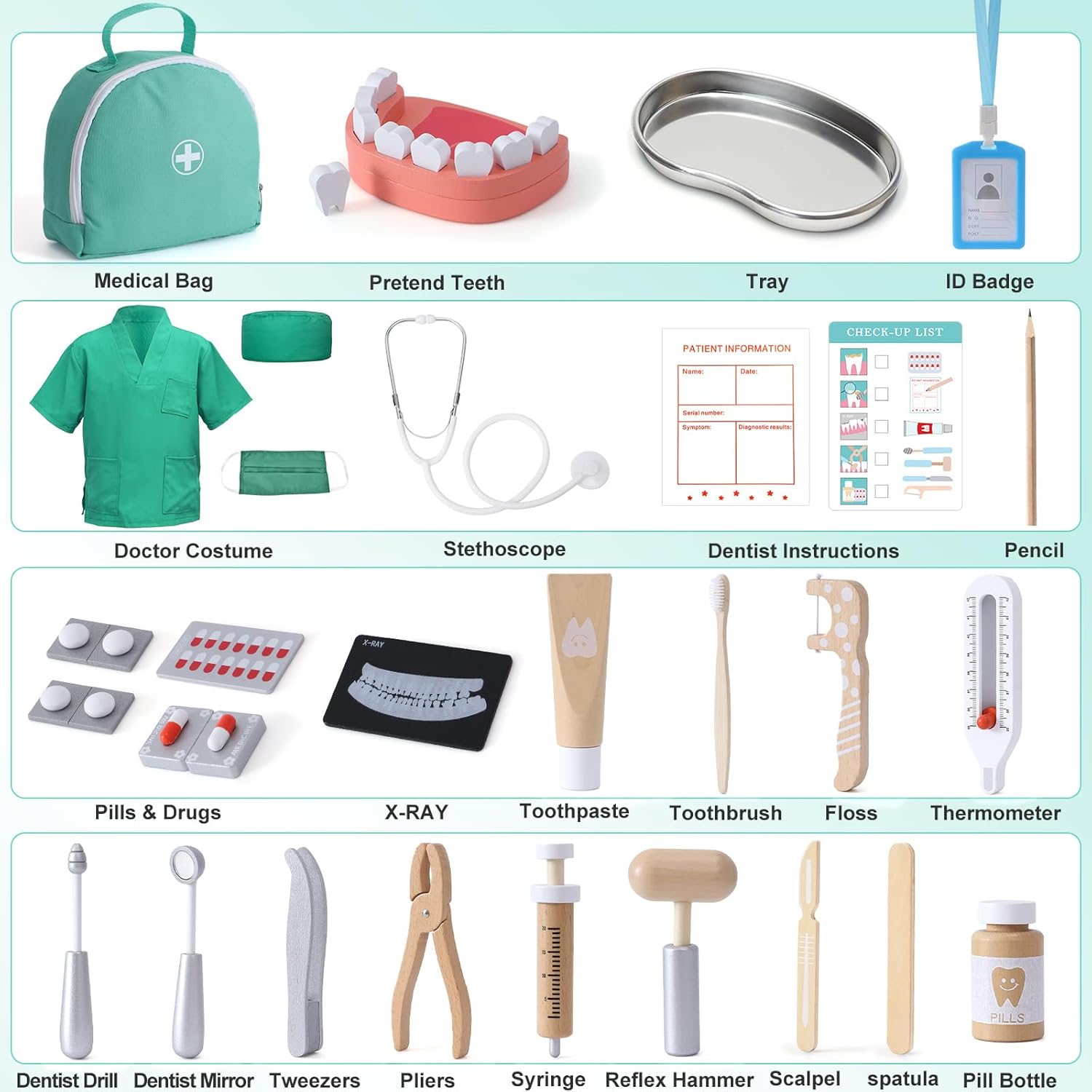 🦷KIT DENTISTA DA PER BAMBINI 32 PEZZI - Il set da gioco del dottore per bambini viene fornito con un costume da medico chirurgo con berretto e maschera, il kit medico che include una borsa da medico per il trasporto, uno stetoscopio, un giocattolo per i denti e vari accessori in legno, come martello, spazzolino da denti, siringa, pinzette e così via. 🦷ESSERE UN VERO DOTTORE - Modi divertenti per aspiranti giovani medici per conoscere le carriere dei dentisti. Un kit medico realistico migliorerebbe il pensiero creativo e coltiverebbe la compassione e le abilità sociali dei bambini. I bambini possono anche comprendere gli usi di diversi strumenti medici e superare la paura delle visite mediche, diventando più sicuri. 🦷SICURO E DUREVOLE - A differenza di altri set da gioco per medici in plastica, la maggior parte del nostro set medico è realizzata in materiale di legno naturale con vernice atossica, resistente all'uso. I bordi lisci impediscono ai bambini di farsi male durante il gioco. Questi finti giocattoli con costumi da dottore realizzano perfettamente il sogno del dottore. 🦷FACILE DA PORTARE E CONSERVARE - Ogni kit medico giocattolo viene fornito con una borsa da medico che può contenere tutte le attrezzature mediche all'interno. Quindi i bambini possono coltivare l'abitudine di immagazzinare, quindi la tua casa non sarà più in disordine. 🦷REGALI IDEALI PER BAMBINI - Il nostro set medico per bambini è un ottimo regalo per bambini di età superiore a 3 anni per compleanni, vacanze, feste in costume di Halloween, Natale, ecc. Ci impegniamo a offrire ai clienti il miglior servizio. Offriamo ai nostri clienti una politica di restituzione di 30 giorni. Se hai domande su questo kit medico, non esitare a contattarci.