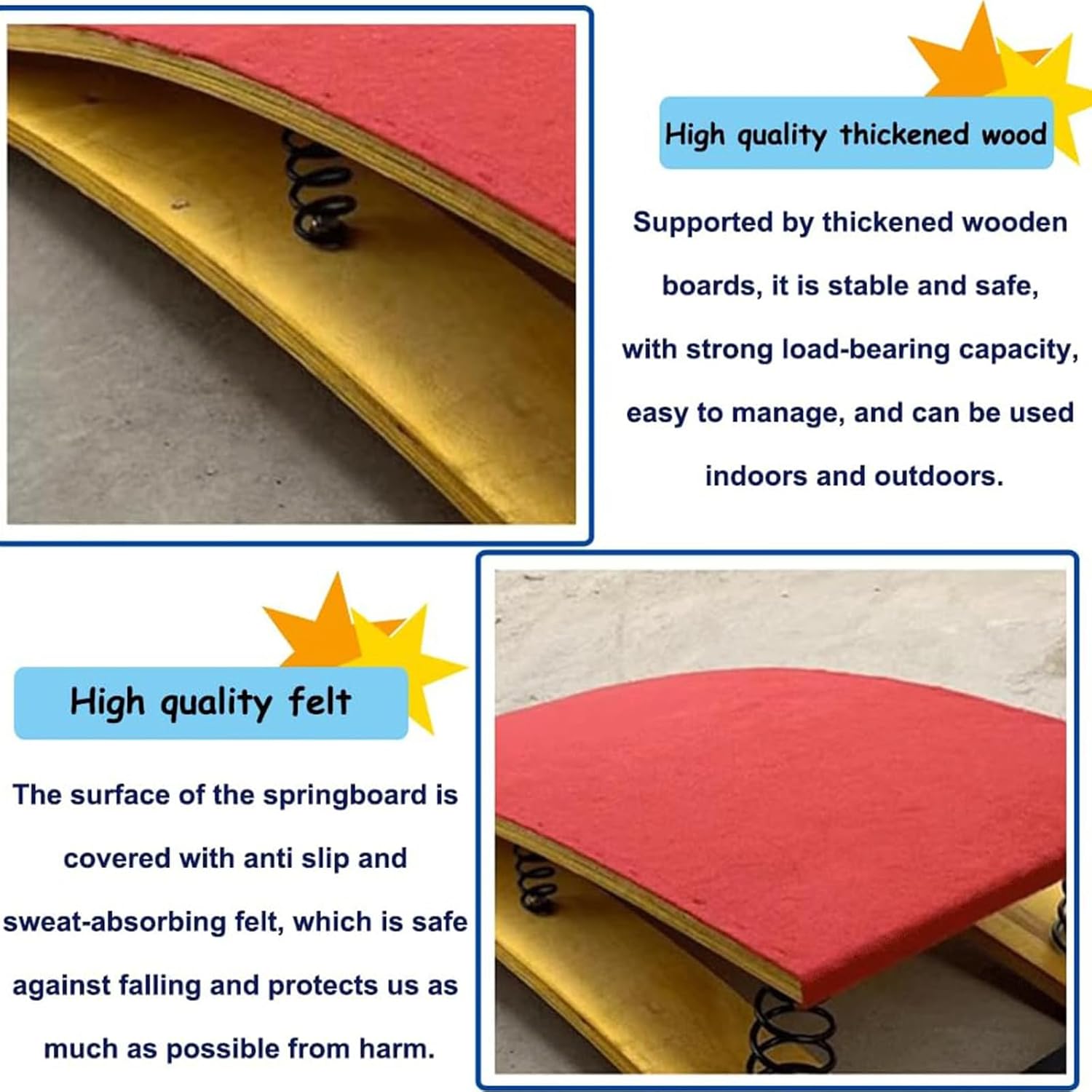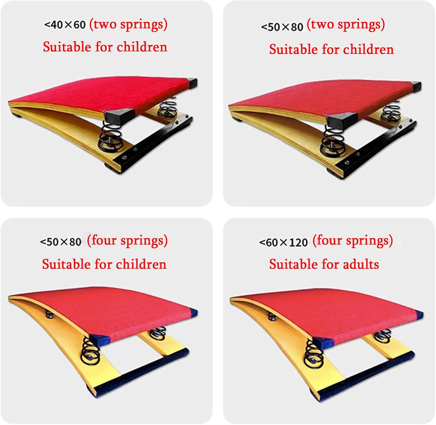 Le specifiche e le proprietà sono progettate secondo gli standard, quindi può essere utilizzato in palestra o a casa. Carico 110 kg/250 libbre. Molle ad alta elasticità: le molle spesse ad alta tenacità hanno maggiore elasticità e resilienza, sono sicure e durevoli e consentono un supporto superiore e un utilizzo ottimale. Attrezzatura da ginnastica robusta e durevole: legno duro spesso, feltro antiscivolo di alta qualità sulla superficie, molla interna in acciaio al manganese rinforzata, elevata capacità portante, nessuna deformazione, piastra in acciaio antiruggine fissata. Ampiamente utilizzato: resistente, perfetto per la casa, la barra di ginnastica, la sala giochi, i percorsi di allenamento a ostacoli, la palestra di casa, il seminterrato, ecc. Larghezza 60 cm/23,6"; Profondità 120 cm/47"; Altezza 20 cm/7,9" dall'estremità più alta.