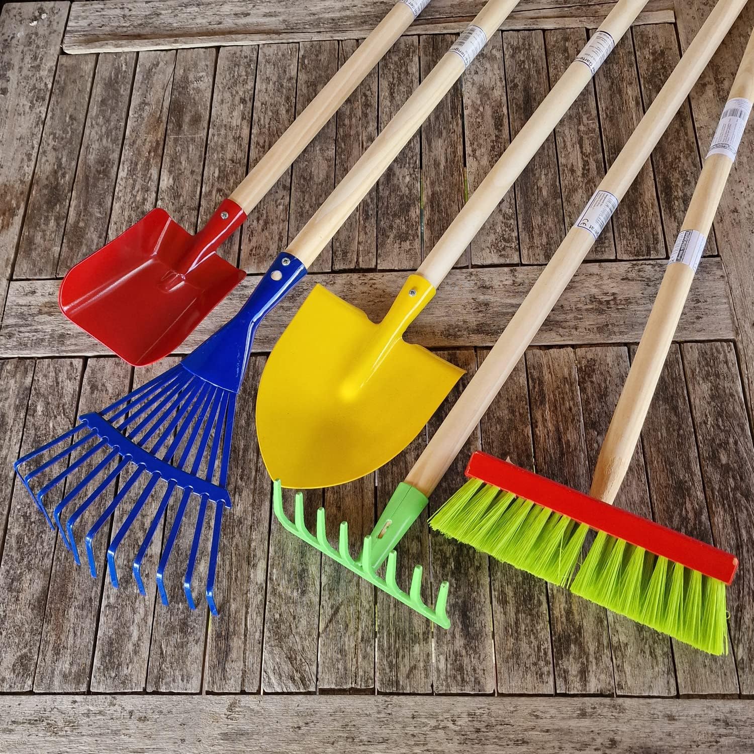 Attrezzi da giardino per bambini (senza decorazione), potete selezionare le diverse varianti sopra. Tutti gli apparecchi sono realizzati in metallo con manico in legno, a seconda dell'articolo con una lunghezza totale da 70 cm a 98 cm. La larghezza dipende dall'articolo fino a 21 cm/il manico in legno ha uno spessore di 2,5 cm (diametro). Dispositivi colorati per la spiaggia e il giardino. Lo strumento giusto per i piccoli giardinieri. Non adatto a bambini di età inferiore a 3 anni