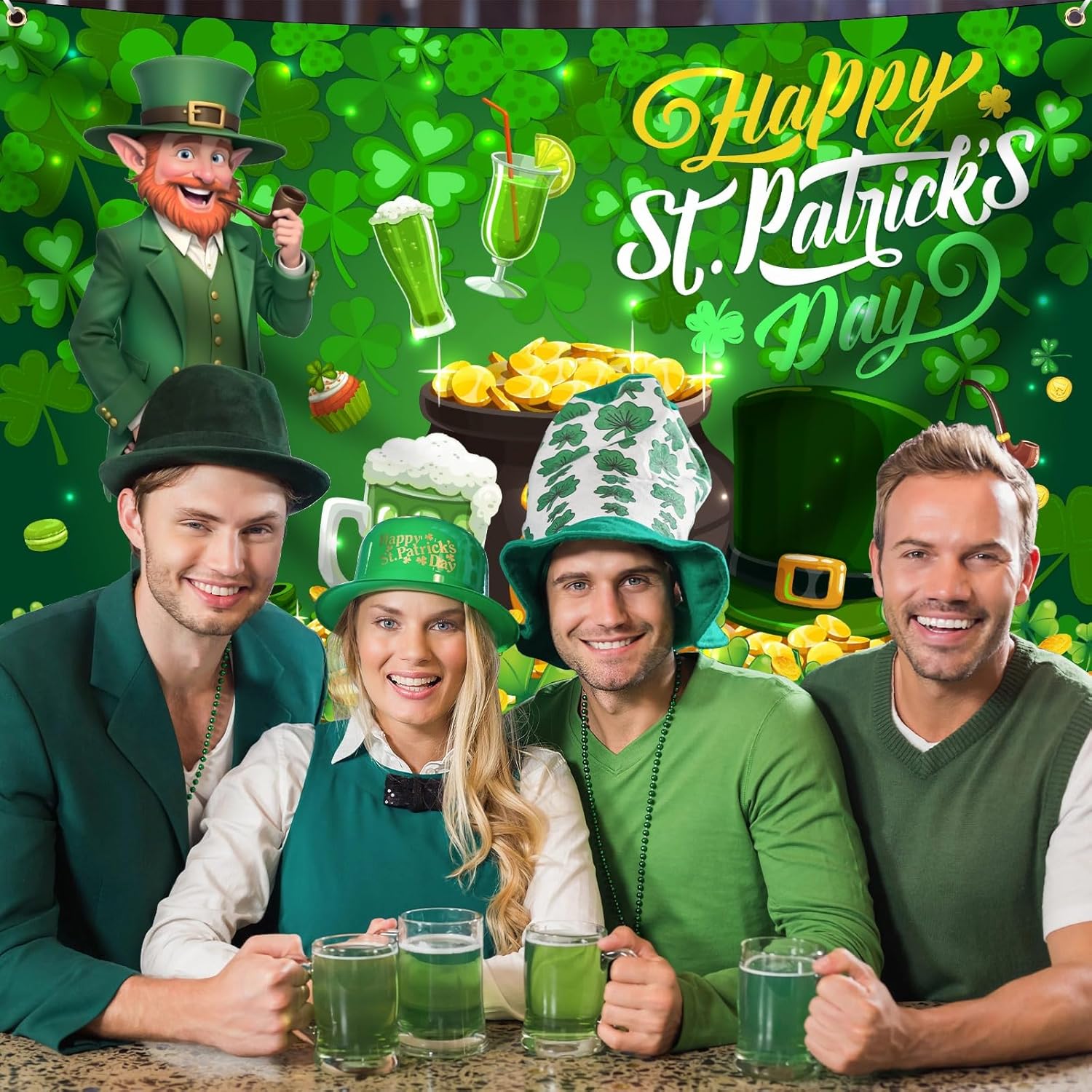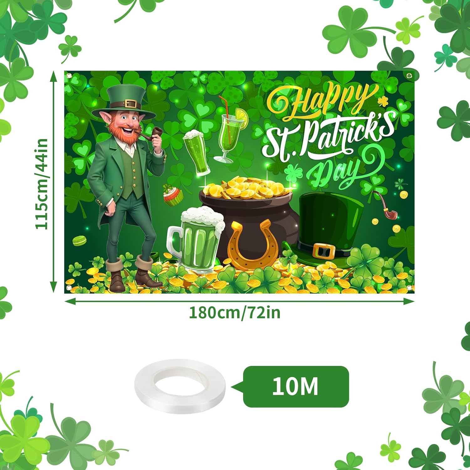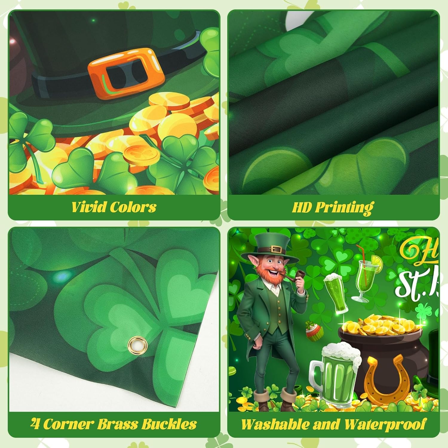 【Sfondo di San Patrizio di grandi dimensioni】 Ti offriamo uno striscione di San Patrizio di grandi dimensioni, che misura 72 "x 44". L'area spaziosa è sufficiente per coprire e illuminare l'intera stanza, trasportarti istantaneamente nel mare di gioia e di verde nel giorno di San Patrizio e portare la gioia del festival ovunque. Dopo una lavorazione speciale, il banner del trifoglio è resistente all'usura e non è facile da sbiadire, deformare e danneggiare dopo un uso a lungo termine o l'esposizione all'aperto. Mantiene sempre colori vivaci e buona consistenza.,Design unico per il giorno di San Patrizio: il trifoglio fortunato simboleggia felicità e benedizioni infinite, la moneta d'oro ricorda il desiderio di ricchezza e prosperità, il cappello verde mostra lo stile irlandese unico e il motivo della birra trasmette l'atmosfera di gioia e celebrazione. Anche lo sfondo del giorno di San Patrizio è un classico design irlandese. I motivi ricchi e i colori vivaci sono molto adatti per il giorno di San Patrizio.,Facile da usare: le decorazioni per il giorno di San Patrizio sono dotate di 4 fori per appendere, rendendo l'installazione facile e veloce. Puoi appendere facilmente lo sfondo del giorno di San Patrizio su pareti, finestre, rami, porte, cabine fotografiche o recinzioni senza attrezzi speciali. Semplice e facile da usare, layout rapido, semplifica la preparazione delle vacanze. 【Ampiamente usato】 Il banner del giorno di San Patrizio è adatto a molte occasioni, comprese feste del giorno di San Patrizio organizzate da famiglie, festival in bar o ristoranti, celebrazioni comunitarie, ecc., creando una forte atmosfera festiva per il tuo spazio. Inoltre, il banner del trifoglio come sfondo di una cabina fotografica può aggiungere più colori festosi alle tue foto, rendere i tuoi momenti più belli più memorabili e soddisfare le tue esigenze decorative in diverse scene