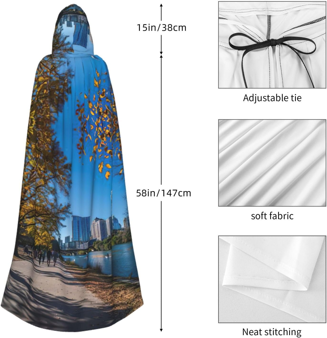 Realizzato in poliestere, questo mantello con stampa Austin Texas con cappuccio garantisce longevità e comfort. Le sue dimensioni ottimali assicurano una copertura completa per tutte le età, facendoti risaltare in qualsiasi evento. Che tu sia diretto per Halloween, un evento cosplay, un costume da palcoscenico, una festa in maschera, una festa a tema, un ballo o una convention di fumetti, questo mantello è una scelta ideale. Il suo design unico, completo di un grande cappuccio e cravatte collare. Inoltre, puoi dire addio ai metodi di pulizia complicati. Questo mantello con cappuccio con stampa Austin Texas è lavabile in lavatrice e a mano, offrendo una cura senza sforzo. Esci con stile e comfort con il nostro mantello con cappuccio, il tuo compagno per tutti gli eventi e le occasioni.