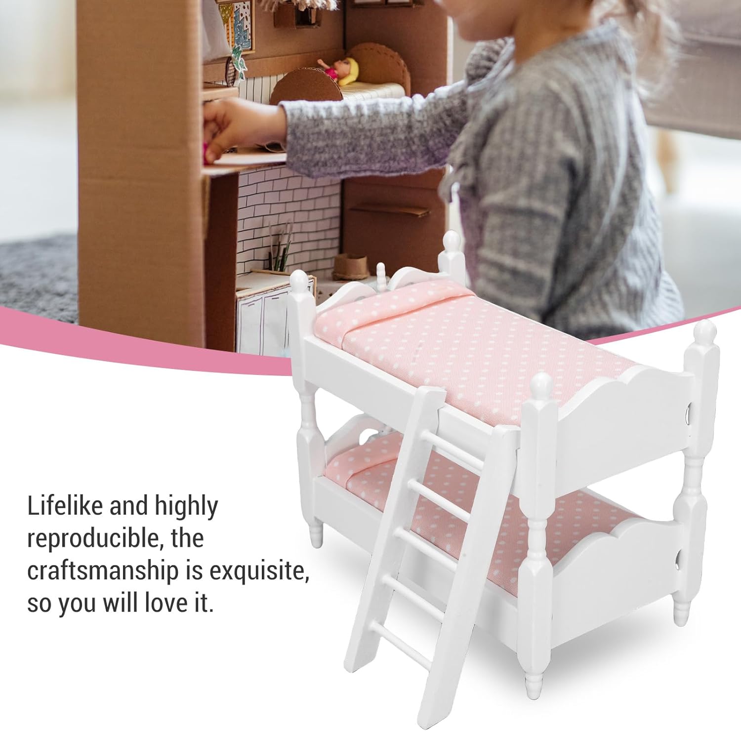 [Autentica scala 1:12] Goditi scene di gioco realistici con questo letto a castello da 5,7x3.3x4,7 pollici, per le camere da letto delle Box/Cover delle bambole standard. [Robusto design in legno] realizzato in compensato e tavola di densità con dettagli di cartoni animati stravaganti, migliorando le configurazioni dei giochi per bambini. [Design a più efficienza dello spazio] Massimizzare lo spazio verticale nelle camere delle bambole mentre mostra piccoli accessori per biancheria da letto con questo letto a castello. [Spark Imaginative Play] Incoraggiare la creatività e la narrazione con questo modello 3D durante il gioco di ruolo della famiglia delle bambole. [Ornamento di cartoni animati dettagliato] Illumina la cabina in miniatura o la scuola materna con questo letto a castello alto 14,5 cm con accenti dipinti a mano.