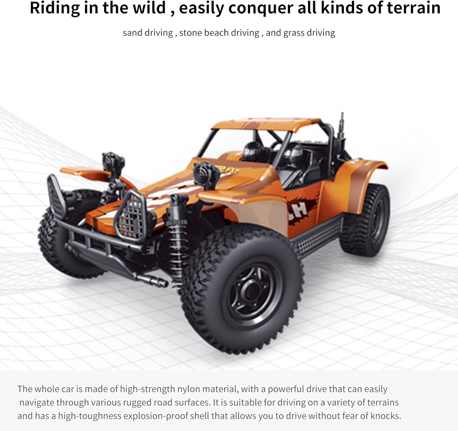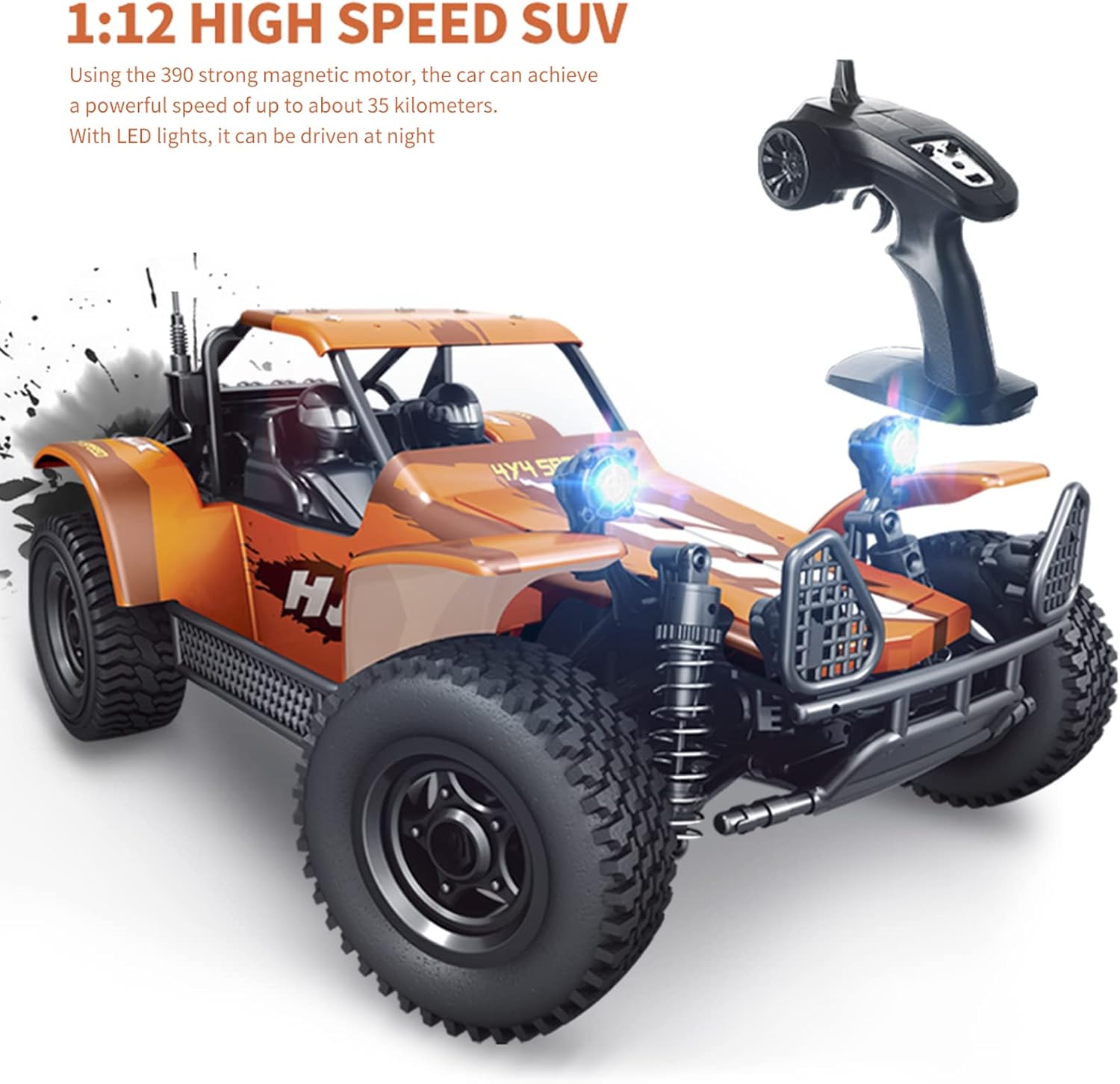 Materiali premium: questa auto a telecomando presenta un PVC a prova di esplosione e materiale ad alto contenuto di gth, che offre un'eccellente durata e. Puoi giocare con facilità e goderti una durata più lunga. Potente NCE: dotato del motore strumagnetico 390, questo veicolo fuoristrada a telecomando può raggiungere velocità fino a 35 km/h, offrendo un'esperienza fuoristrada esaltante ed elettrizzante. Controllo telecomando a lunga distanza: utilizzando la tecnologia di controllo remoto da 2,4 g, il veicolo può essere controllato da una distanza di oltre 100 metri, consentendo a più persone di giocare senza interferenze e fornendo un'esperienza fuoristrada più coinvolgente. Luce a LED cool: l'auto a telecomando è dotata di luci a LED, in modo da poter guidare in sicurezza di notte senza preoccuparti della visibilità, rendendo il tuo viaggio fuoristrada ancora più divertente. NCE fuoristrada superiore: la guida stabile del di sospensione su terreni ruvidi e irregolari. Che si tratti di sabbia, rocce o erba, questo veicolo fuoristrada a 4 ruote può gestire facilmente qualsiasi terreno, permettendoti di goderti il brivido della guida fuoristrada ovunque.