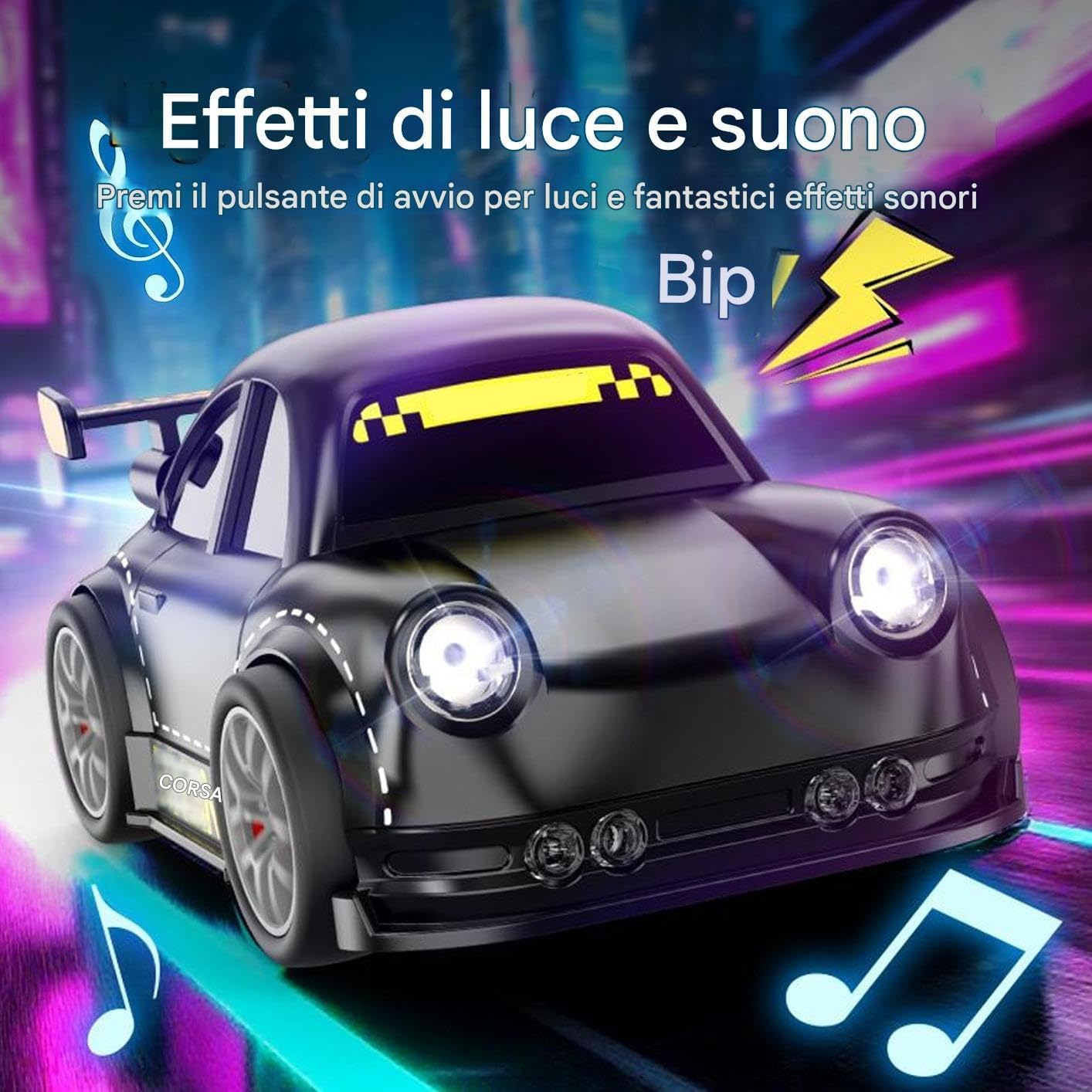 Manovre accattivanti: Le rotazioni e i drift a 360 il valore d'intrattenimento durante attività di gruppo, uscite nel weekend e ritrovi serali, lasciando tutti a bocca aperta con mosse stupefacenti che migliorano l'impatto visivo del gioco in ogni situazione Controllo Remoto di Precisione: Il telecomando di questa auto drift garantisce manovrabilità con trasmissione del segnale stabile e elevata resistenza alle interferenze, permettendo di divertirsi senza interruzioni anche in ambienti ricchi di rumore elettronico, ideale per l'utilizzo sia indoor che outdoor in diverse situazioni di gioco Regalo Eccezionale: Questa piccola auto RC consolida i legami tra amici durante le feste, regalando emozionanti esperienze di gioco dinamico per bambini e ragazzi che momenti felici insieme a casa o in eventi festivi, assicurando ricordi duraturi con funzionalità divertente Rilevamento Oggetti Avanzato: Grazie alla Modalità Intelligente, le auto RC rilevano ostacoli anteriori e manovrano agilmente intorno ad essi, assicurando una navigazione senza interruzioni in ambienti complessi come parchi o spazi interni per un'esperienza radiocomandata coinvolgente e continua Effetti Luce e Suono Immersivi: L'auto RC Drift offre effetti sonori dinamici e un LED che produce suoni del motore realistici con accensione immediata, migliorando l'emozione delle corse notturne e dei giochi al chiuso con un'esperienza avvincente