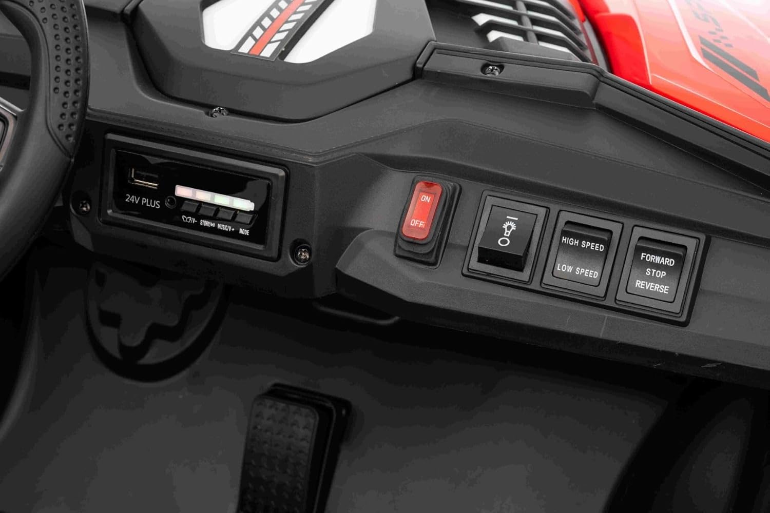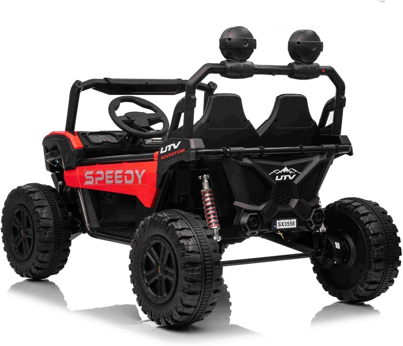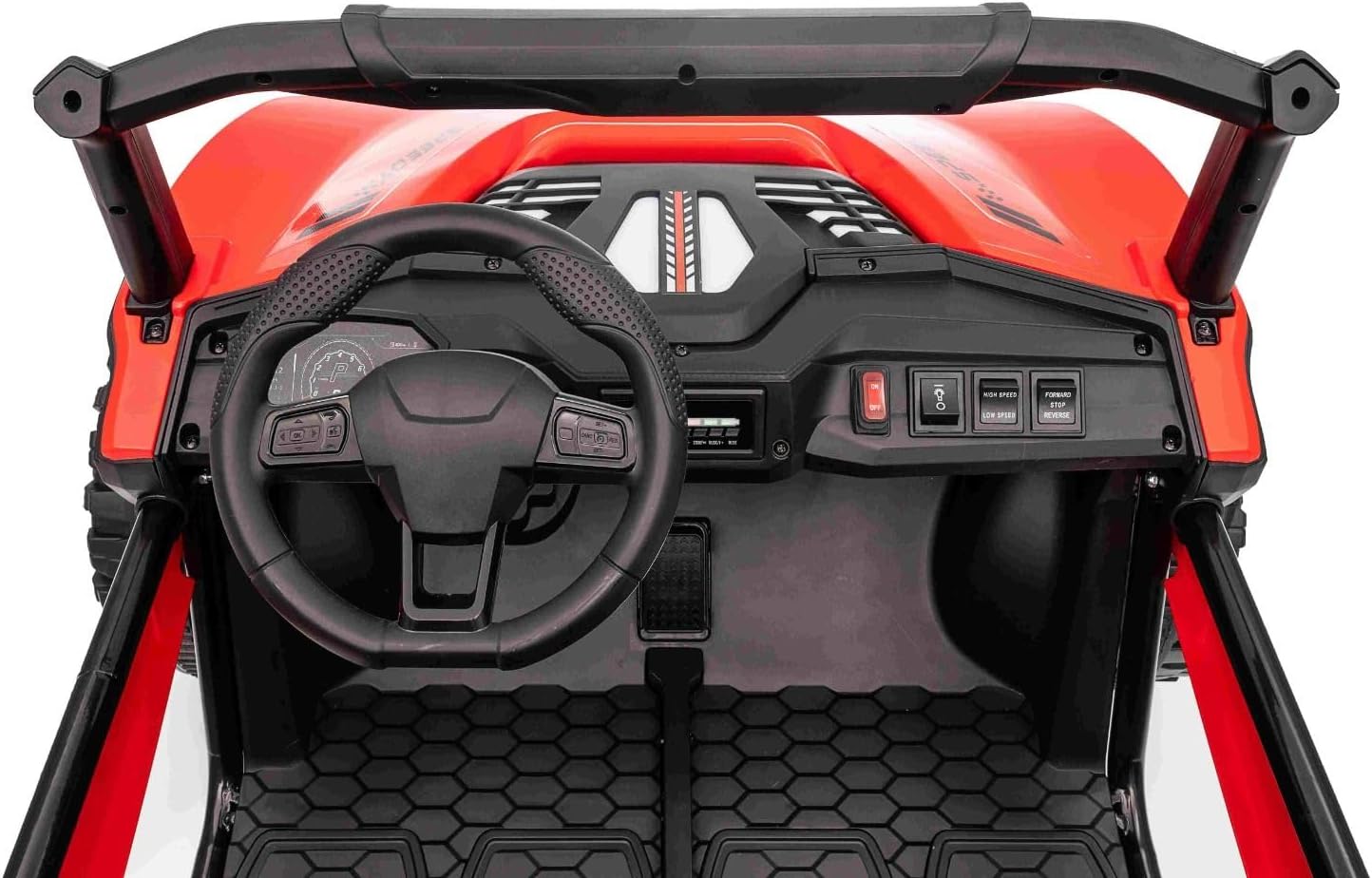 🚗 Auto elettrica per bambini 24V 4×4 trazione integrale - 4 motori da 45 W ciascuno (180 W di potenza totale), velocità 3-8 km/h, avviamento graduale e freno elettrico automatico per una guida sicura. 👦👧 Auto per bambini a 2 posti da 3-8 anni - dimensioni 123 × 79 × 82,7 cm, peso 27 kg, portata 60 kg (testata fino a 80 kg), robusta struttura in metallo, porte apribili, vano portaoggetti posteriore. 🔋 Batteria al litio 21,6 V / 5 Ah: ricarica rapida in 4-5 ore, tempo di guida fino a 3,5 ore, fino a 1000 cicli di ricarica, 70% più leggera delle batterie al piombo, più potenza e maggiore durata. 🎮 Telecomando da 2,4 GHz per genitori - funzione di frenata di emergenza, selezione della velocità (alta/bassa), visualizzazione della modalità di guida sul telecomando, pieno controllo parentale del veicolo per bambini. 💥 Veicolo fuoristrada per bambini con sospensioni: trazione 4×4, elevata altezza da terra, grandi ruote ammortizzate e sospensione dell'asse posteriore per una guida silenziosa anche su terreni irregolari. 🎶 Illuminazione multimediale e LED: LED anteriori e sul tetto, illuminazione del cofano, clacson, suoni del motore, volante con canzoni per bambini, lettore MP3 integrato con USB/AUX. 🛡️ Sicurezza e comfort nell'auto per bambini - Cintura di sicurezza regolabile, freno elettrico, avviamento graduale, indicatore del livello della batteria sul cruscotto, comfort di seduta di alta qualità.