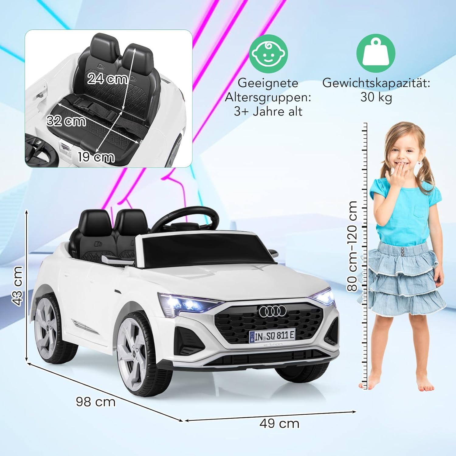 2 modalità di guida tra cui scegliere: questa auto elettrica per bambini può essere avviata con un pulsante, i bambini possono controllare l'auto per bambini con il pulsante avanti/indietro e il pedale. I genitori possono anche controllarlo tramite telecomando. Esperienza di guida divertente: con display di alimentazione, riproduzione musicale, selezione di brani e controllo del volume, questa auto per bambini con fari a LED luminosi può far divertire il tuo bambino con un sistema di intrattenimento integrato. La porta di ricarica nascosta consente una comoda ricarica della batteria per un divertimento senza fine. Avvio lento e ruote delicate - La funzione di avvio lento consente all'auto elettrica per bambini di avviarsi a velocità normale per proteggere il tuo bambino. Le ruote resistenti all'usura e antiscivolo con ammortizzatori assicurano che questa macchinina funzioni su diversi terreni. Potenti vantaggi e dettagli adatti ai bambini: questo veicolo elettrico è alimentato da una potente batteria da 12 V. È progettato per offrire ore di divertimento di gioco con una singola carica. Inoltre, lo spazioso sedile con cintura di sicurezza, pulsanti facili da usare, porte apribili con serratura e pedali a misura di bambino garantiscono un grande comfort. Un buon compagno per i bambini - L'auto da cavalcare Audi SQ8 con licenza ha una carrozzeria snella ed elegante che misura 98 x 49 x 43 cm (L x P x A), che è attraente per i bambini dai 3 anni in su. I bambini possono anche provare il divertimento di guidare e migliorare la loro forza, resistenza e coordinazione man mano che il loro bambino cresce!
