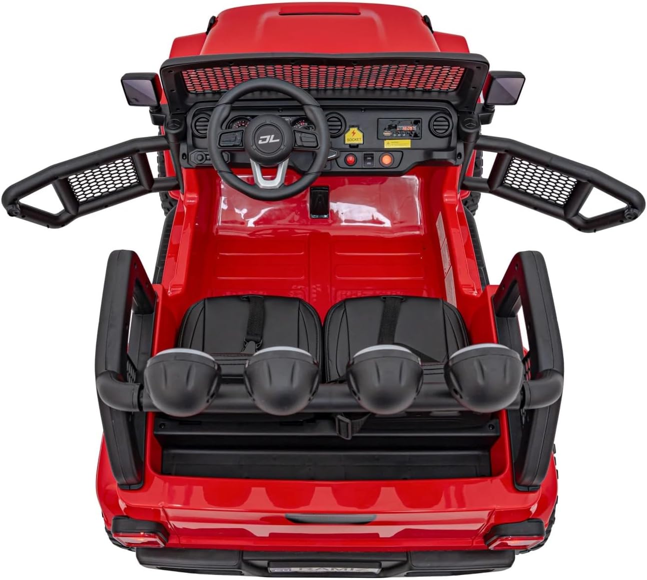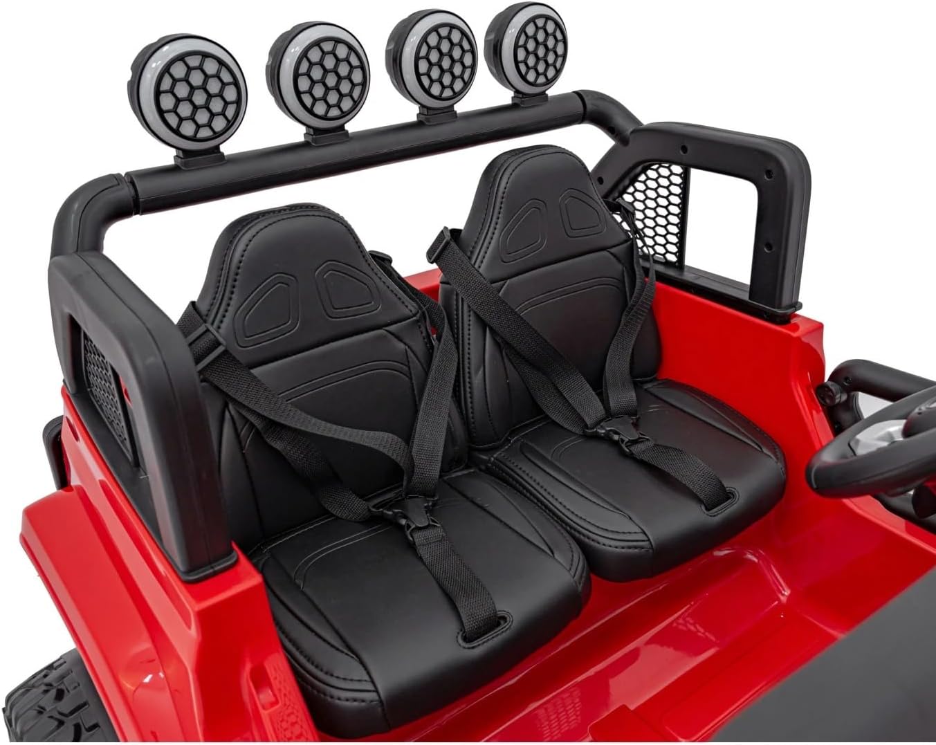 4 motori da 45 W di potenza. Telecomando 2 posti. Età consigliata per bambini fino a 7 anni. Ruote in gomma EVA e sedile in pelle. Cintura di sicurezza. Pannello audio MP3, melodie caricate, porta USB, ingresso AUX (possibilità di collegare un lettore mp3, uno smartphone), pulsanti con melodie e clacson sul volante, dimensioni: lunghezza 132 cm, larghezza 76 cm, altezza 72 cm,