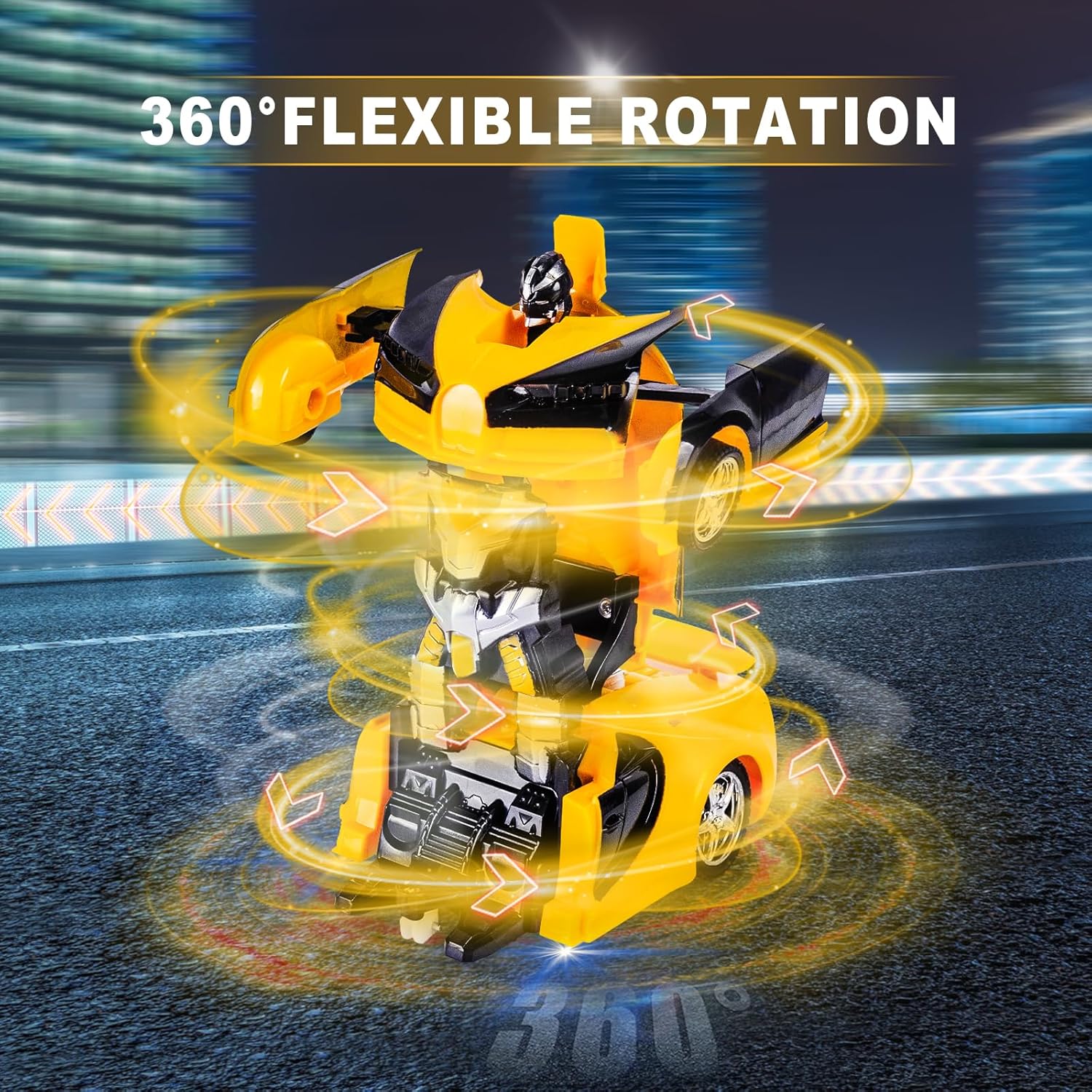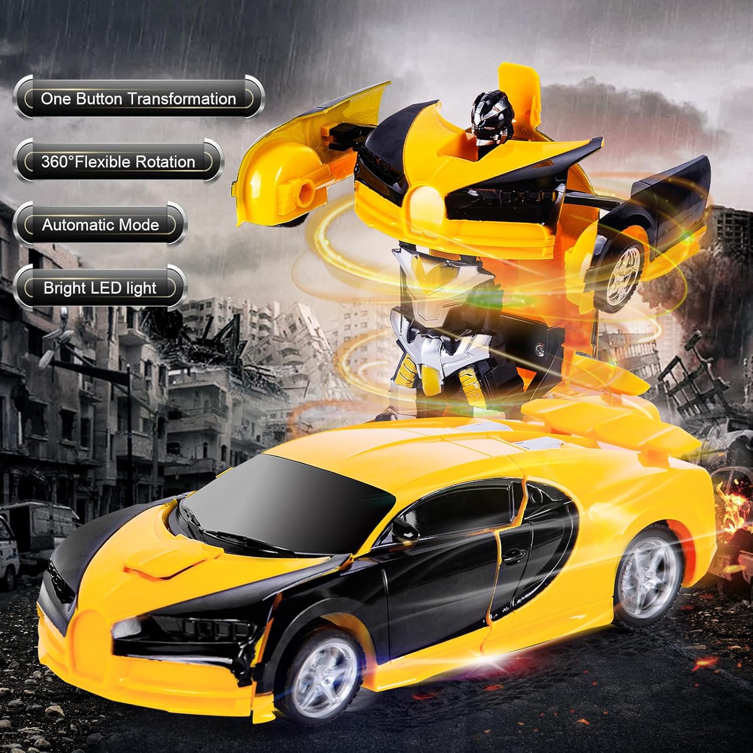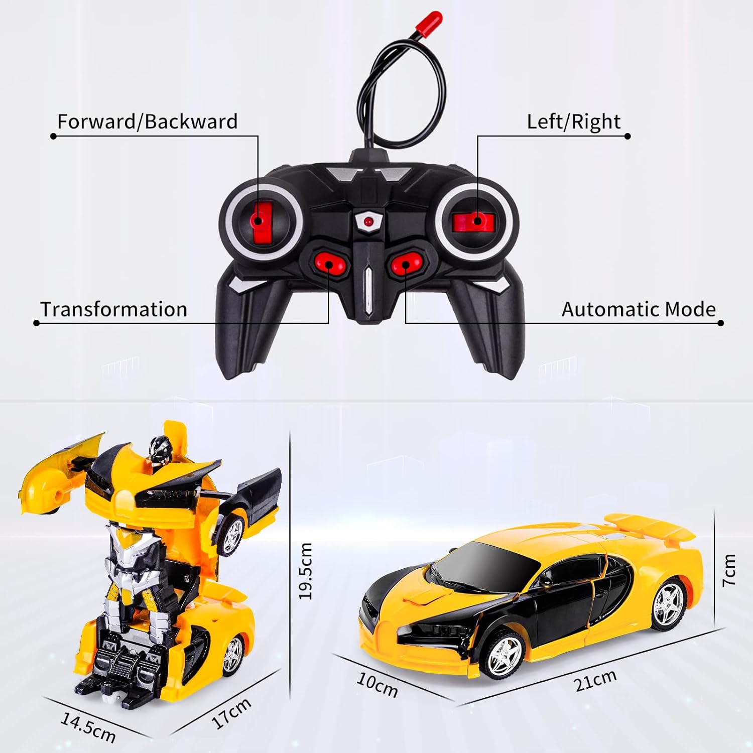 Una trasformazione chiave: basta premere il pulsante "Trasforma" sul telecomando, questa macchina robot si trasforma automaticamente e senza intoppi da robot a macchina. Design accattivante: colori vivaci, motore realistico e suono di accelerazione. Questa macchina telecomandata ha 5 ruote lisce e può ruotare di 360 gradi! Facile da usare: ci sono 2 pulsanti, il pulsante sinistro esegue la trasformazione, il pulsante destro esegue una danza. Può anche essere usata come un'auto RC con maniglie: destra, sinistra, avanti, retromarcia. Materiale eccellente: realizzato in plastica di alta qualità. La macchinina è durevole e resistente alle cadute. Divertiti senza preoccupazioni. Ottimo regalo per i bambini: regalo ideale per i bambini che amano le auto telecomandate e i giocattoli robot. Lo adoreranno sicuramente!