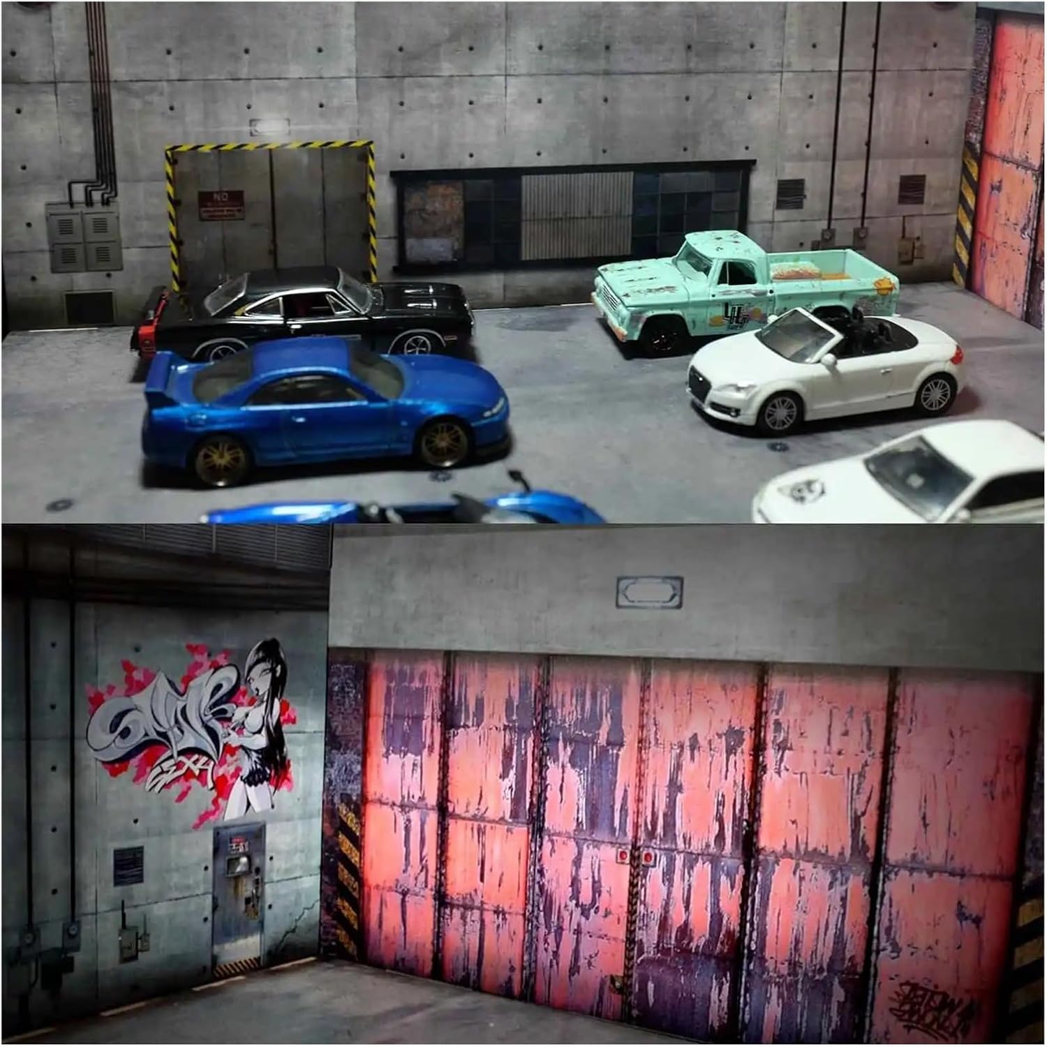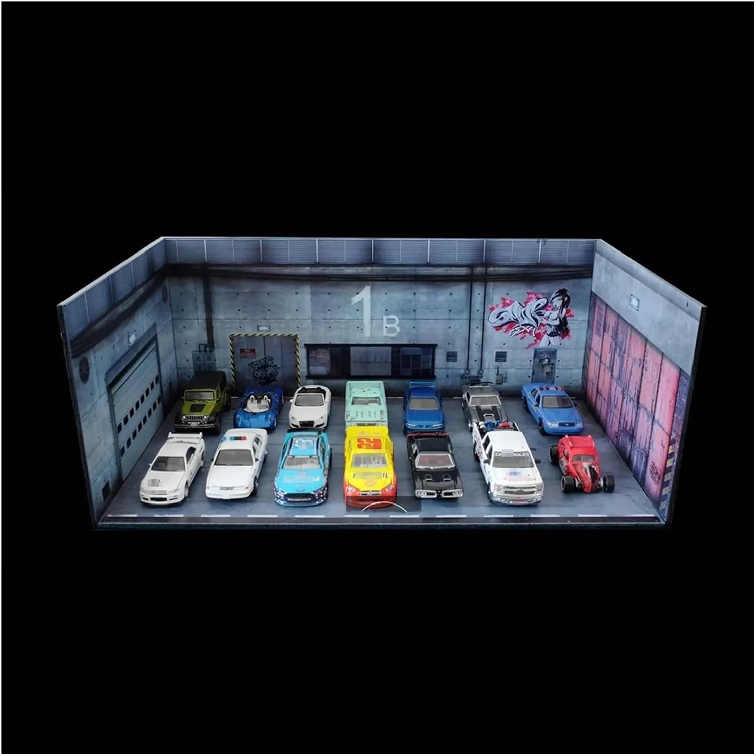 Auto Modello di Garage espositore Modello Diorama in Scala 1/64 Modello di Garage per Auto a Due Piani Illuminazione Parcheggio per Auto Sfondo Display Scena Modello Giocattolo