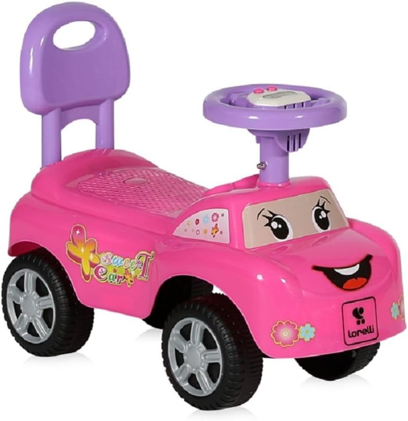 Cavalcabile in rosa per bambine a partire da 12 mesi, peso massimo 20 kg, faccia buffa, sedile comodo, funzione musicale e clacson sul volante, protezione antiribaltamento, adatto per uso interno ed esterno, schienale di sicurezza, utilizzabile anche come ausilio per la deambulazione