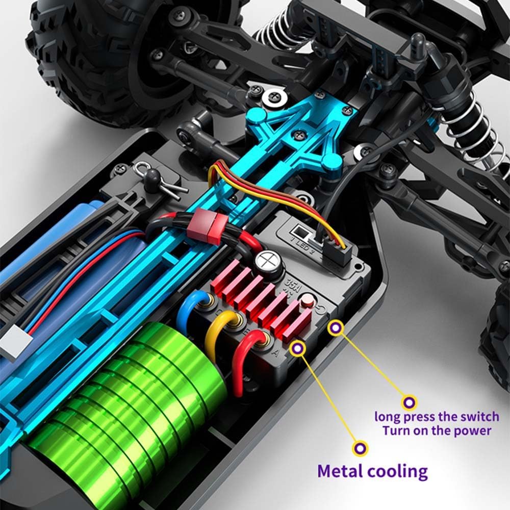 [70 km/h + motore senza spazzole 2840] Monster truck telecomandato in scala 1:16, dotato di un motore brushless 2840 che raggiunge una velocità massima di 70 km/h e si distingue per un'eccellente potenza di accelerazione, in modo da poter provare il brivido della guida ad alta velocità! [Accessori ad alte prestazioni] Questo passeggino Rc è dotato di un telaio professionale (protetto da piastre metalliche in lega di alluminio), un differenziale metallico, una tazza differenziale in metallo, alberi di trasmissione anteriore CVD in metallo, sospensioni posteriori in metallo, ruote posteriori in metallo, una seconda piastra in metallo, braccia anteriori e posteriori in metallo e alberi intermedi in metallo. Questi componenti metallici garantiscono un funzionamento preciso e stabile con una maggiore resistenza alle vibrazioni e protezione dalle cadute. [Alta stabilità] trazione integrale, sospensione a molla anteriore e posteriore, sospensione indipendente a doppio braccio trasversale e pneumatici Big Foot simulati forniscono una forte trazione, in modo che il veicolo possa gestire facilmente terreni pianeggianti, sabbia, fango ed erba. [2.4 GHz, ampio raggio, lunga durata della batteria] Il trasmettitore a pistola ha un controllo completamente digitale con funzioni proporzionali di gas e sterzo, che consentono una guida e una guida fluide e può controllare fino a 12 veicoli contemporaneamente. Portata: 120 metri. Il fuoristrada RC è dotato di una batteria agli ioni di litio da 7.4 V migliorata da 1500 mAh ad alta capacità, che offre fino a 18 minuti di autonomia per batteria. Per una maggiore durata, si consiglia di utilizzare tre batterie. [Adattabile a diversi tipi di terreno] Il robusto design a collisione frontale assorbe efficacemente gli urti e protegge la carrozzeria. Il design della ruota posteriore consente un facile sollevamento, abbassamento e rotazione per eseguire varie manovre acrobatiche. Il telaio in PVC a prova di esplosione, le ruote rialzate e i pneumatici fuoristrada simulati in combinazione con le sospensioni indipendenti garantiscono un'eccellente trazione e prestazioni fluide su terreni sabbiosi, erbosi e fangosi.