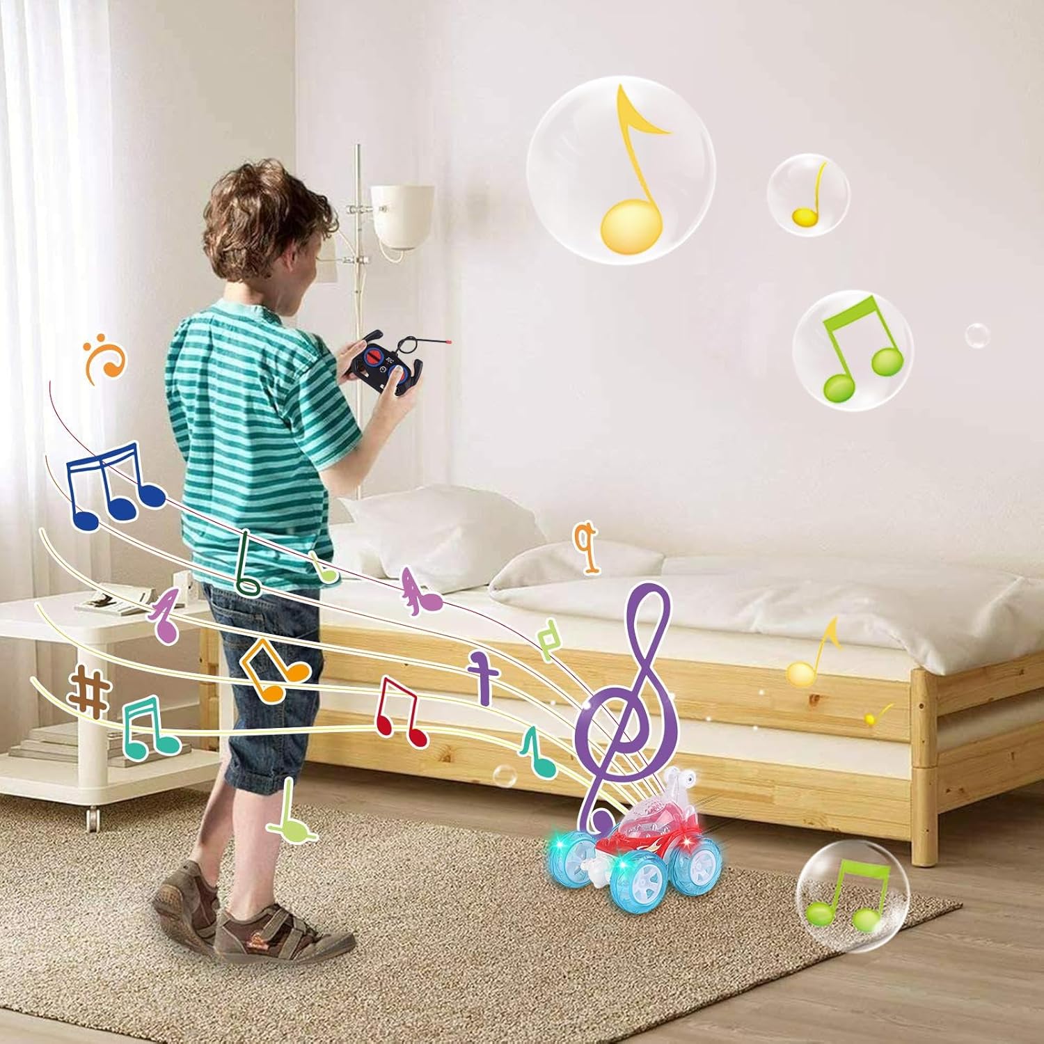 Immaginazione in azione: l'auto RC porta azione dinamica durante il gioco e aumenta la creatività consentendo agli utenti di progettare piste e sfide uniche. Promuove una mentalità avventurosa e incoraggia l'esplorazione su diverse superfici come erba, sabbia o asfalto per gare emozionanti. Fornisce ore di esperienze accattivanti che arricchiscono l'immaginazione attraverso la progettazione di binari individuali e manovre emozionanti. Materiale resistente: questa macchina telecomandata per bambini è progettata pensando alla sicurezza e utilizza materiali durevoli e innocui per proteggere le mani sensibili. È la scelta ideale per giocare in casa o in giardino senza preoccuparsi degli angoli acuti. Il design robusto garantisce un divertimento sicuro e lo rende un giocattolo perfetto per le avventure quotidiane. Giocattolo utile per i bambini: l'auto telecomandata ispira la creatività dei bambini attraverso emozionanti esperienze di gioco, funge da alternativa giocattolo divertente ed elegante, ideale da presentare in occasione di compleanni o vacanze per interazioni familiari memorabili. Questa macchina supporta lo sviluppo dell'immaginazione e della creatività in qualsiasi ambiente di gioco. Intrattenimento interattivo: con vivaci luci 3D e suoni musicali allegri, questa macchina RC promette un maggiore coinvolgimento sensoriale. Offre più divertimento se giocato al chiuso nei giorni di pioggia o all'aperto nel parco. Gli elementi interattivi promuovono l'esperienza di gioco e garantiscono momenti divertenti con la famiglia e gli amici. Abilità acrobatiche avvincenti: questa macchina telecomandata presenta acrobazie dinamiche come sollevamenti della ruota anteriore, rotazioni a 360 gradi e capriole impressionanti. Crea un'esperienza coinvolgente che ispira gioia ed eccitazione, a casa, al parco o durante le riunioni di famiglia. Le varie opzioni di acrobazie rendono ogni gioco un piacere speciale e aumentano in modo sostenibile il divertimento di giocare in diverse situazioni.