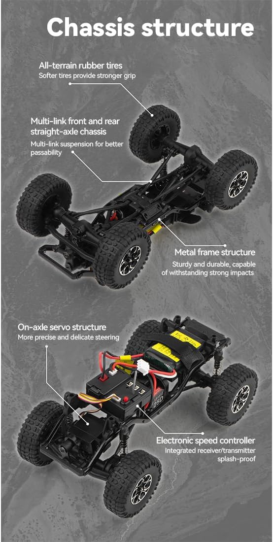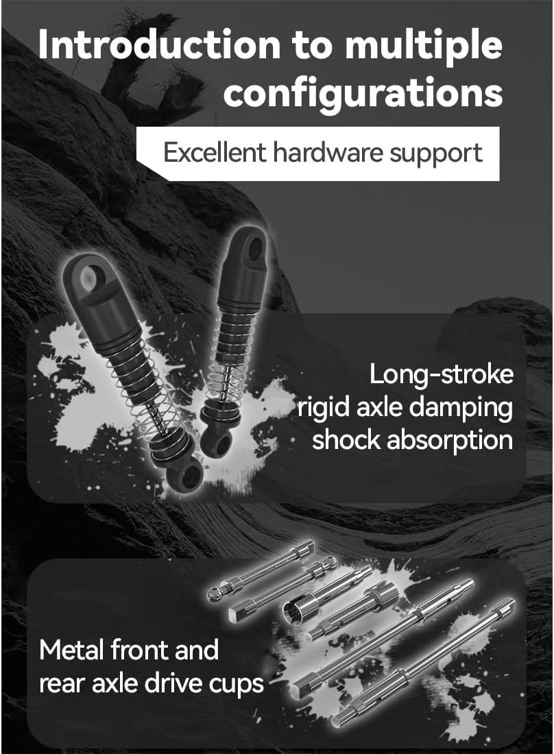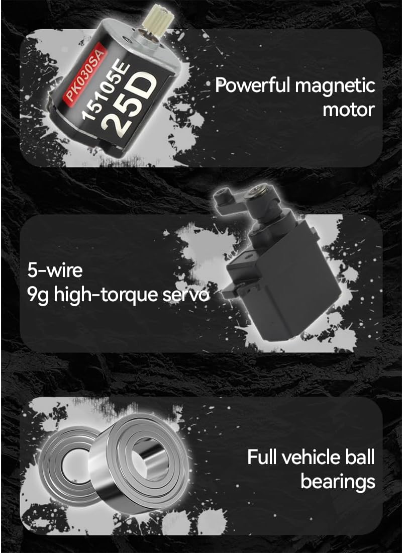 Sicurezza avanzata: questa auto RC fuoristrada in scala 1/24 è dotata di un sistema di ricarica bilanciato da 7,4 V con protezione intelligente contro sovraccarico, sovracorrente, surriscaldamento e bassa tensione, garantendo un funzionamento sicuro e affidabile sia per l'ESC che per la batteria 【Prevenzione dello stallo e modalità sleep】Dotato di protezione anti-stallo che interrompe l'alimentazione quando il motore è bloccato e si ripristina automaticamente. Il sistema entra in modalità di sospensione a bassissima potenza dopo 5 minuti di inattività, prolungando il tempo di standby Effetti di illuminazione a LED realistici: include luci LED anteriori e posteriori dettagliate con quattro modalità personalizzabili, costante, reattiva, lampeggiante e spenta, per un'esperienza di guida coinvolgente e interattiva Prestazioni fuoristrada superiori: progettato con un ampio angolo di avvicinamento e angolo di partenza per un'eccellente altezza da terra. Il cruise control a bassa velocità garantisce una maneggevolezza fluida, perfetto per principianti e appassionati Divertimento a lunga durata: goditi fino a 50 minuti di autonomia con la batteria agli ioni di litio da 7,4 V 500 mAh inclusa e una ricarica USB rapida in 1 ora. Il controllo proporzionale completo a 2,4 GHz garantisce una maneggevolezza precisa con una portata di oltre 80 metri