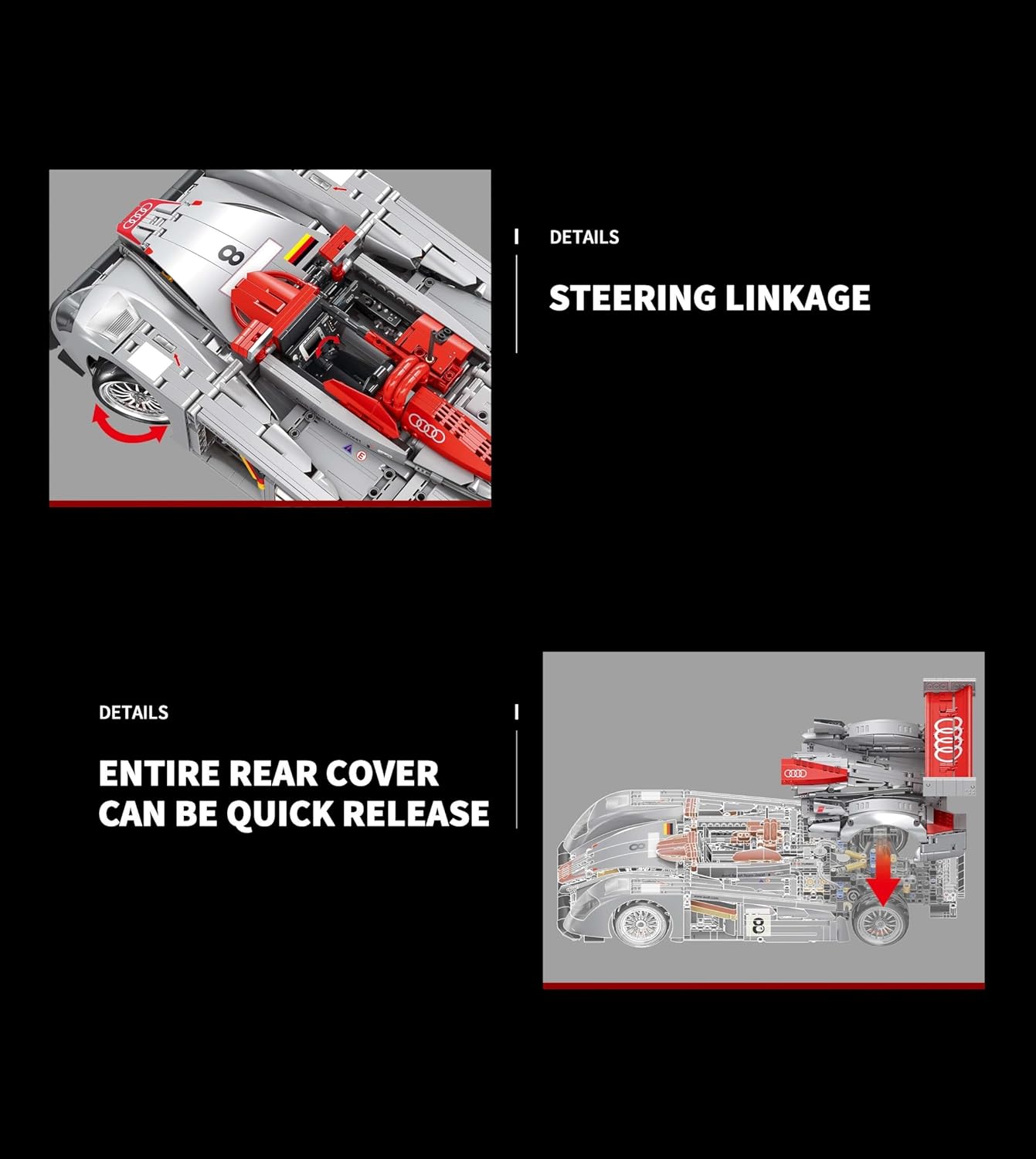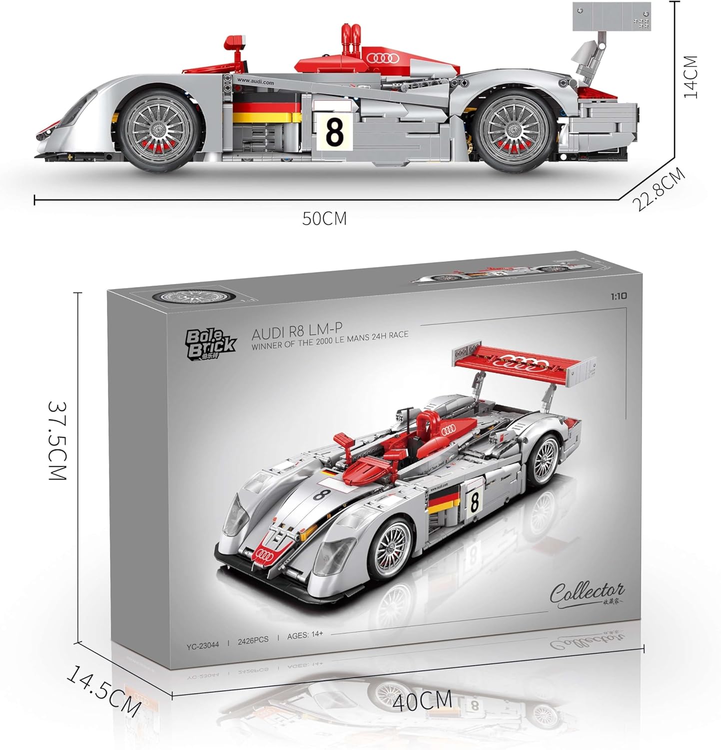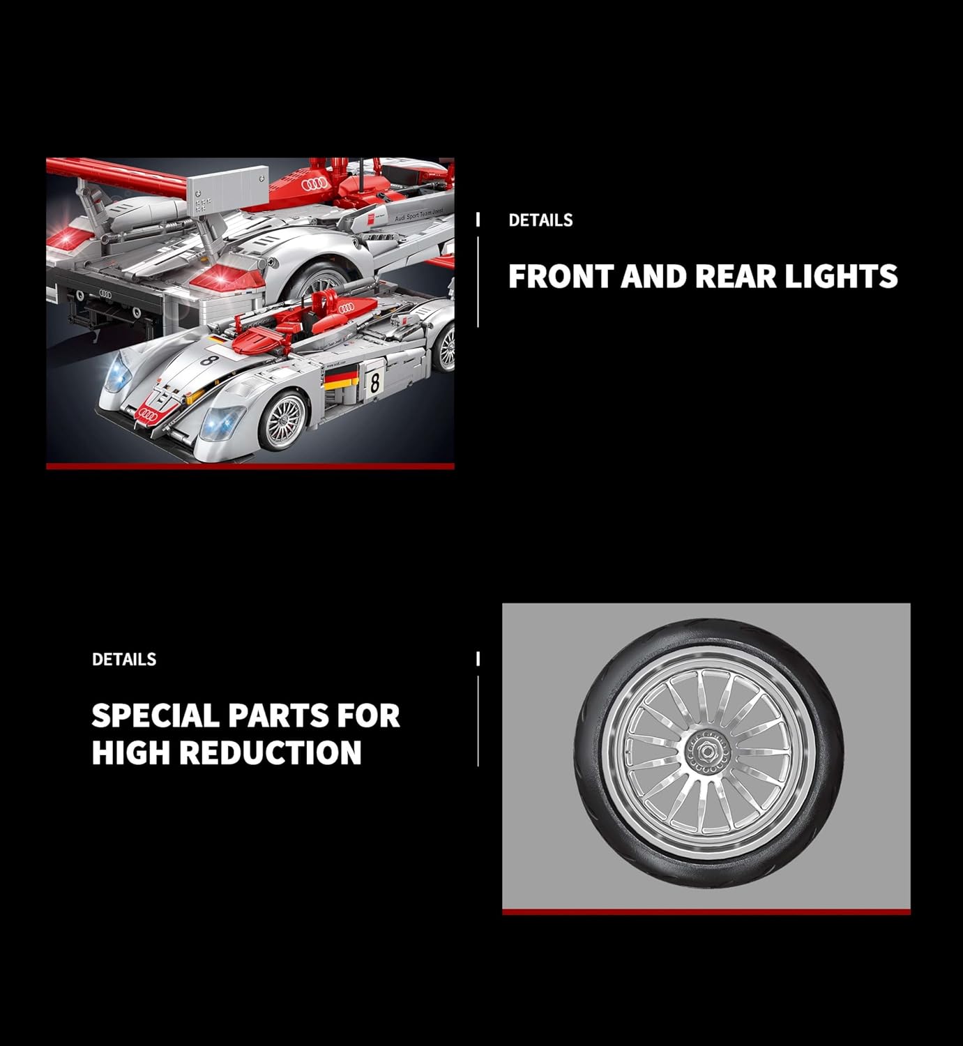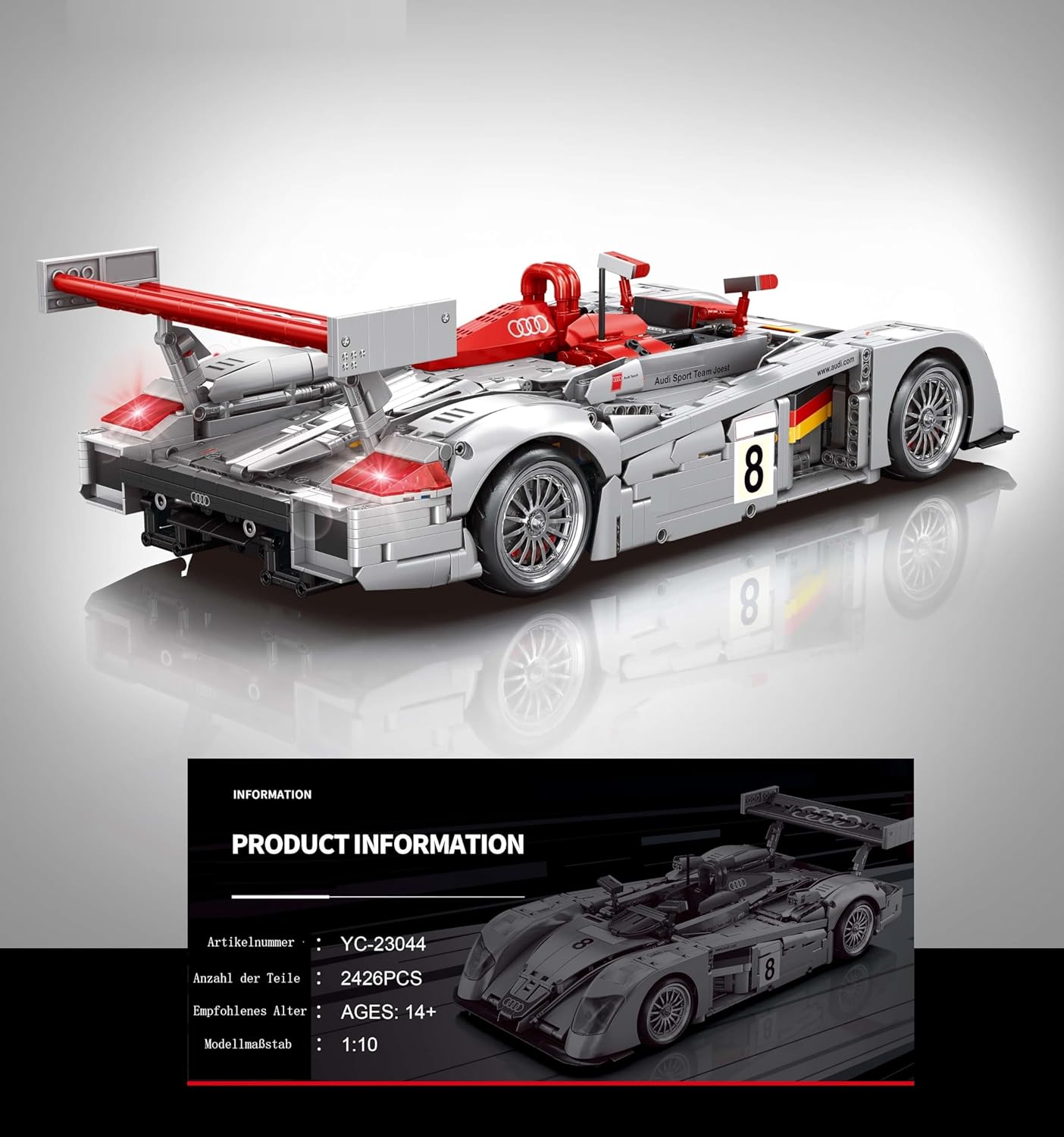 🚗【Scala 1:10】- Il modello è basato sulla "auto da corsa Audi R8 LMP 2000 24H Le Mans". Il massimo livello di dettaglio crea una replica sorprendentemente simile all'originale. Questo set tecnologico ti avvicina più che mai alla vera auto da corsa Audi R8 LMP 2000. Con i suoi dettagli di design fedeli all'originale, questo modello ispira l'immaginazione di ogni spettatore. Il modello dell'auto è di ca. 14 cm di altezza, 50 cm di lunghezza e 23 cm di larghezza. 📦【Consegnato nella confezione originale】- 🎁Con scatola originale! Include sacchetti di plastica numerati con parti singole, luce LED e istruzioni di montaggio stampate in modo molto chiaro. Le singole parti sono imballate separatamente a seconda delle fasi di costruzione, il che rende la costruzione molto semplice. Le istruzioni per la costruzione sono di facile comprensione e possono essere padroneggiate anche da persone meno esperte. Raccomandazione assoluta per gli appassionati di tecnologia esperti. 🙇【Esperienza di costruzione immersiva】- Con 2426 pezzi, questo è un progetto coinvolgente. Con grande attenzione ai dettagli, il modello è pieno di meccanica realistica. Una volta assemblati tutti i dettagli, ci sono molte funzioni meccaniche da scoprire. Scopri il mondo dell'ingegneria con questo kit modello di auto. Si muove in modo realistico e dispone di meccanismi realistici che introducono i giovani costruttori al mondo della tecnologia in modo comprensibile e realistico. ⚙️ 【Funzioni realistiche】 - Con molti dettagli tecnici, ad esempio le funzioni con un motore V8 con pistoni mobili, la sospensione della ruota anteriore e posteriore, lo sterzo funzionante, ecc. Goditi un'esperienza di costruzione accattivante con il kit modello tecnologico. Quindi scopri le caratteristiche originali dell'auto. 🎮/📱【Con set motore】 - Con 2 motori a L, 1 servomotore, 1 telecomando e 1 scatola batteria a 4 canali. Grazie ai 3 motori e 1 vano batteria, l'auto può essere gestita completamente tramite il telecomando in dotazione. Il modello può essere controllato anche tramite l'app. Grazie all'attenzione ai dettagli è anche un bel modello per la vetrina. 🎁【Perfetto per gli amanti delle auto】- Questo squisito kit modello tecnologico colpisce per la sua eccezionale attenzione ai dettagli ed è stato sviluppato appositamente per gli appassionati di auto. Un progetto di costruzione utile per te o un regalo di compleanno o di Natale molto speciale per qualcuno a cui tieni molto. Con il kit in regalo non puoi assolutamente sbagliare. ♻️【Compatibile con altri marchi principali】 - Questi blocchi di serraggio sono compatibili con altri marchi principali, hanno le stesse dimensioni e una forza di serraggio buona, a volte anche più forte, rispetto alle pietre danesi originali. Le tue dita non fanno male dopo ore di costruzione. Ti prudono ancora le dita? Allora andiamo! Grazie alle semplici istruzioni per la costruzione incluse, il divertimento della costruzione può iniziare subito. ✅ 【Garanzia Auforua】 - Le parti sono tutte realizzate con stampi di alta qualità e alta precisione e materiali ABS ecologici, con trattamento superficiale liscio e senza sbavature, ogni piastra è fissa, nessun odore particolare ed è rispettosa dell'ambiente. Normalmente tutte le parti sono incluse, ma se alcune parti vengono perse o danneggiate, invieremo parti di ricambio gratuite.