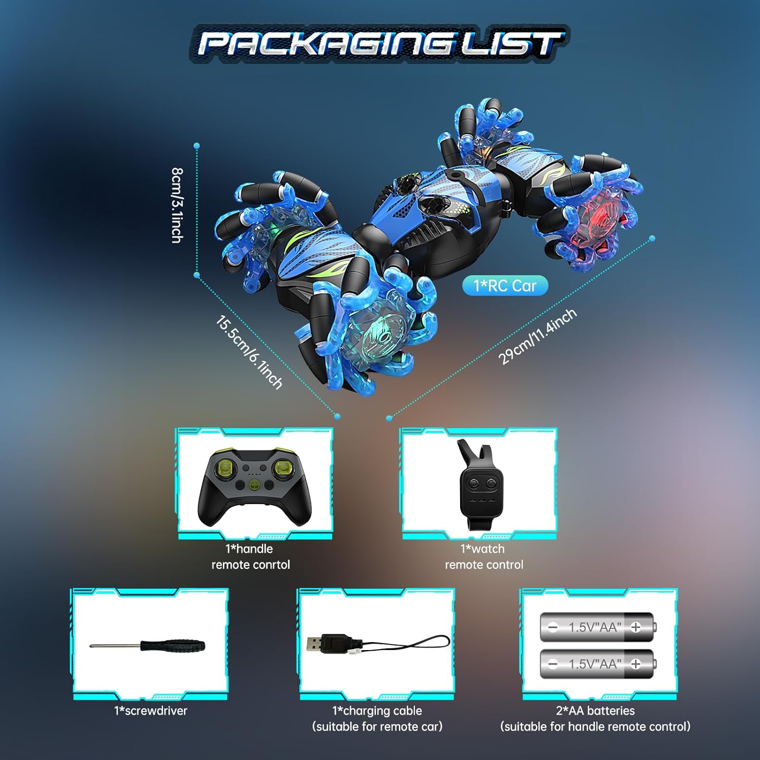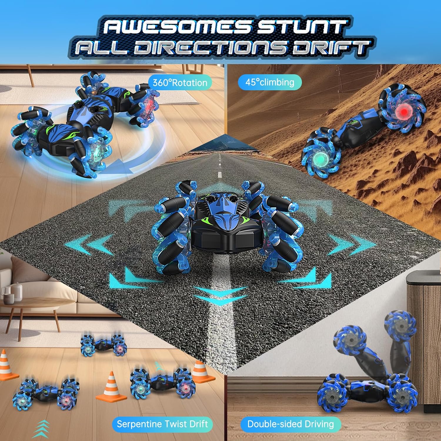 ️【Auto telecomandata All Terrain 2024】L'auto telecomandata è dotata di una carrozzeria fresca a colori. Ha fari freschi, luci di pneumatici, accompagnati da musica dinamica. Questa auto telecomandata a 4 ruote motrici con rilevamento di gesti può facilmente muoversi in tutte le direzioni, può anche guidare in doppio lato. Caratteristiche di arrampicata, torsione, anticipo e rinculo, rotazione a 360 gradi e inversioni a doppia faccia a 180 gradi. 【Doppio telecomando da 2,4 GHz】L'auto telecomandata viene fornita con un telecomando a 2,4 GHz e un orologio a rilevamento dei gesti. Con la tecnologia di frequenza anti-interferenza a 2,4 GHz e la distanza di controllo massima di 40 m per il telecomando, i bambini possono giocare insieme con i loro amici. 40 minuti di tempo di gioco lungo: auto telecomandata per bambini 5 anni dotata di 2 batterie ricaricabili da 3,7 V 500 mAh, ognuna offre 20-30 minuti di tempo di gioco, i bambini possono godere di circa 40-60 minuti di guida divertente. La batteria può essere completamente carica in 2 ore.