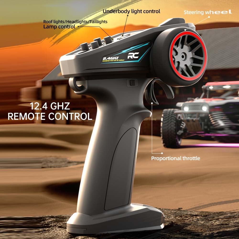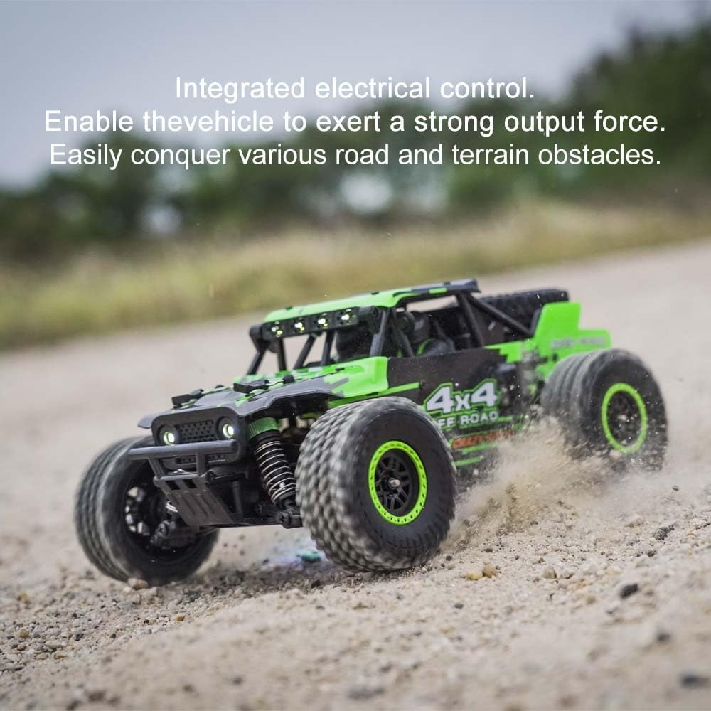 [Motore a spazzola di carbonio RC370] Questo veicolo radiocomandato è dotato di un motore a spazzola di carbonio RC370 ad alta velocità con un potente magnete (protezione magnetica + dissipatore di calore) che raggiunge una velocità massima di 40 km/h. [Controllo del gas pieno] Il pieno gas/sterzo consente un controllo continuo della velocità per una sensazione di guida autentica. La carrozzeria presenta un design strutturato simulato con una guaina in PVC ad alta resistenza e resistente agli urti. [Autonomia estesa] Alimentato da una batteria agli ioni di litio da 7,4 V-600 mAh (connettore T), che fornisce fino a 15 minuti per cella. Si consiglia di utilizzare tre batterie per un divertimento prolungato. [Alta stabilità] trazione integrale con sospensione anteriore/posteriore e doppio braccio trasversale sospensione. I pneumatici simulati Monster Truck offrono una presa eccezionale e affrontano facilmente terreni pianeggianti, sabbia, fango ed erba. [Componenti ad alte prestazioni] Piastra in metallo a doppio fondo, rivestimento in metallo sul sottoscocca, telaio in metallo, alberi di trasmissione in metallo in tutto il veicolo e dissipatore di calore del motore in alluminio migliorano la resistenza complessiva e l'affidabilità e garantiscono una maggiore stabilità durante la guida fuoristrada.
