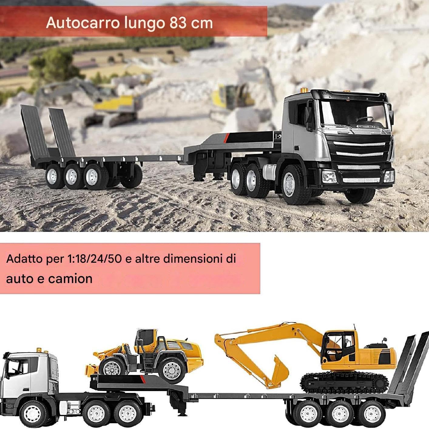 Scatena la creatività: espandi i tuoi orizzonti con il nostro semirimorchio giocattolo telecomandato, dotato di pianale da 83 cm che può trainare vari veicoli da costruzione come escavatori, bulldozer e autocarri con cassone ribaltabile Ampio utilizzo: per un'esperienza di guida più realistica che i bambini adoreranno, questo semirimorchio telecomandato è dotato di svolte in avanti/indietro e di 270 gradi a sinistra/destra, completo di luci ed effetti sonori, camion a pianale multiuso per più avventure Robusto materiale ABS: offrendo un design visivamente sorprendente, il nostro semirimorchio giocattolo telecomandato è costruito con robusto materiale ABS, offrendo ai bambini un'esperienza di gioco robusta ed emozionante Esperienza di gioco migliorata: il nostro giocattolo per semirimorchio telecomandato è dotato di una funzione di codifica unica in cui ciascun telecomando è programmato per un solo veicolo, consentendo a più giocatori di essere coinvolti contemporaneamente senza conflitti di segnale Regalo premuroso: favorendo la creatività e promuovendo le abilità pratiche, questo giocattolo per semirimorchio è il miglior regalo per i bambini, incoraggiando il gioco interattivo. È un ottimo regalo per compleanni o Natale, aiutando i bambini ad affinare le proprie abilità
