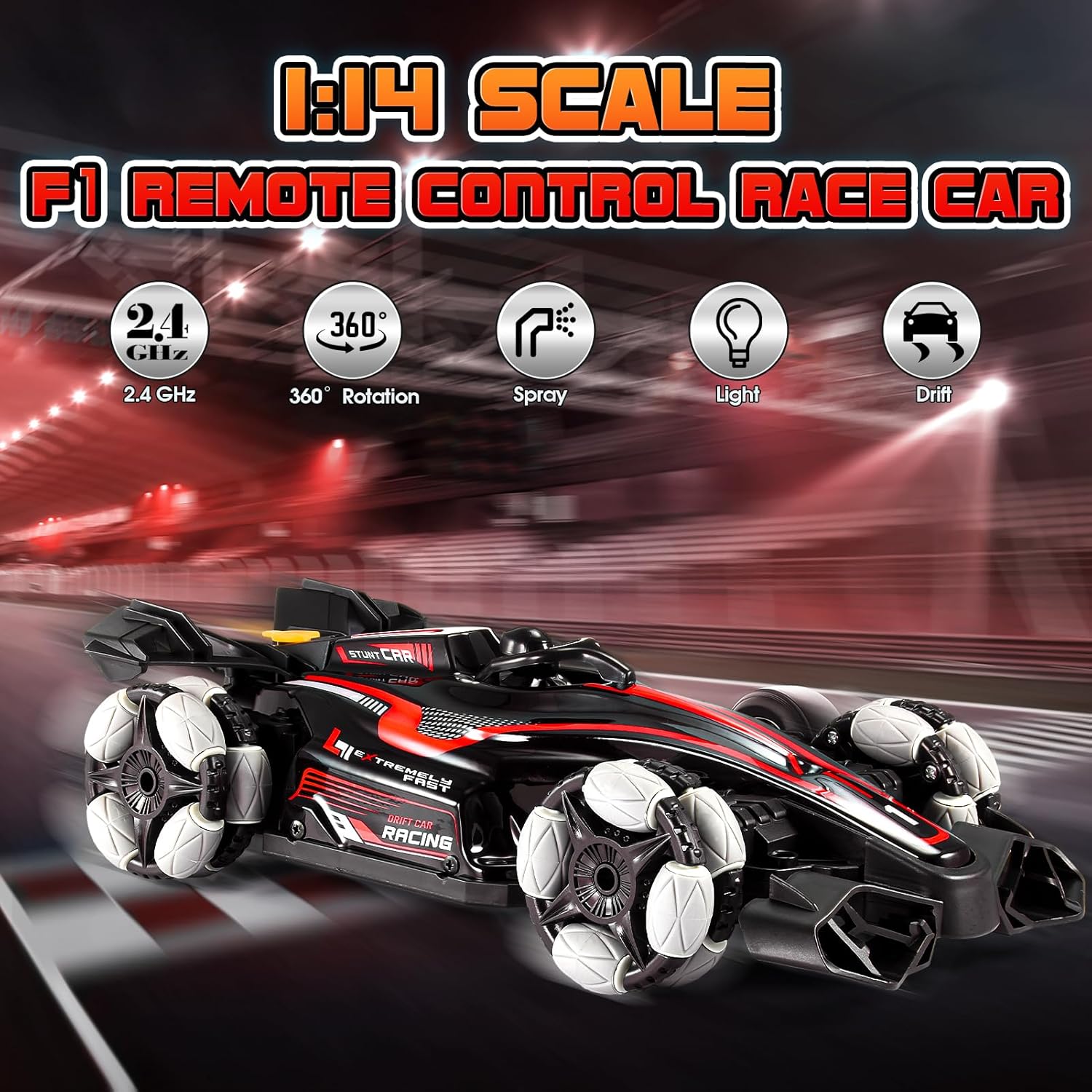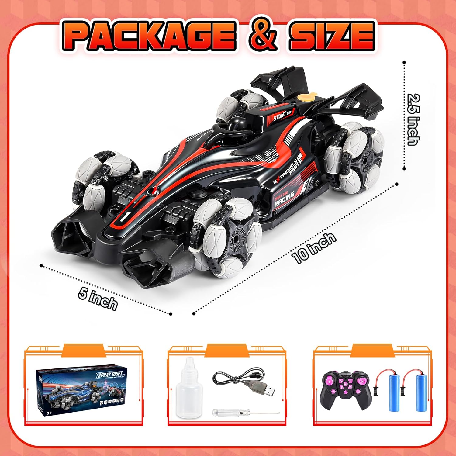 Alta Manovrabilità - Telecomando 2.4GHz per accelerazione lineare, derapate e rotazioni a 360° su asfalto/erba/terra. Effetti Luce & Vapore - Fari posteriori LED con sistema fumogeno per un'esperienza di gara emozionante. Design Aerodinamico - Linee sportive, materiale ABS resistente agli urti e ruote multiterreno. Giocattolo Sicuro CE - Materiali atossici, bordi arrotondati. Regalo perfetto per Natale/compleanni (bambini/bambine). Pronto all'Uso - Batteria ricaricabile USB inclusa (30+ minuti di autonomia).