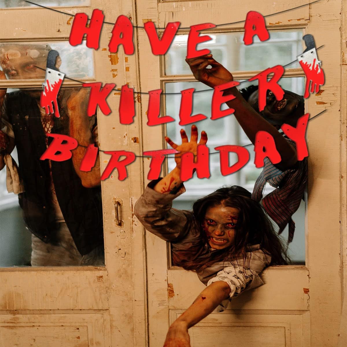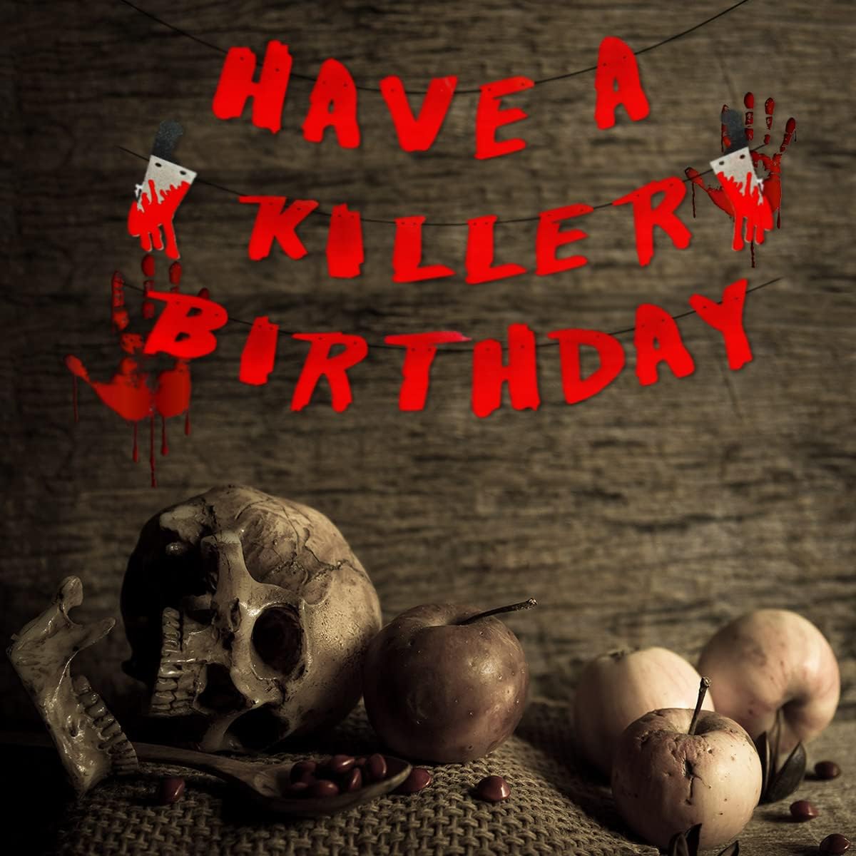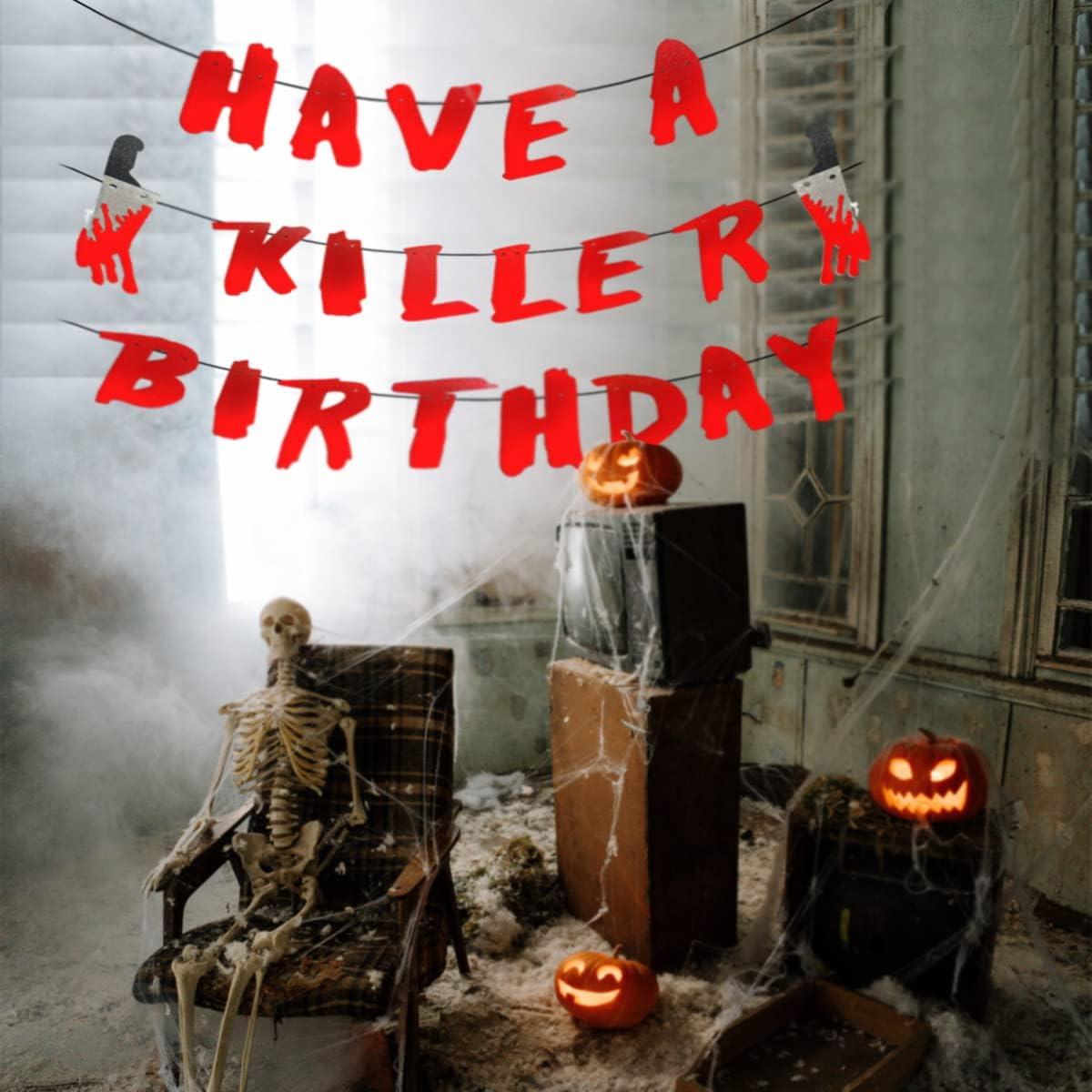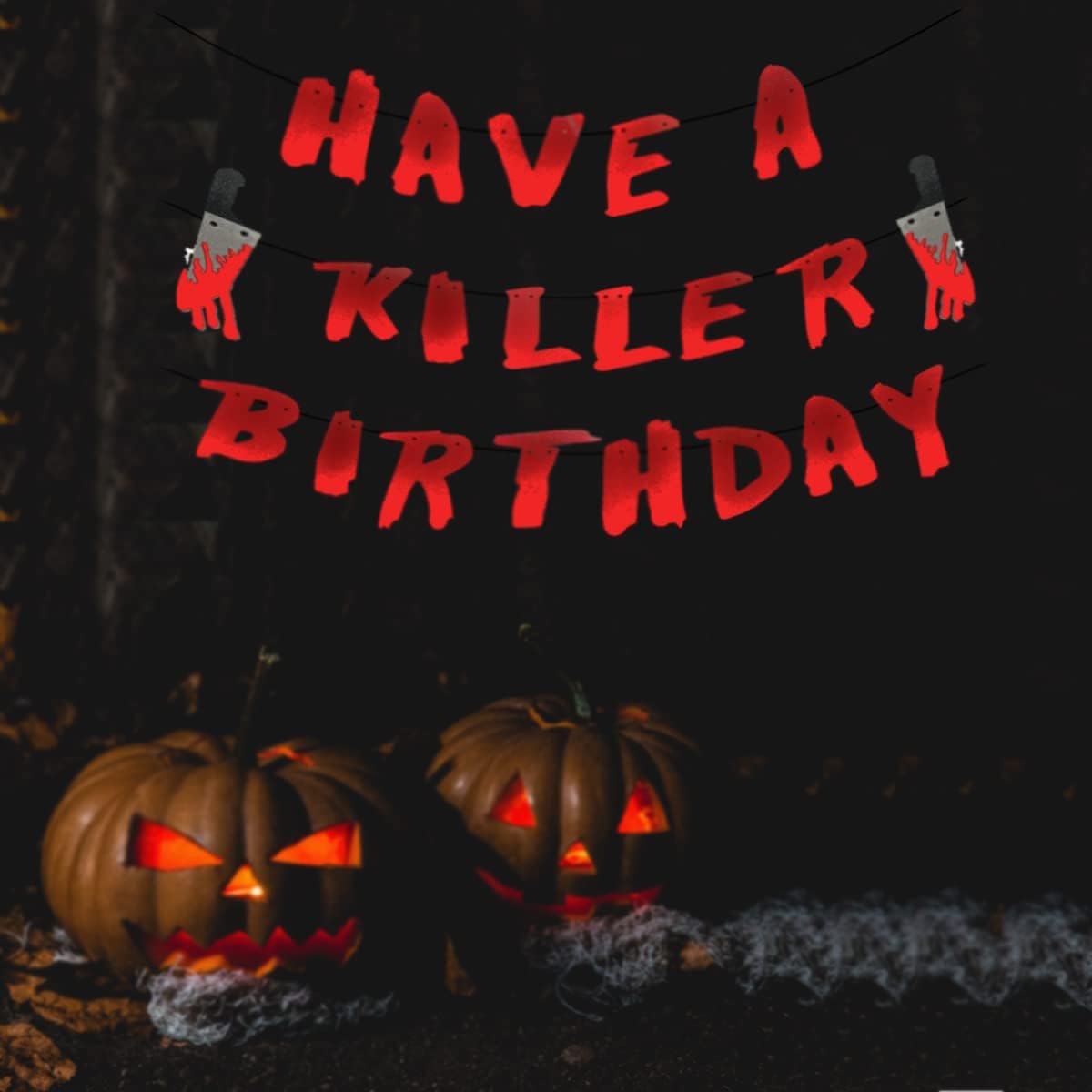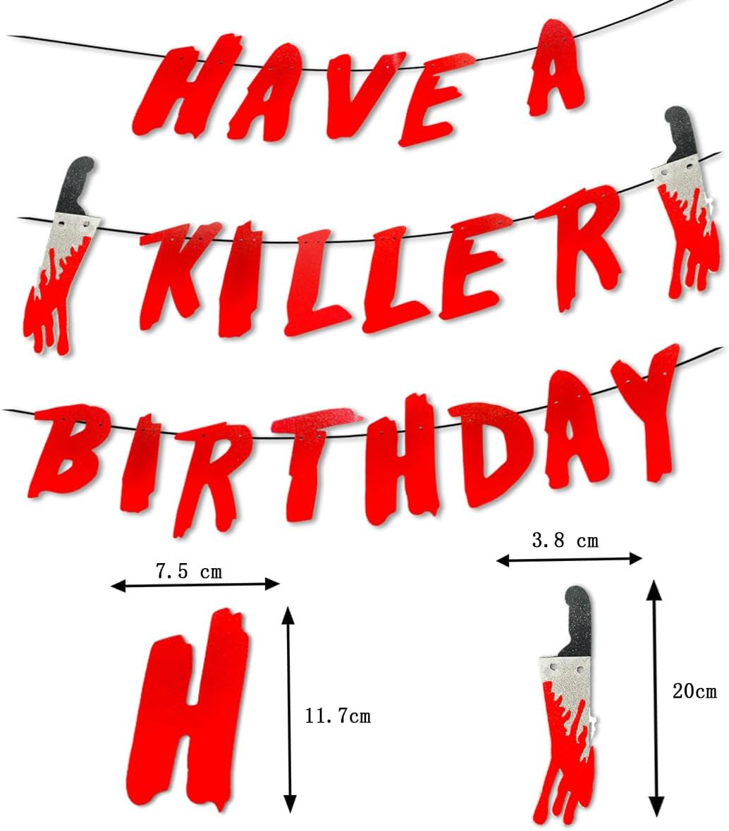 Contenuto della confezione: uno striscione "Have a Killer Birthday" con 2 coltelli glitterati insanguinati. Una combinazione perfetta per immergere la tua festa di compleanno di Halloween in un'atmosfera terrificante e indimenticabile. Materiali di alta qualità - Realizzata in cartone glitterato di alta qualità, la ghirlanda è durevole, resistente al colore e riutilizzabile. Ogni lettera misura circa 14,5 x 7,5 cm e ogni coltello insanguinato circa 20 x 3,8 cm. Facile da montare: montaggio fai da te in pochi secondi: basta infilare il nastro attraverso i fori delle lettere. Perfetto da appendere al muro, alla finestra, alla tenda o in giardino, dove vuoi! Decorazione di compleanno sul tema Halloween - Il design spettrale, combinato con realistici coltelli glitterati, è perfetto per il compleanno di un bambino o di un adulto sul tema dell'orrore o di Halloween. Perfetto come sfondo fotografico o elemento decorativo centrale. Un must per le feste: dona immediatamente al tuo evento un'atmosfera da film horror! Ideale per feste di compleanno con zombie, vampiri, assassini mascherati o case infestate: i tuoi ospiti non lo dimenticheranno.