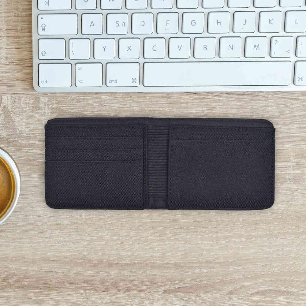 Portafoglio piegato con scomparti interni per carte e scomparto per banconote Dimensioni: 12 cm x 10 cm x 1,4 cm Stampato su entrambi i lati con un design unico Questo prodotto ha un design sottile e contemporaneo Tasca per banconote flessibile con struttura elastica