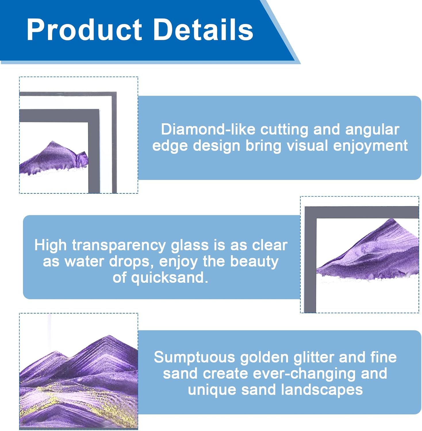 ⌛ Arte unica della sabbia in movimento: Ad ogni rotazione, si forma un paesaggio di sabbia mozzafiato. Piccole particelle di sabbia scorrono creando continuamente nuovi motivi, rivelando scene affascinanti ogni volta. Quest'opera d'arte aggiunge un fascino unico alla tua casa o al tuo ufficio. ⌛ Artigianato eccezionale: La nostra immagine di sabbia in movimento è realizzata in vetro rotondo di alta qualità, che dà vita al flusso affascinante della sabbia. La base in legno naturale, fatta a mano, presenta forme di montagne ondulate. Ogni pezzo è realizzato con precisione da artigiani esperti in ogni dettaglio. ⌛ Applicazione semplice: Per apprezzare il fluire incantevole della sabbia, scuoti leggermente l'immagine per appiattire la sabbia e creare piccole bolle d'aria. Poi, girala e la sabbia scorrerà graziosamente tra le bolle, rivelando un effetto di sovrapposizione affascinante. Questo processo è facile e ti permette di godere della bellezza di quest'arte senza sforzo. ⌛ Decorazione perfetta per l'ufficio: Questo paesaggio di sabbia non è solo una delizia per gli occhi, ma anche una decorazione ideale per l'ufficio. Aiuta a ridurre lo stress e favorisce il rilassamento, migliorando la produttività. Che sia sulla tua scrivania o in un salotto, porta un tocco di serenità nel tuo spazio di lavoro. ⌛ Regalo perfetto e servizio clienti di qualità: La nostra opera d'arte della sabbia in movimento è il regalo ideale per amici, familiari o occasioni speciali. Offriamo anche un eccellente servizio clienti per garantire un'esperienza d'acquisto fluida. Se hai domande, siamo sempre disponibili ad aiutarti.