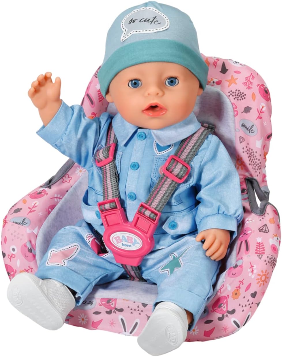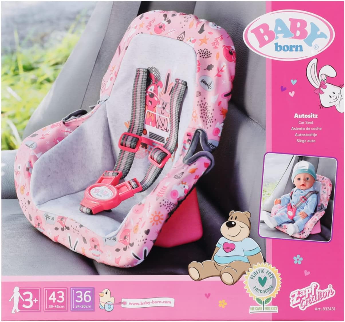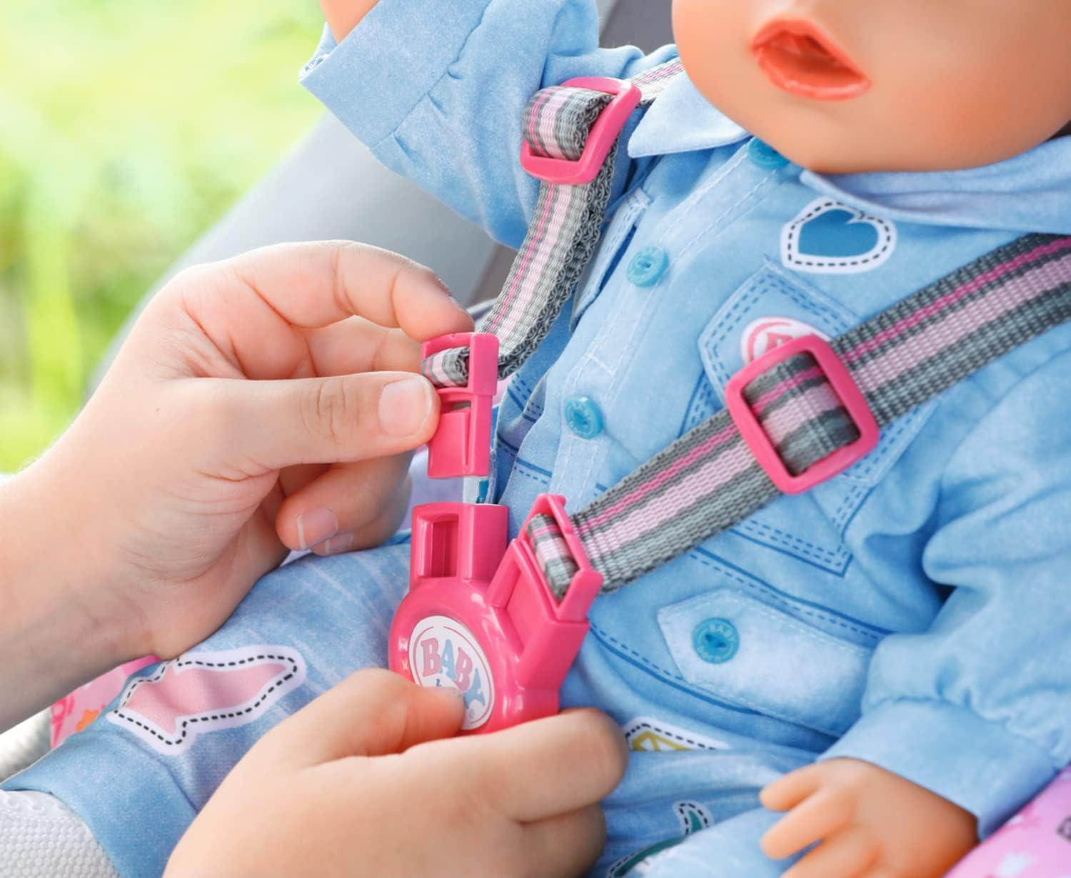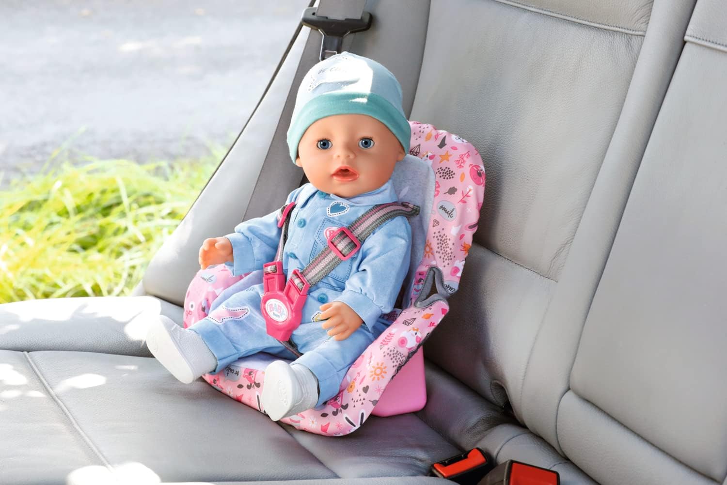 Il seggiolino auto BABY born è l'accessorio perfetto per portare le tue bambole in giro per la città con la famiglia Questo seggiolino alla moda è dotato di un rivestimento in tessuto colorato che può essere facilmente rimosso e lavato con una cintura di sicurezza integrata Perfetto per i viaggi in famiglia! Con guida per cintura di sicurezza da agganciare alla tua auto Adatto per bambole fino a 43 cm