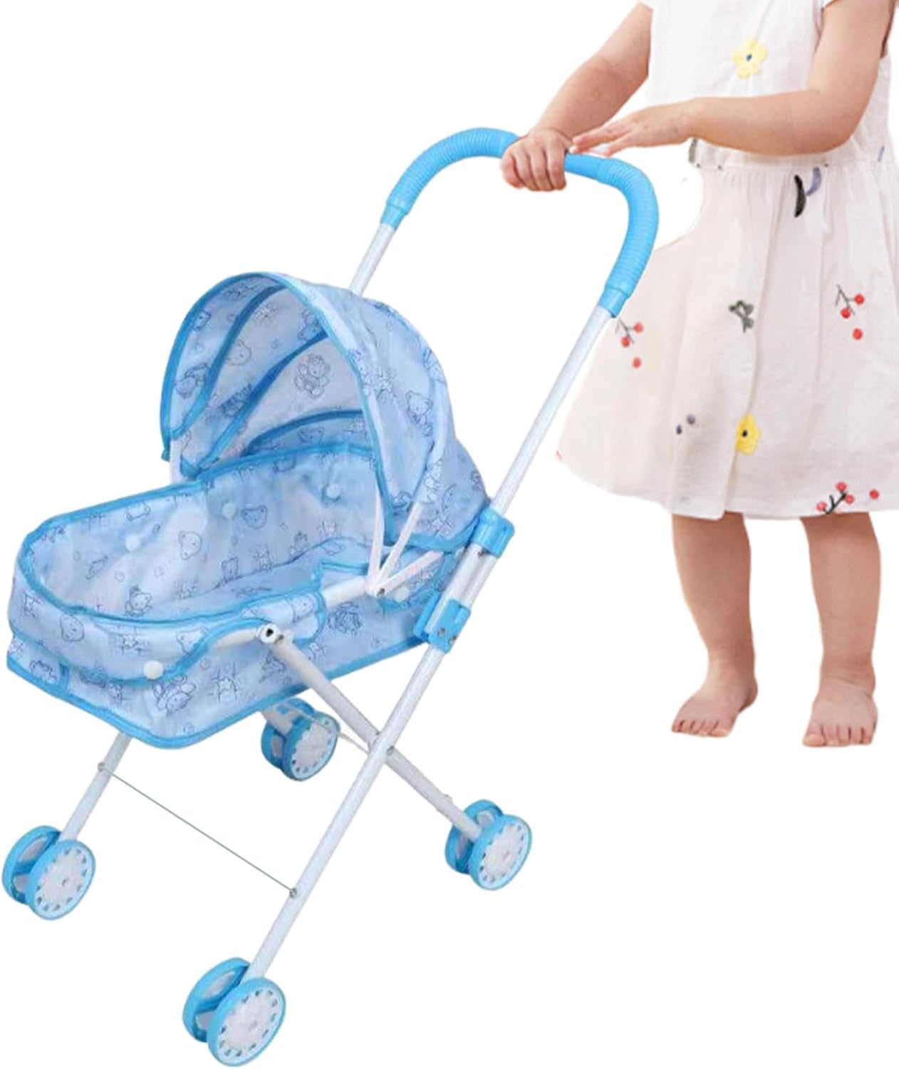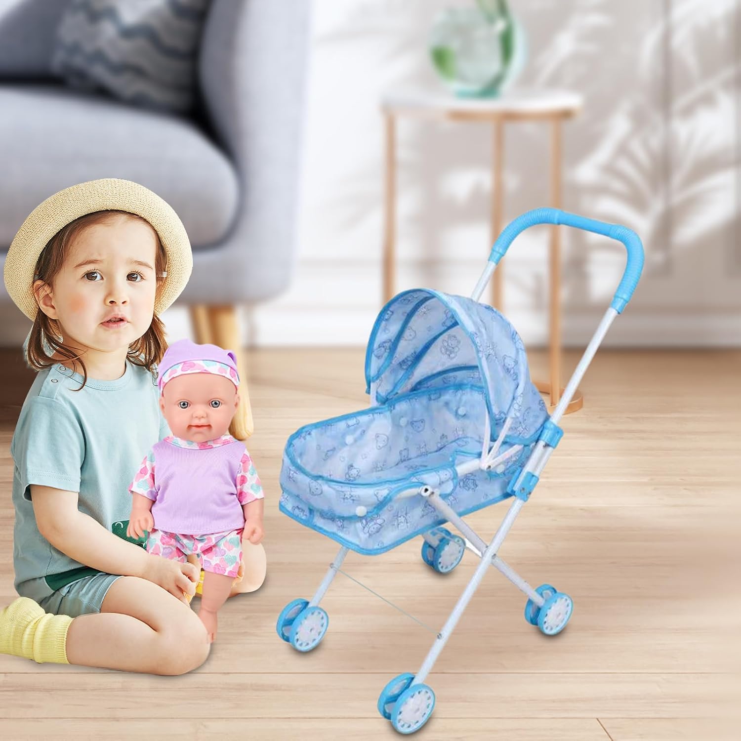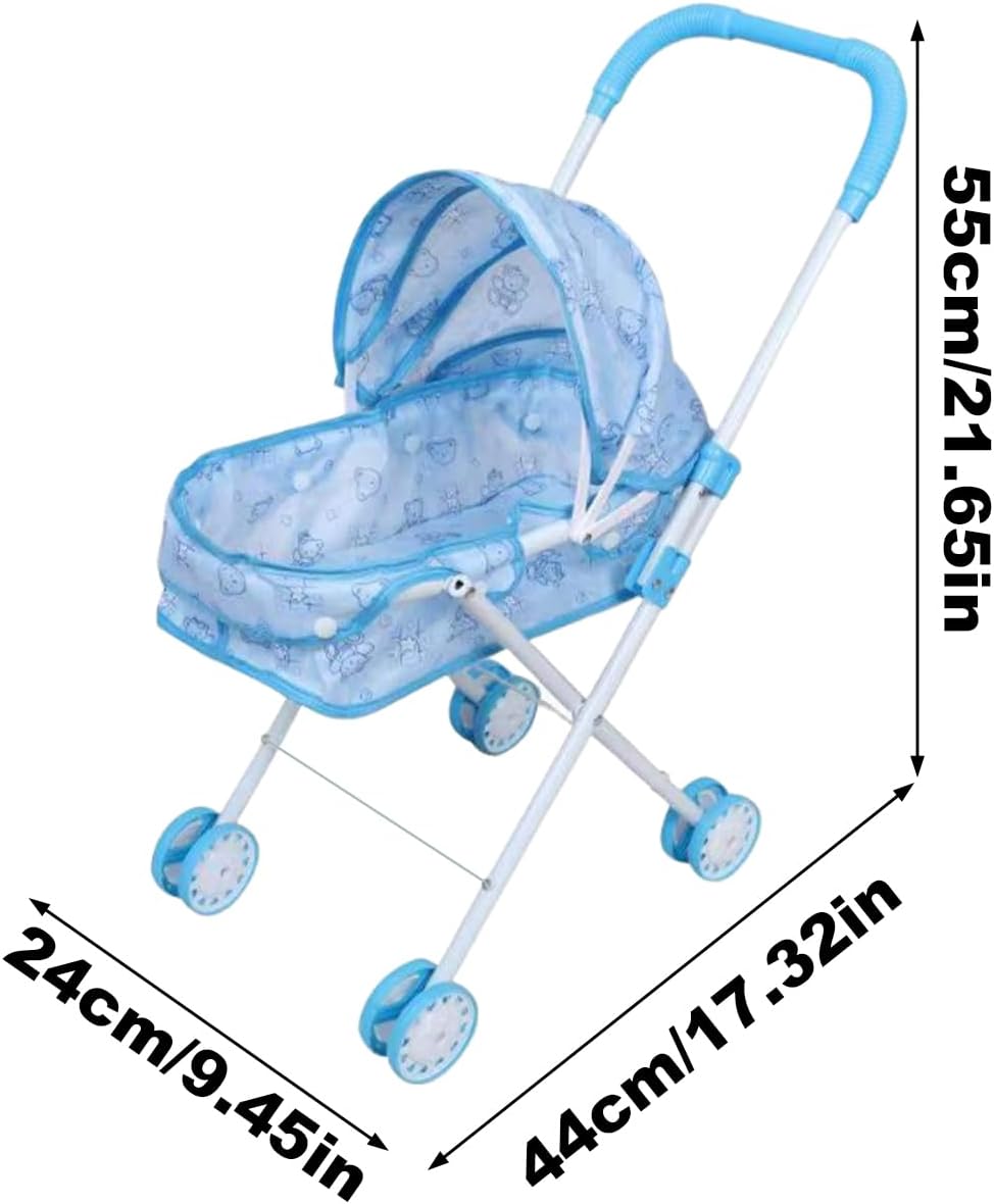 Easy to Carry: This baby stroller for dolls is designed with a space-saving foldable structure, allowing it to be stored neatly in cabinets while promoting an organized play area; its portability ensures effortless transport in car trunks during trips or daily use Caregiving Role Simulation: Designed to nurture empathy and care, the doll stroller allows children to simulate caregiving tasks, improving their understanding of responsibility and compassion within everyday play settings, such as indoor games or outdoor gatherings with other children Versatile Use: With its adaptability to themed events, classroom use, and family bonding moments, the Baby Stroller Toy serves as an excellent addition to birthday gatherings and children's parties, promoting interactive play and fostering shared enjoyment in any celebratory or casual context Excellent Present: Stroller Toy combines functionality with charm, serving as a holiday present for kids that not only entertains but also creates lasting memories, making it a best addition to any celebratory occasion High-quality Material: Designed with a structurally stable framework, this baby doll stroller combines sturdy PP and metal materials to prevent bending or warping, offering consistent performance over time, making it ideal for everyday pretend play scenarios in various environments, like parks or living rooms