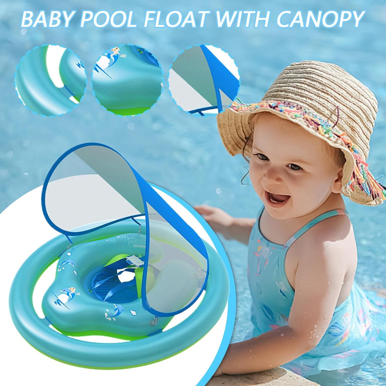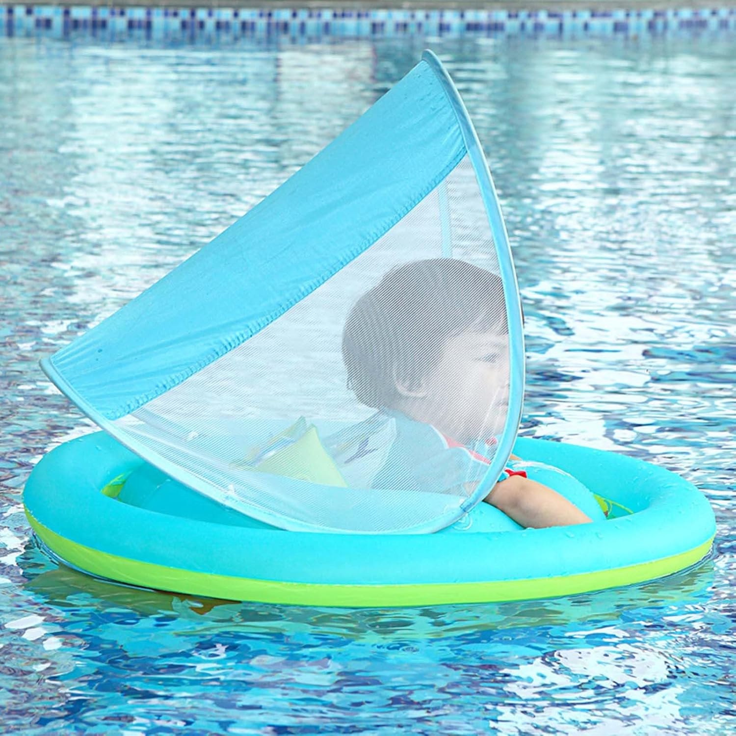 Adjustable Canopy for UV Protection: Features a detachable sunshade canopy to block harmful UV rays keeping your baby protected while floating in the pool bathtub or beach for a comfortable and safe summer swim Safety Seat with Leg Openings: Equipped with a built-in inflatable seat and two leg openings this baby float secure upright seating so can enjoy splashing and kicking while being safely supported in the water Bright Design Encourages Water Play: The colorful and cute design attracts little swimmers boosting their confidence and interest in water activities during beach outings backyard fun or travel adventures Easy to Inflate and Deflate: This float inflates quickly with any standard pump and deflates easily for compact storage and portability making it ideal for on-the-go families traveling with in summer Durable and Leak-Resistant Material: Made from thick high-quality PVC that withstands active play this baby float resists punctures and leaks to provide worry-free water fun throughout the swimming season