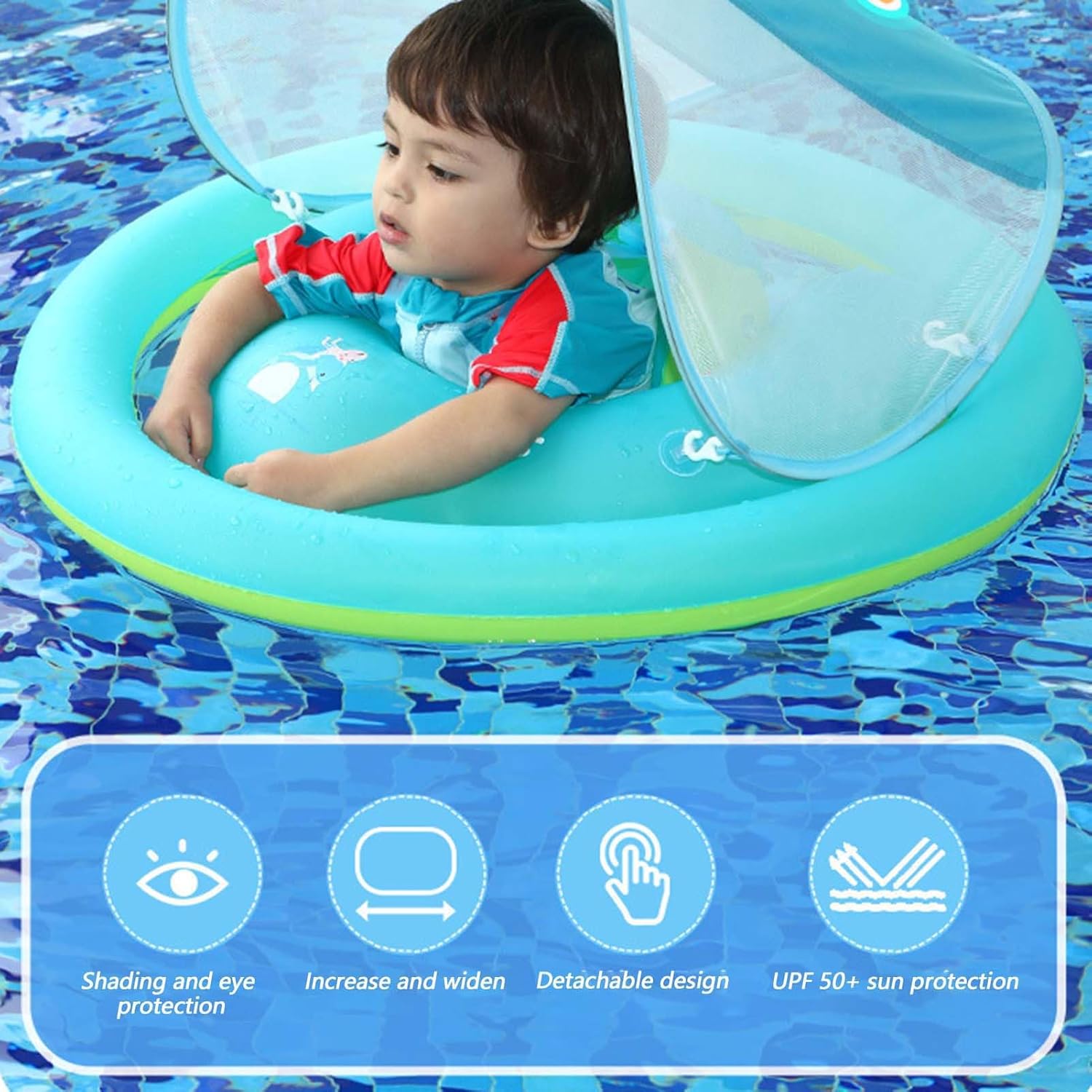 Inflatable baby pool float designed with a protective canopy to shield Toddler from harmful UV rays, ensuring safe and comfortable water play in pools, bathtubs, or outdoor settings Adjustable safety seat with secure leg openings keeps babies safely positioned while allowing freedom of movement for kicking and splashing Made from durable, materials that are gentle on sensitive baby skin and built to withstand regular use during summer outings and travel Lightweight and portable design makes it easy to inflate, deflate, and carry for beach trips, pool parties, or family vacations Bright, engaging colors and fun design attract babies' attention, promoting early water familiarity and enjoyable aquatic experiences