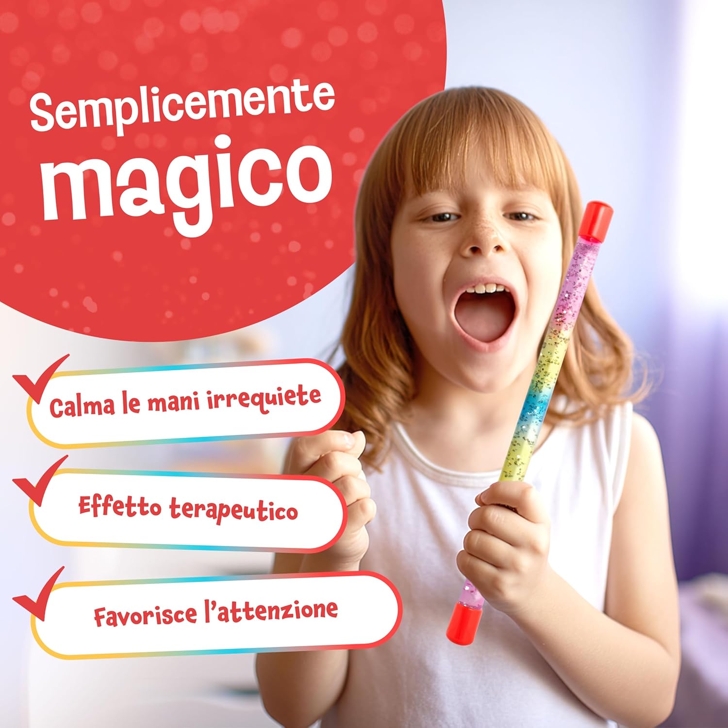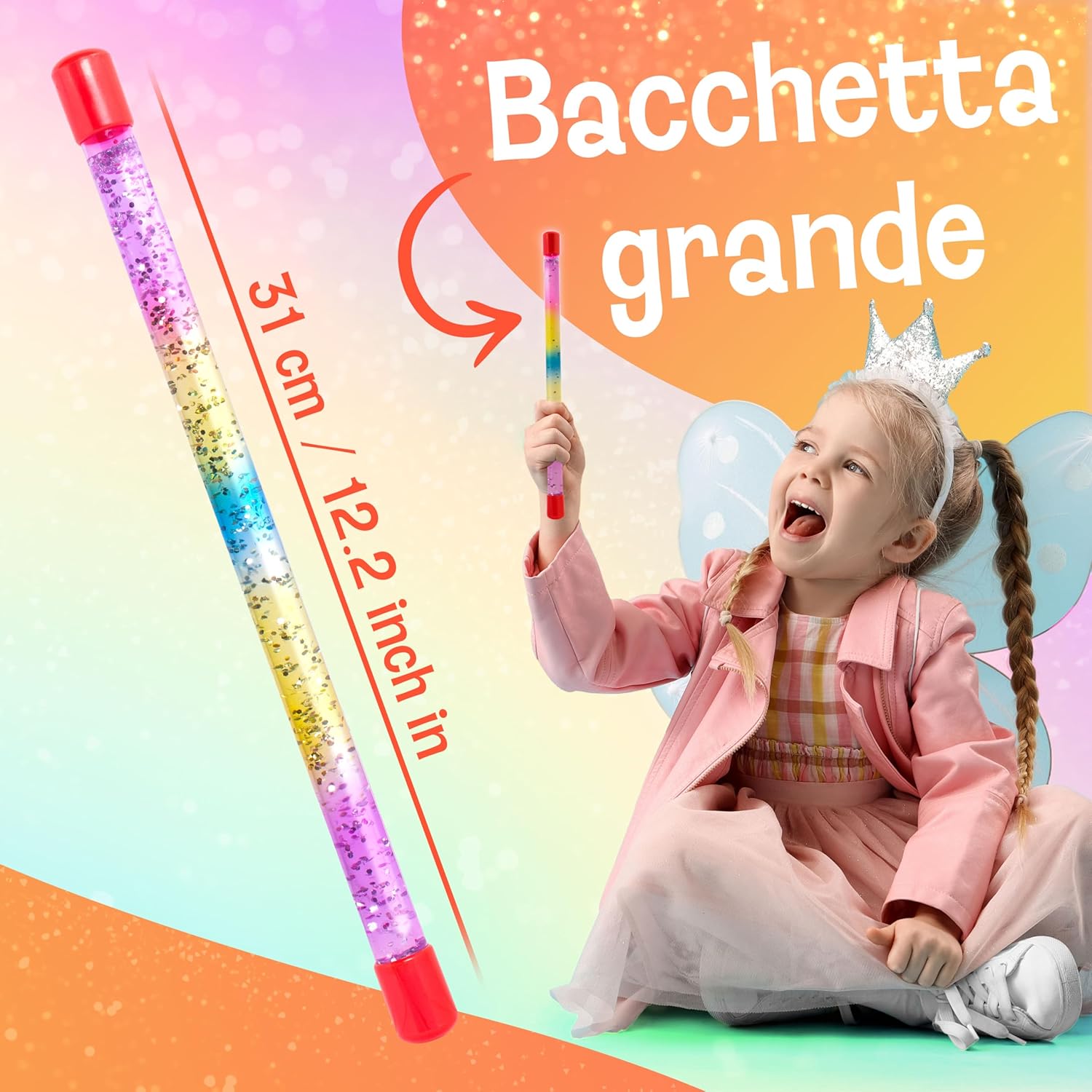 ✨ Adatto a molte occasioni: questa bacchetta scintillante è perfetta come gadget compleanno bambini, a carnevale, Halloween o il primo giorno di scuola e dona a ogni evento un’atmosfera magica speciale. 🎉 Dettaglio originale per la festa: che sia in sacchetti regalo, come regali compleanno o come piccolo giochi bambini, questa bacchetta fatata porta gioia e momenti indimenticabili. 🎭 Perfetta per ogni costume bambini: accessorio ideale per travestimenti fantasiosi come sirena, strega, mago o unicorno, che completa l’outfit con un tocco di magia. 🌀 Uso versatile: come giocattolo sensoriale, giocattolo da viaggio creativo o accessorio rilassante. I brillantini nel liquido creano un effetto magico, affascinano e invitano alla calma. 💫 Pratica e sicura: scettro di 31 cm in plastica resistente con liquido atossico, ideale per la scuola, come decorazioni festa o come piccolo extra magico per giochi di fantasia.
