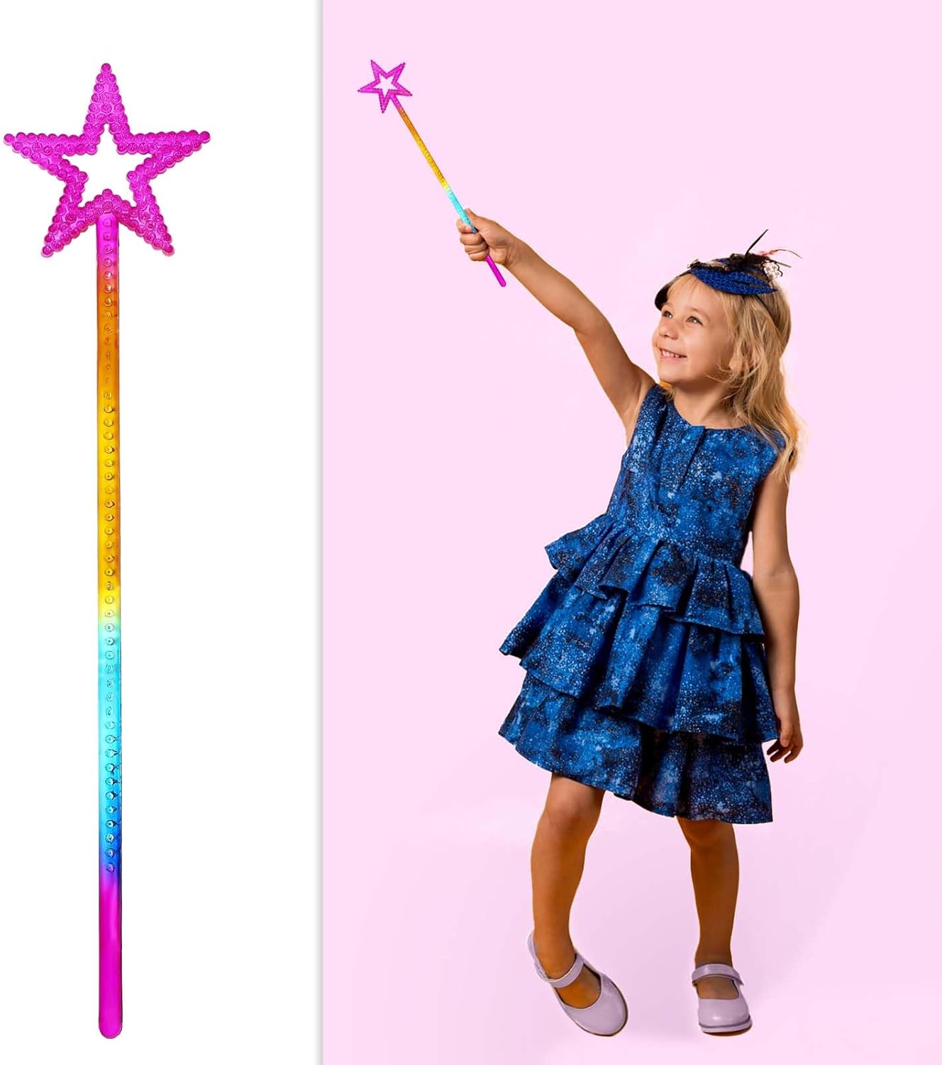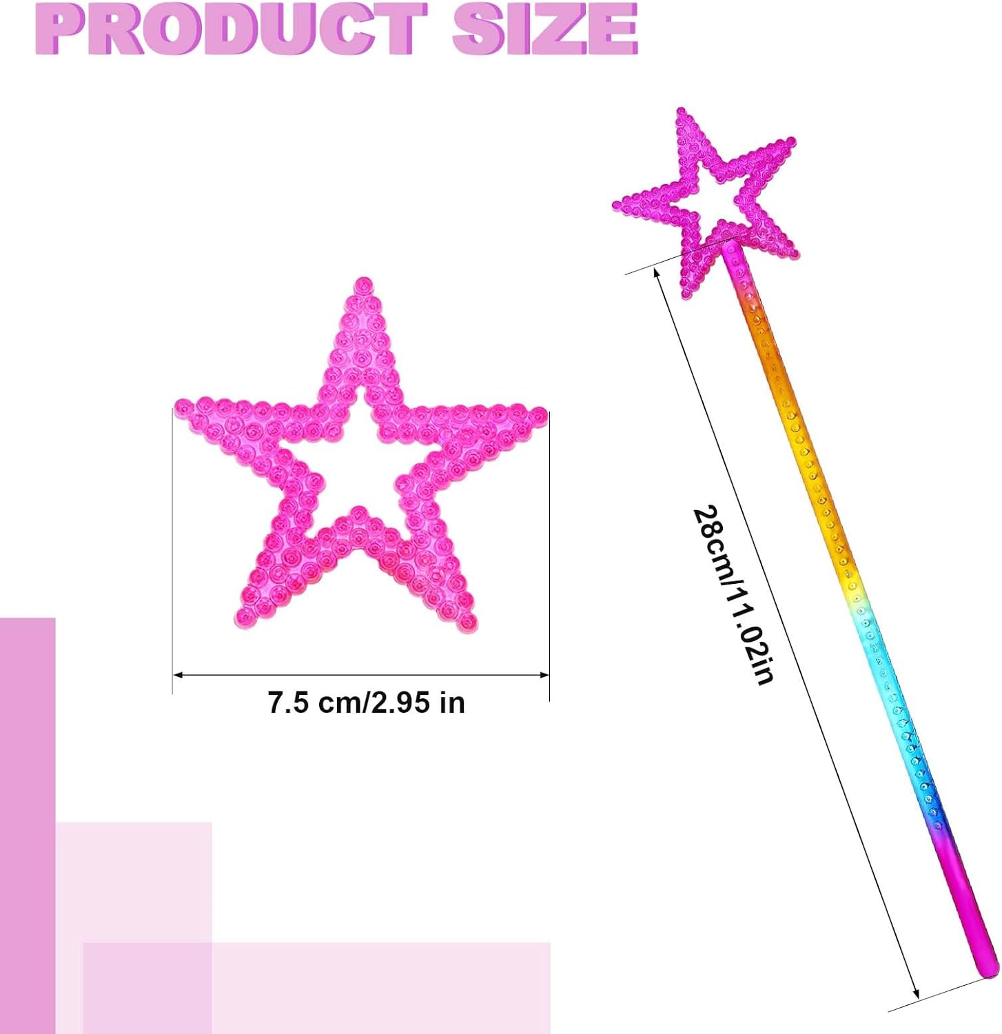 【Attenzione】 La nostra bacchetta magica da principessa è progettata in stile stellato, le paillettes scintillanti brillano alla luce, i colori vivaci e lo stile squisito, fanno sembrare la tua bambina una bellissima principessa. 【Misura adatta】 La lunghezza dell'asta della stella è di circa 28 cm e il diametro della stella è di circa 7,5 pollici, è facile e comodo da tenere per i bambini, è un regalo ideale per i bambini. 【Bellissime bacchette magiche】: la bacchetta magica della principessa ha bellissime perle sulla superficie della stella. Presenta un effetto scintillante sotto la luce. Porta un'esperienza magica più reale ai bambini. Tua figlia sarà felice di essere una piccola principessa. 【Materiale di qualità】: l'asta a stella è realizzata in plastica ABS con scanalature lucide per un aspetto scintillante e bello. Tutti gli accessori sono sicuri per il compleanno o il tea party della piccola principessa. 【Scenari applicabili】: bacchette magiche per bambini per spettacoli di magia, Natale, cosplay, feste in costume, feste di compleanno, battesimo di bambini, matrimoni, battesimo di nozze e così via. Queste bacchette magiche per bambini possono aiutarti a trasformare una bambina nella sua principessa preferita.