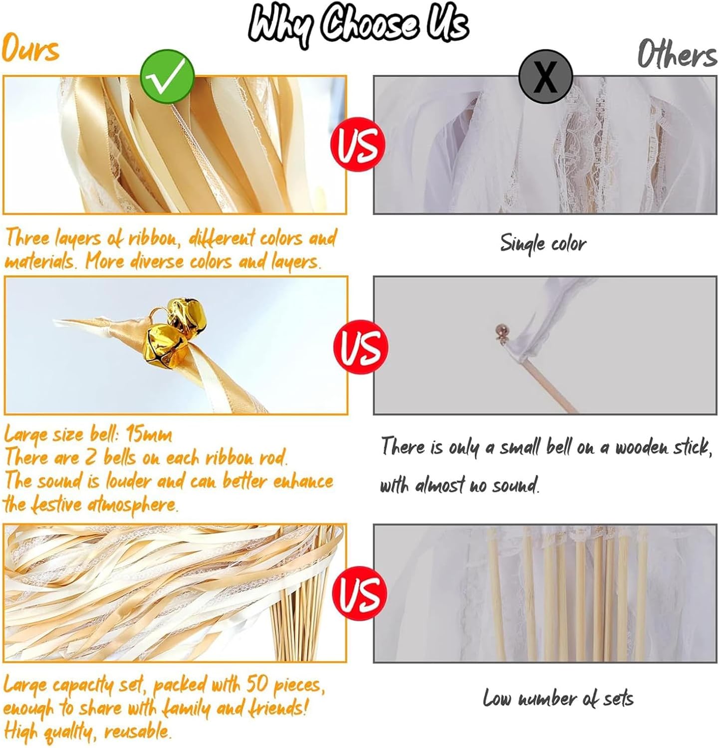 Portabilità pratica: L'ergonomia studiata rende queste bacchette eccezionalmente facili da spostare. Sempre pronte per abbellire i tuoi momenti di festa, il loro design intelligente massimizza la comodità di utilizzo quotidiano. Versatilità per eventi, perfette per feste, attività scolastiche, spettacoli e matrimoni, queste bacchette aggiungono fascino a qualsiasi evento. Il design elegante garantisce una grande versatilità e contribuisce a creare esperienze memorabili per molteplici occasioni. Atmosfera Festiva: le bacchette da sposa animano le celebrazioni con un'atmosfera romantica e, perfette per essere abbinate a nastri per elevare naturalmente l'eleganza della vostra cerimonia e ricevimento. Tintement Festif: il delicato suono della campana amplifica naturalmente i momenti delle celebrazioni, creando senza sforzo ricordi felici a feste ed eventi speciali. Materiale Premium: realizzate con materiali di alta qualità, queste bacchette offrono una durata perfetta e una lunga durata, resistenti ad un uso intensivo mantenendo le prestazioni ottimali in ogni cerimonia di matrimonio