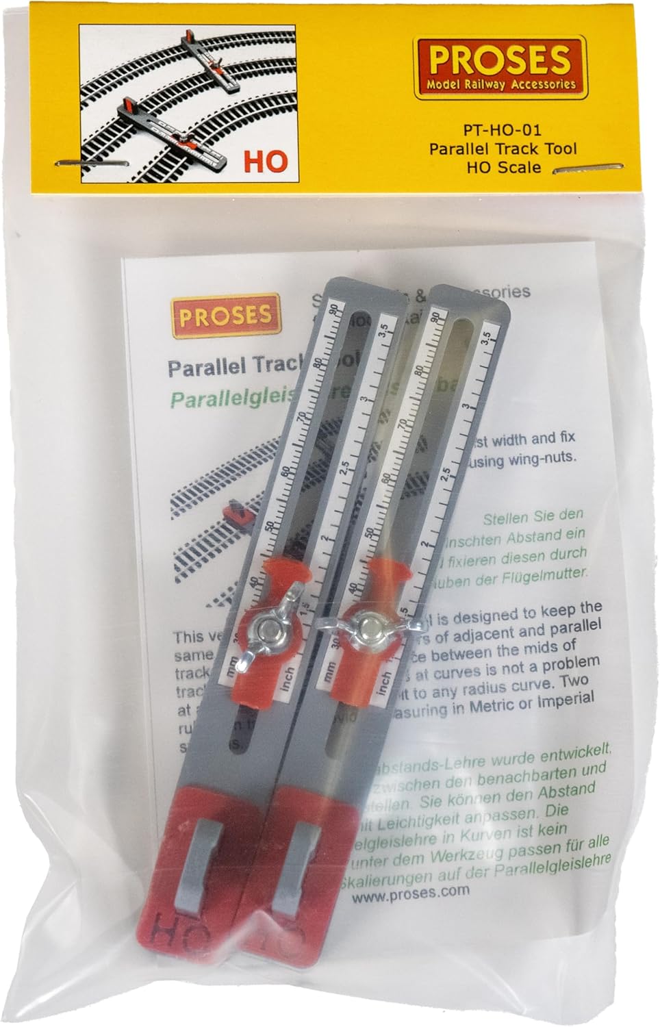 Pratico strumento che è stato progettato per mantenere la stessa distanza tra i centri di binario adiacenti e parallelo Uso sia con dritto e curvo Track righelli sugli strumenti di misura in millimetri e pollici Due per confezione HO Scale 1: 87