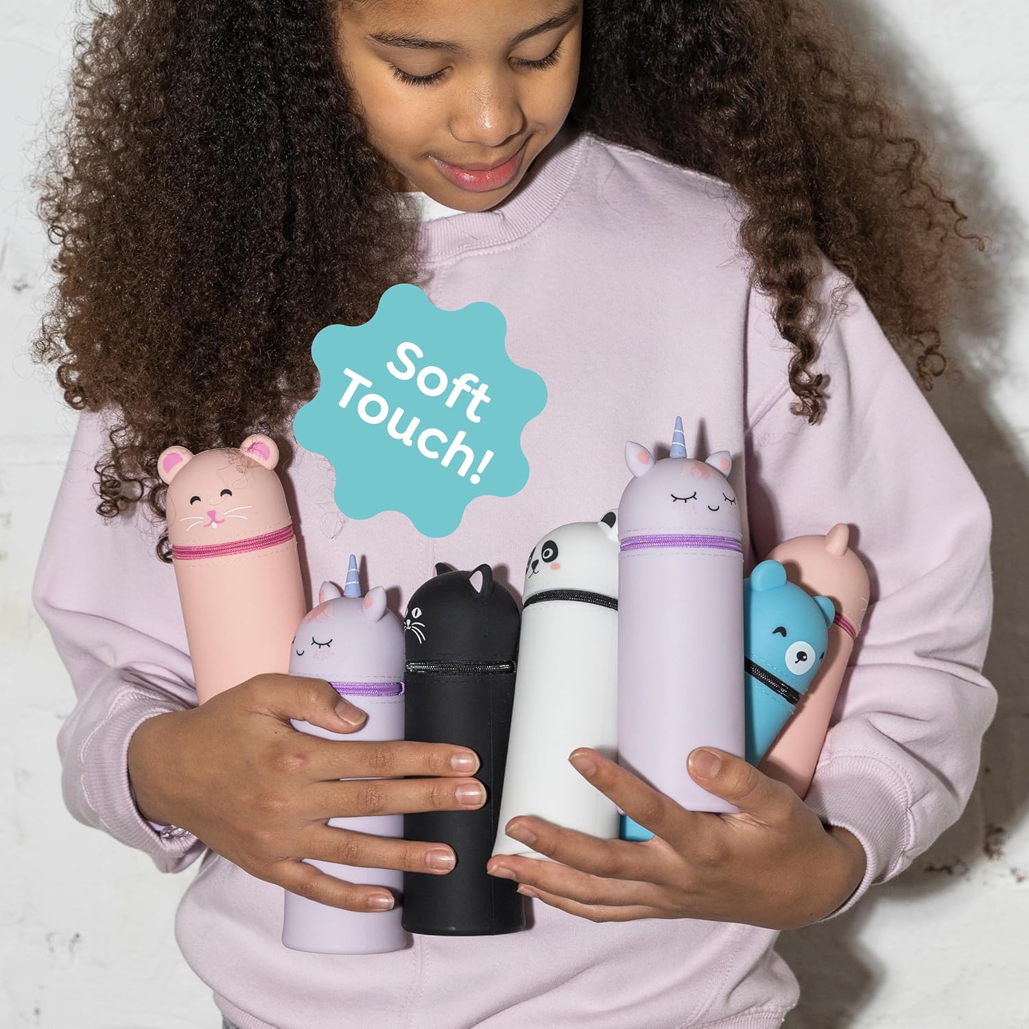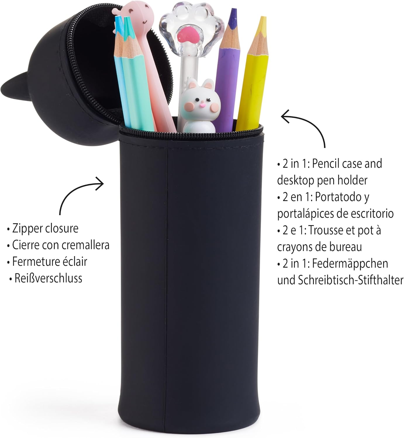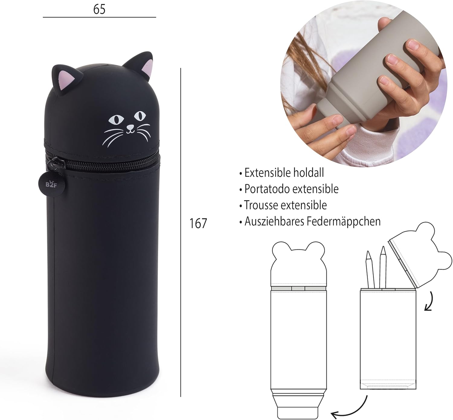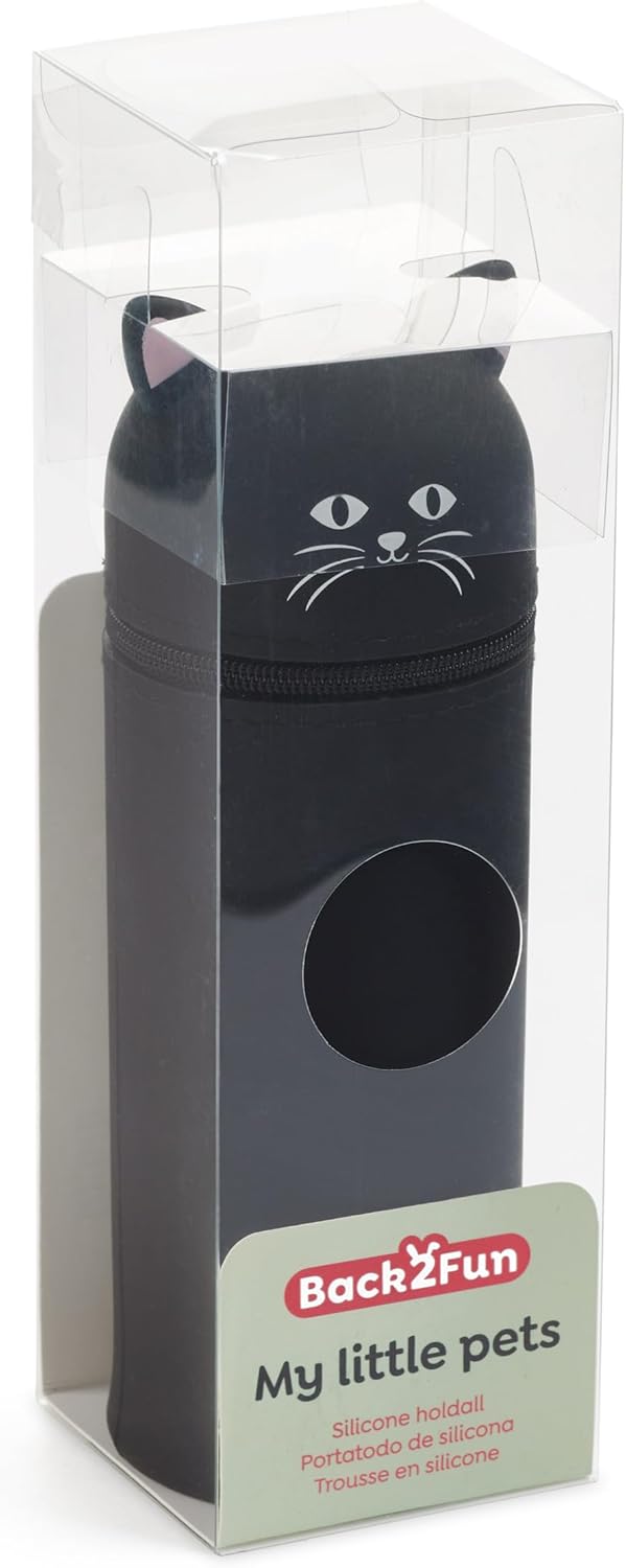 🐱 ASTUCCIO 2 IN 1 🐱 con un solo scomparto e interno capiente. Si trasforma in portapenne da tavolo. 🐱 FORMATO ESTENSIBILE 🐱 misura 63 x 167 x 63 mm. Ideale per scuola, make-up o piccoli oggetti. 🐱 SILICONE MORBIDO 🐱 astuccio flessibile e resistente a urti e pieghe. Superficie liscia color grigio. 🐱 USO SCOLASTICO 🐱 leggero e comodo da portare in zaino o borsa. Perfetto per l’uso quotidiano. 🐱 DESIGN GATTO BACK2FUN 🐱 con zip coordinata e custodia trasparente. Regalo originale e divertente.