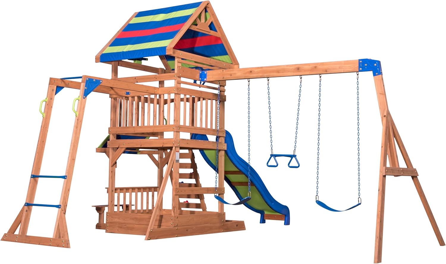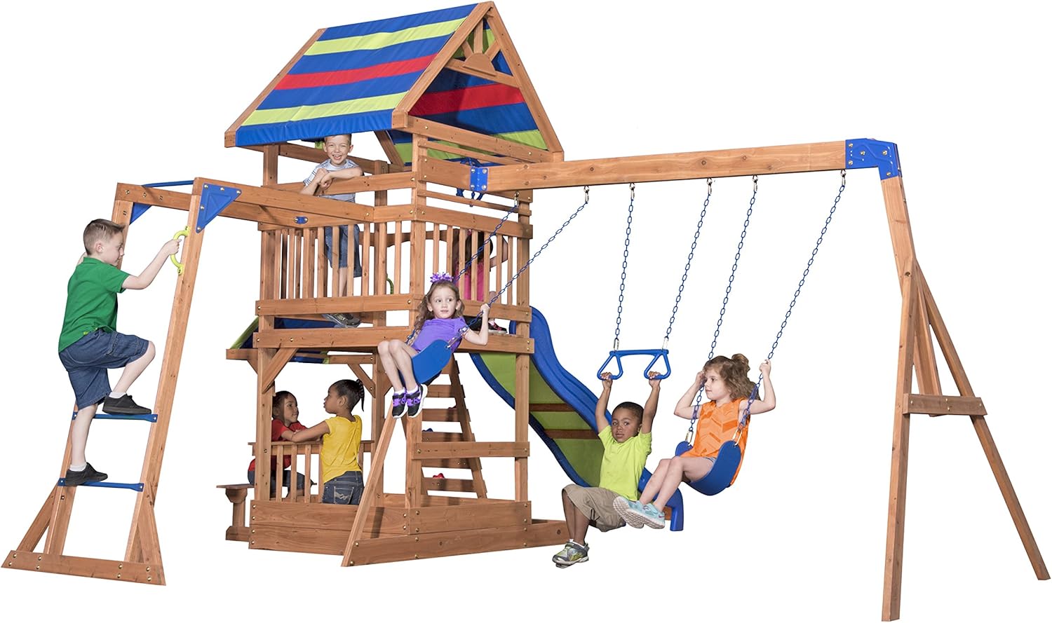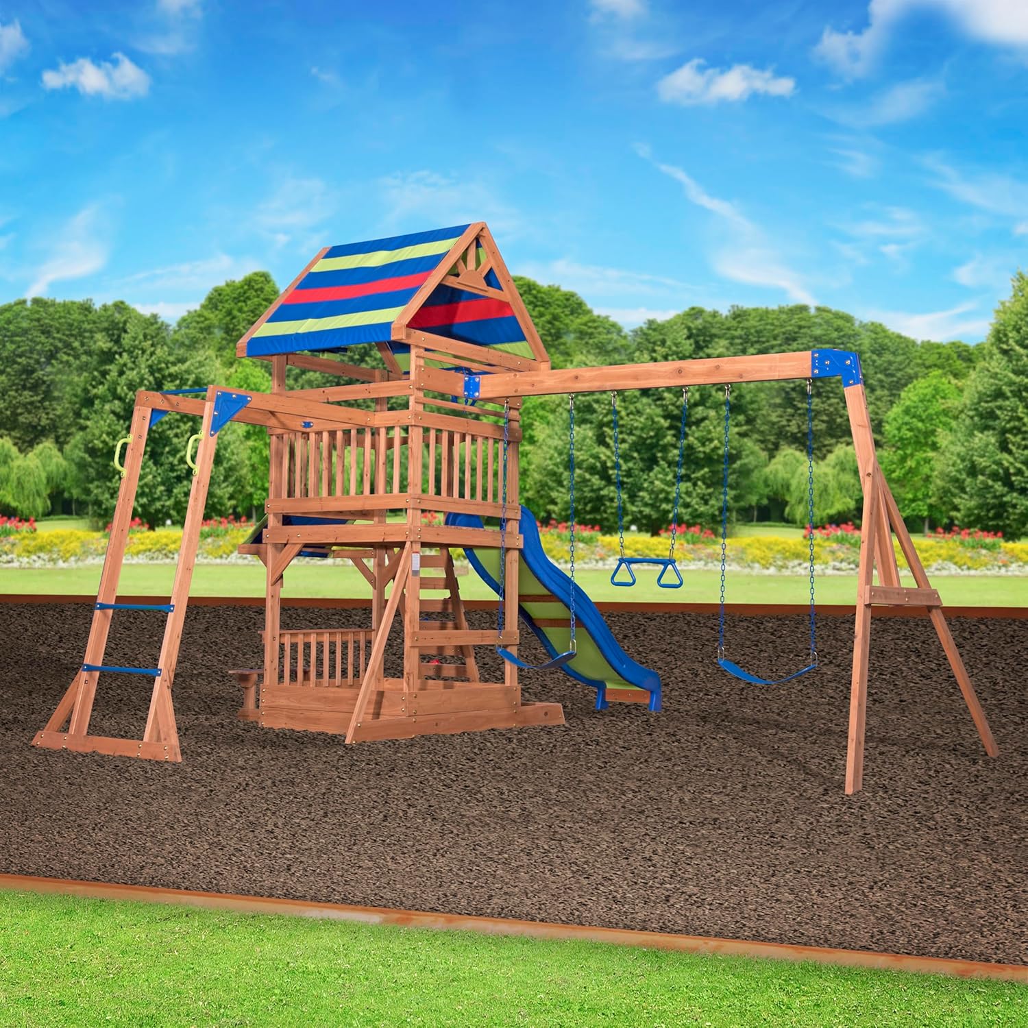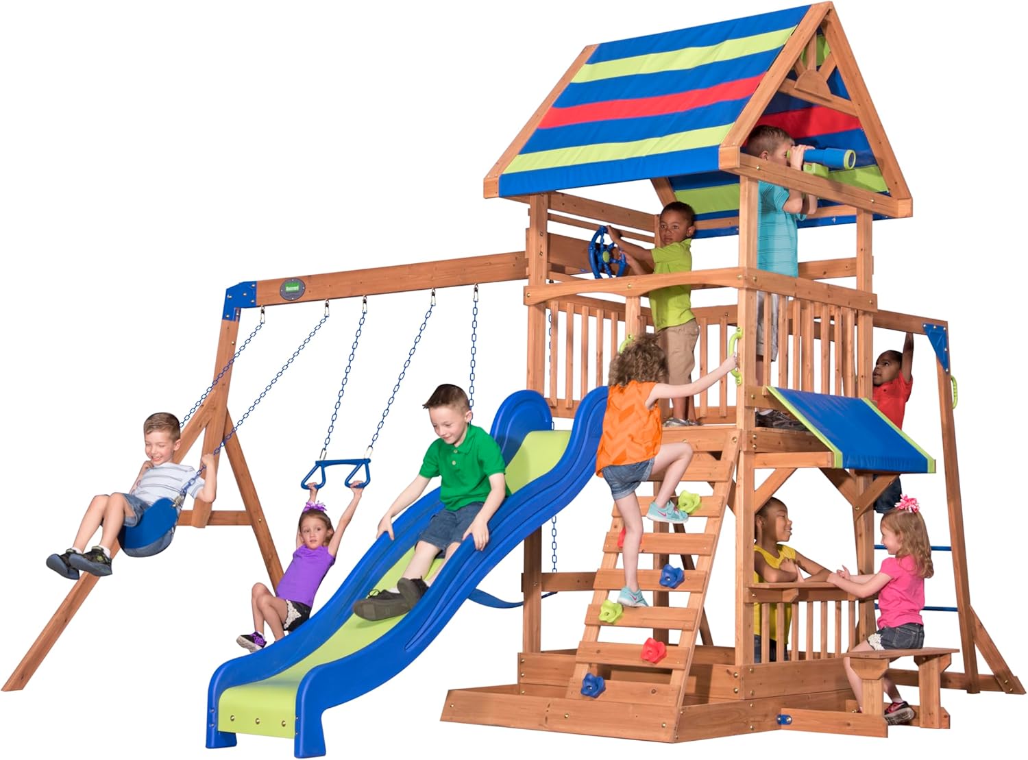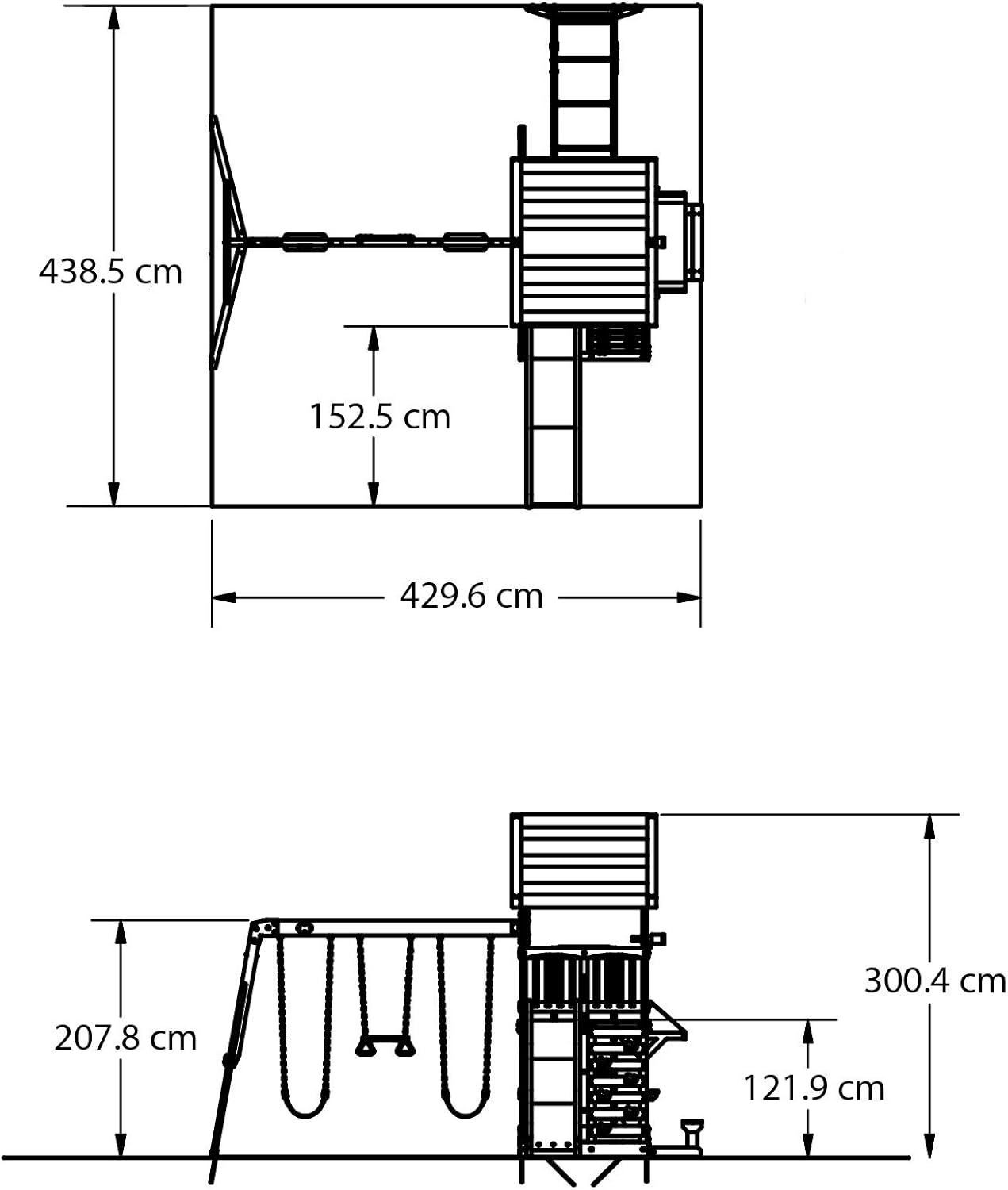 DIVERTIMENTO GIOCABILE GARANTITO: Northbrook è un parco giochi che tutta la banda amerà! L'adorabile casa su palafitte con scivolo a onde, sabbiera, scala di arrampicata, 2 classiche altalene con imbracatura e barra trapezio combina il comfort di casa con un divertimento senza fine. In questa casetta a due piani, i bambini possono costruire castelli di sabbia, dondolarsi o scivolare lungo lo scivolo di 244 cm. ALTA QUALITÀ: Il nostre parco giochi è fatta di legno di cedro di alta qualità, pre-trattato. Il legno durevole è resistente alle intemperie e molto resistente alla putrefazione del legno. Tutte le parti in legno sono segate a misura e sono dotate di numeri di parte per garantire un montaggio sicuro e perfetto. GIOCO SICURO: Il robusto palo dell'altalena è dotato di staffe in acciaio in modo che i vostri bambini possano sempre oscillare in sicurezza. Il parco giochi è adatta a bambini tra i 3 e i 1 anni ed è stata sviluppata secondo i requisiti della norma DIN EN 71. Fino a 9 bambini possono giocare in sicurezza nella e sulla torre di gioco allo stesso tempo. DIMENSIONI: Il nostre parco giochi Northbrook offre molte opzioni di gioco in un piccolo spazio. La casa per bambini è quindi ideale anche per i piccoli giardini. Dimensioni (LxWxH): 439 x 43 x 3 cm. Altezza della piattaforma: 122 cm. Carico massimo: 15 kg. Lunghezza del scivolo: 244 cm. BACKYARD DISCOVERY: Backyard Discovery è il numero 1 per le torri da gioco in legno, i set di altalene e i telai da arrampicata. Backyard Discovery collega migliaia di famiglie ogni anno con costellazioni di legno progettate con amore. I bambini possono fare esercizio, giocare e creare all'aria aperta con le nostre casette e torri di gioco. Crea ricordi meravigliosi proprio nel tuo cortile con Backyard Discovery!