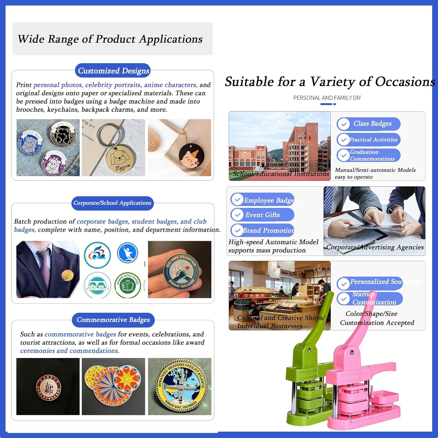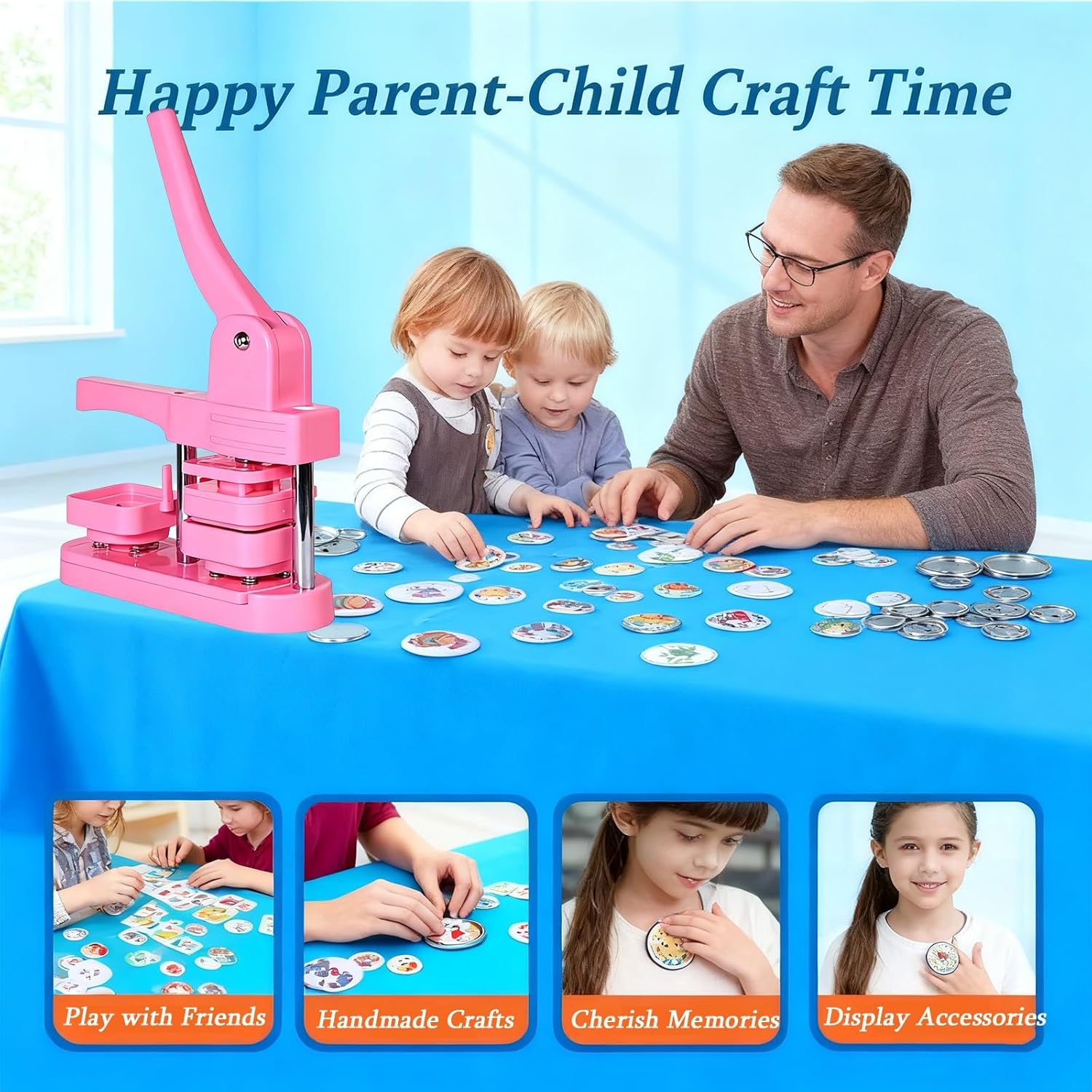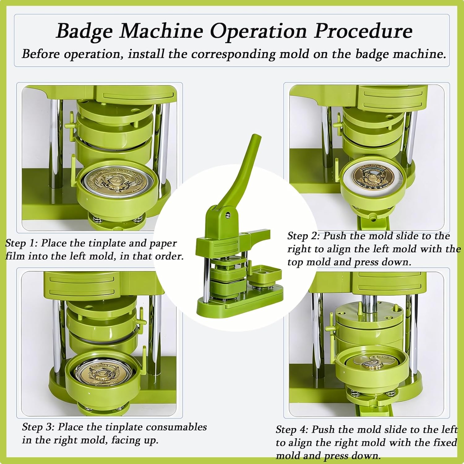 Button Badge Maker aderendo al concetto di design semplice, funziona in modo fluido ed efficiente. Badge Punch Press Il manico ergonomico offre una presa comoda. Magneti da frigorifero fai da te: crea magneti da frigorifero unici utilizzando foto e ricordi. Un set perfettamente progettato per i bambini, che aiuta a sviluppare le loro capacità motorie. Adatto come regalo di festa, come per Capodanno e festa dei bambini. Distintivo che fa macchina Spezifikationen: Nome del prodotto: Pin Badge Maker Materiale: ABS di alta qualità. Dimensioni: 28 x 16 x 52 cm. Set completo (pulsante Maker Press) 1 macchina (50 mm x 50 mm). Macchina per badge quadrata - Non staccabile 100 coperture in ferro. 100 fogli di base rivestiti di ghiaccio. 100 fogli di pellicola. 100 magneti morbidi. 100 fogli di carta. 1 disco da taglio. 1 chiave inglese. Nota: Il contenuto varia a seconda del set